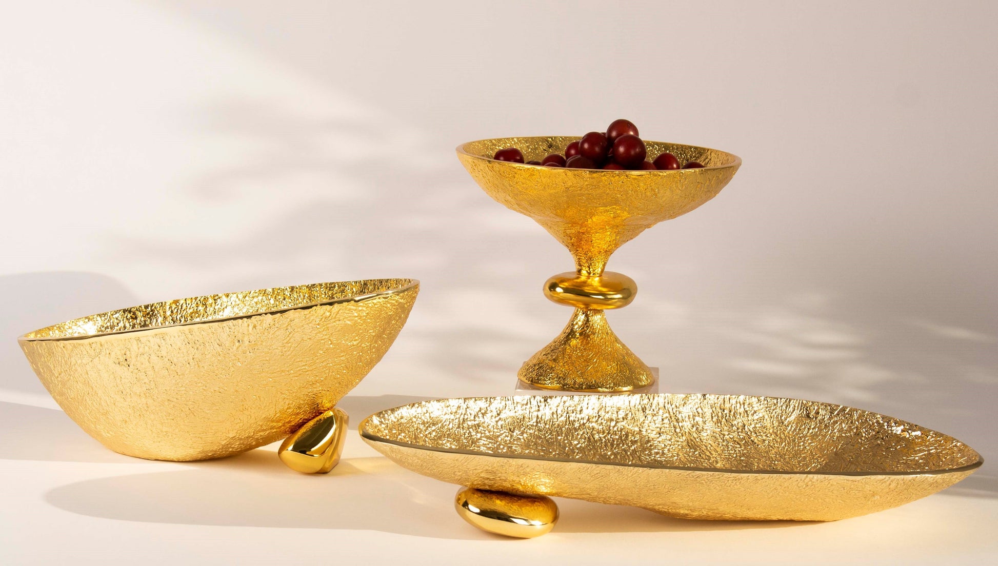 An asymmetrical nest like textured bowl, resting on a polished gold rock. Original and decadent design ,handcrafted by artisans, this glamorous and bold design is a one of a kind centerpiece .Use to serve candy or nuts or simply as a decorative accent. Each of our creations is designed in our San Francisco studio. Master craftsmen using centuries old technique of sand casting create the original mould and skilled artisans hand create every piece, with pride, in our family owned factory. Details Dimensions : 20" L; 3" H; 9.75" W; Finish : Gold, Silver Material : Aluminum Use and Care Given its handmade and hand-finished nature, variations in the piece are to be expected and celebrated. No two pieces are exactly alike. Food Safe Hand wash with mild soap, water, and towel dry. Do not use abrasives or chemicals to clean as the metal may scratch and discolor. Not dishwasher safe
