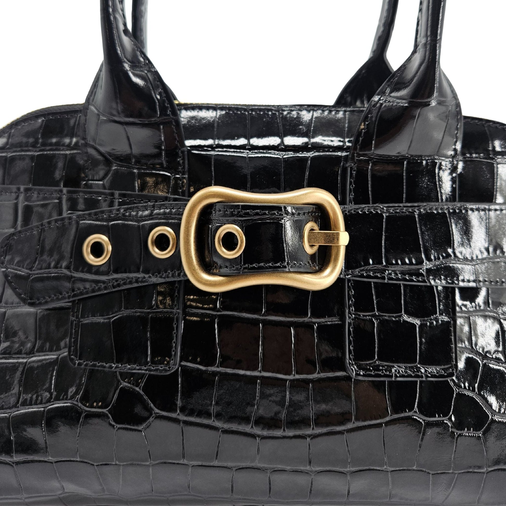 Elevate your everyday style with The Niky Polished Black Top-Handle Satchel. This isn't just a bag; it's a statement of refined elegance. Crafted in Italy from lustrous, pressed leather to give a distinctive crocodile-skin texture, The Niky boasts a sleek and structured silhouette that's perfect for the modern individual on the go.