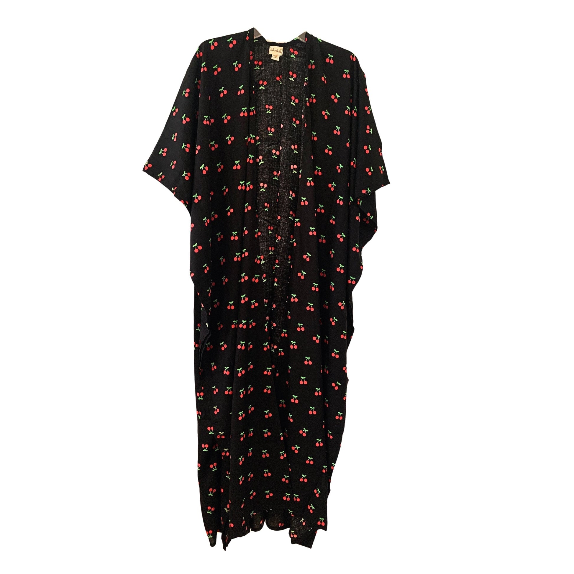 Bring out the fun day with this maxi long length kimono, featuring a bright cherry pattern for the ultimate stand-out piece and a perfect piece to throw on for lounging by the pool or over swimsuit to give an aura of effortless luxury. Come with a matching belt that help you easily change to different looks throughout the day. We created garments that are meant to last season after season. Each garment is carefully tailored made by our small team of women artisans in Bali from the comfort of their own homes. Our model is 5’9“ Size S and is wearing One Size. Lay flat measurement: Shoulder to hem 50”. Come with a matching belt. Handwash cold. Lay flat to dry. 100% Rayon. Handmade with love. Shipping & Returns: Return accepted for store credit only. Please see our Shipping & Returns page for more details.