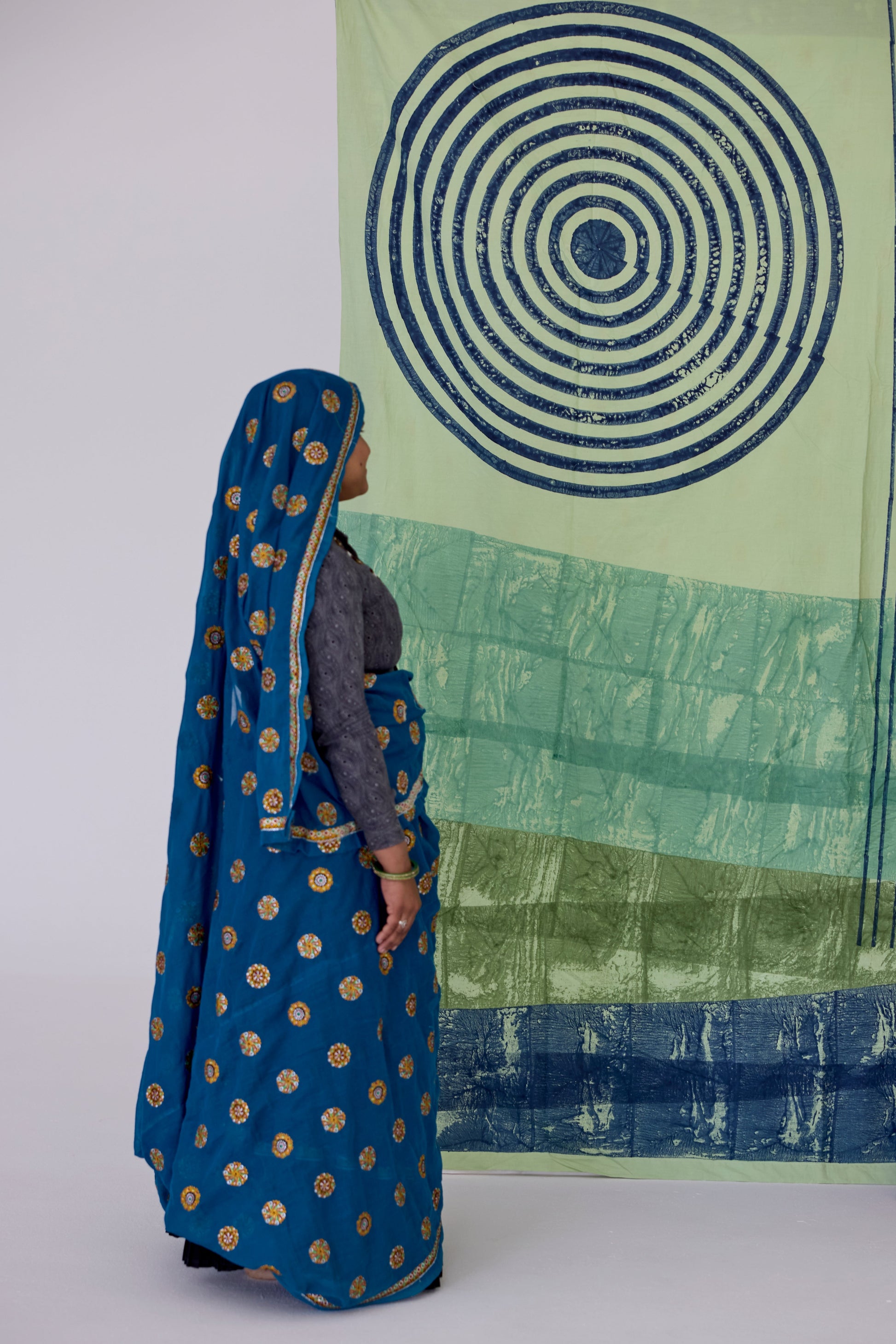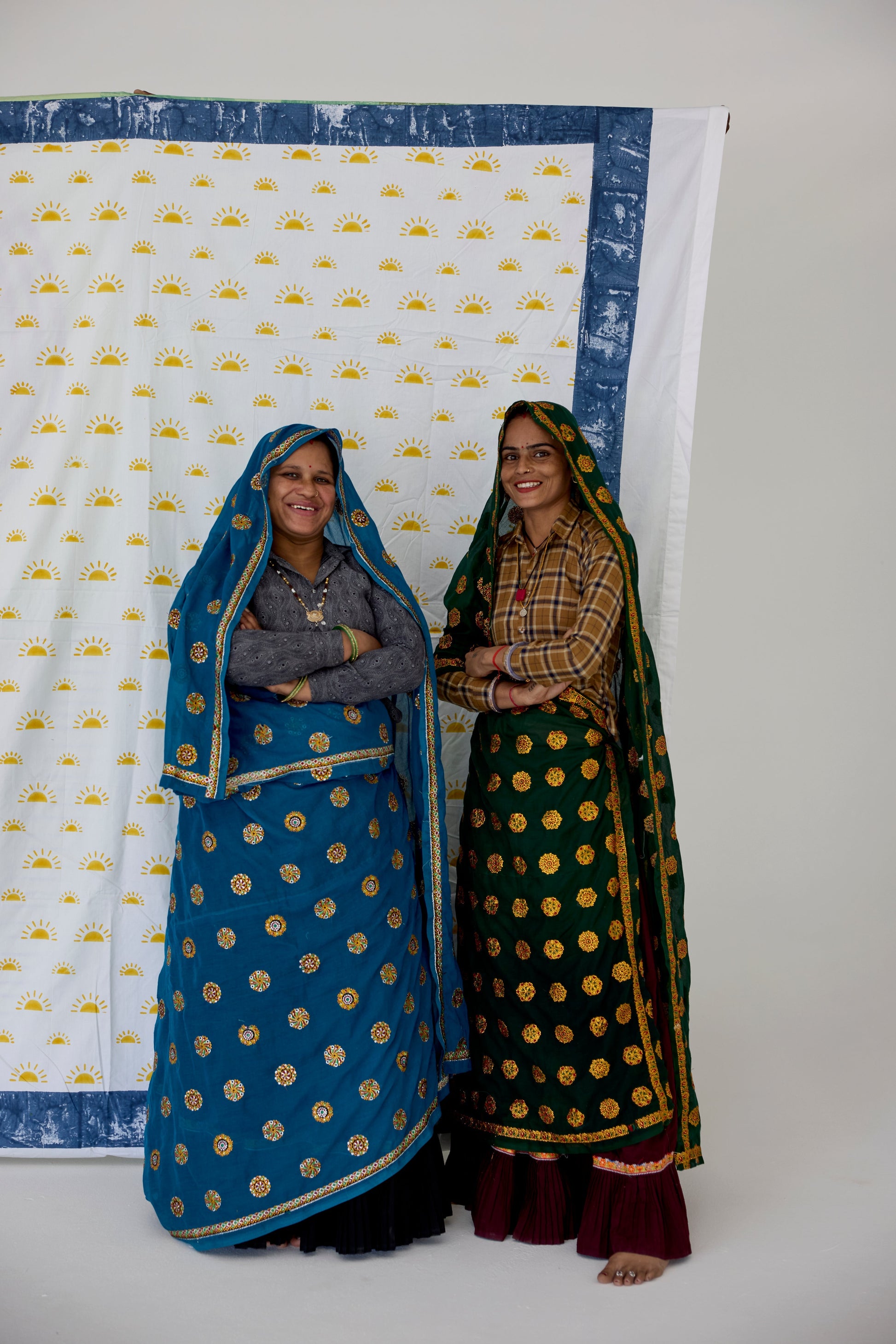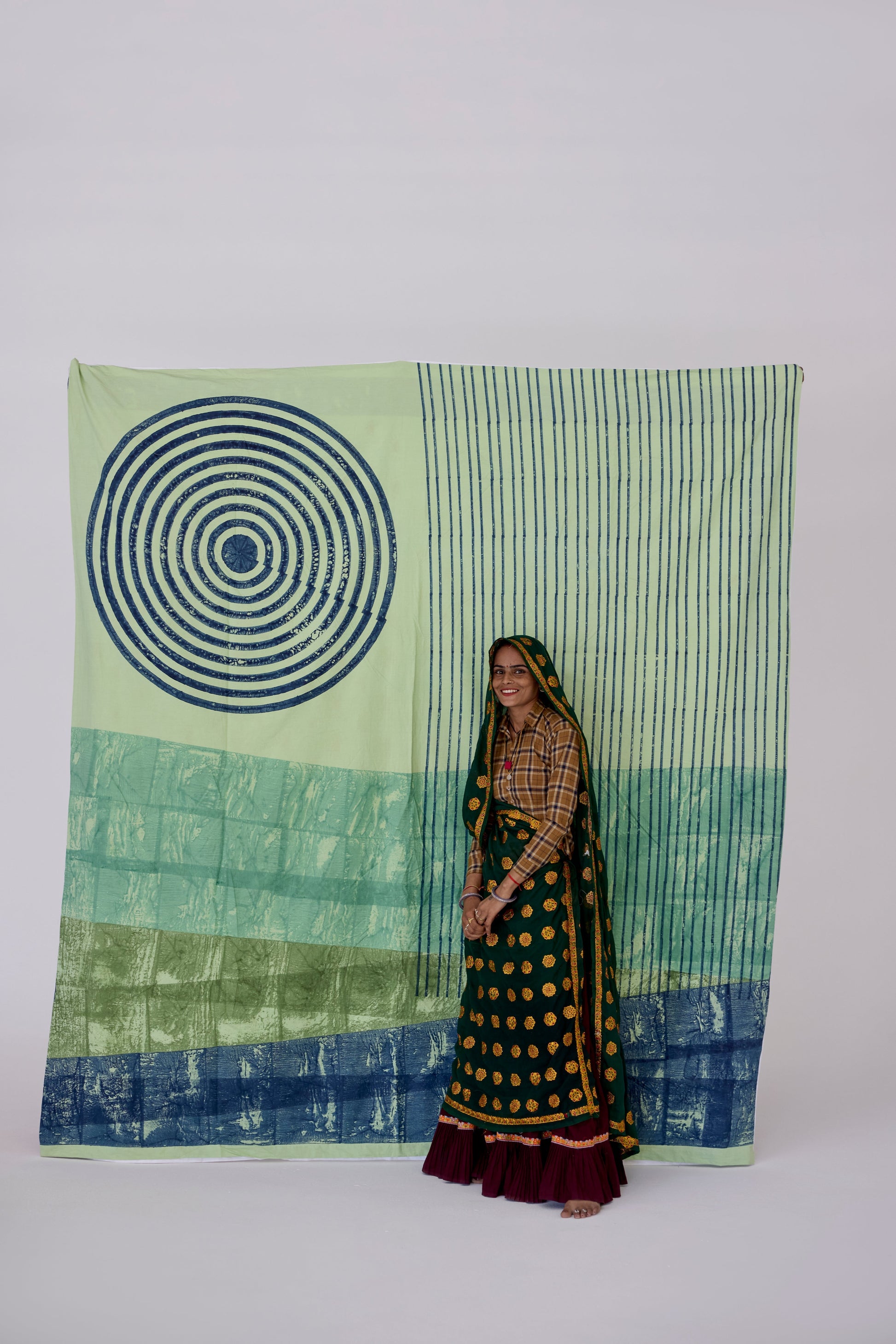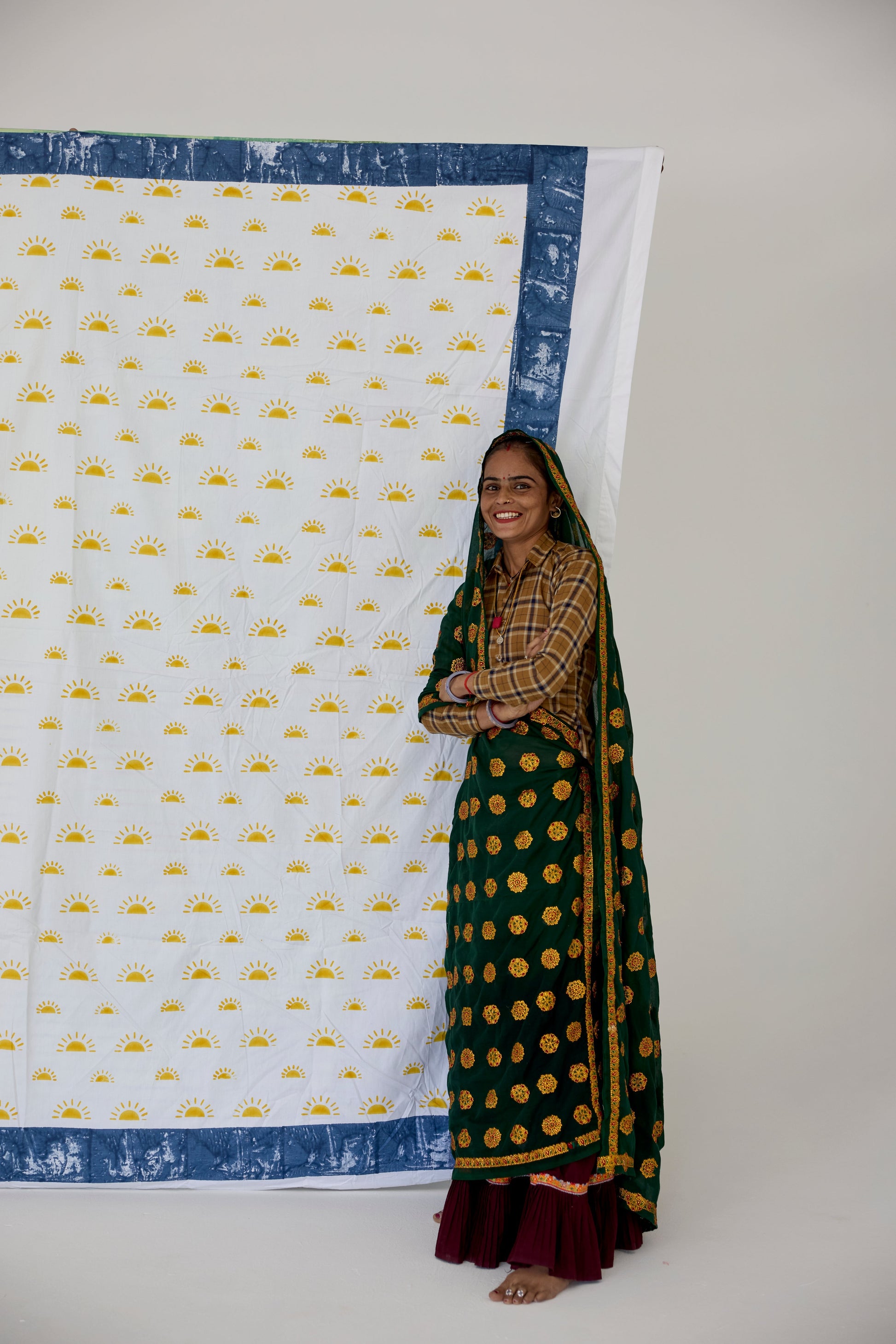 Our stunning Ojai reversible duvet cover is hand-block printed and crafted from 100% cotton. One side showcases a striking geometric design in calming shades of green and blue. The reverse side features a playful yet elegant sun motif in warm yellow against a crisp white background, framed by a deep indigo border. Each duvet cover is handmade, requiring attention from multiple artisans, including wood-block carvers, printers, and dye specialists. The design is hand-pressed onto each duvet using hand-carved wooden blocks dipped in dyes. Our duvet covers are made in small batches. Due to the handcrafted nature of this item, expect slight variations in the appearance of each unique piece. - 100% Cotton - Button Closure - Reversible Design - Handmade in India - Ships from California - Queen Size: 92″ x 96″ | King Size: 96″ x 104″ | Shams Size: 26" x 26" - Machine wash on a gentle cycle and tumble dry or dry clean