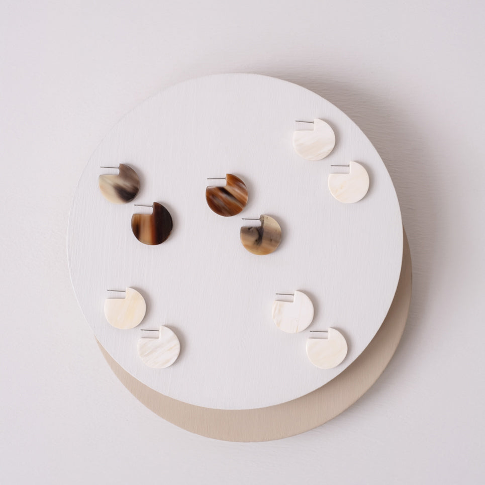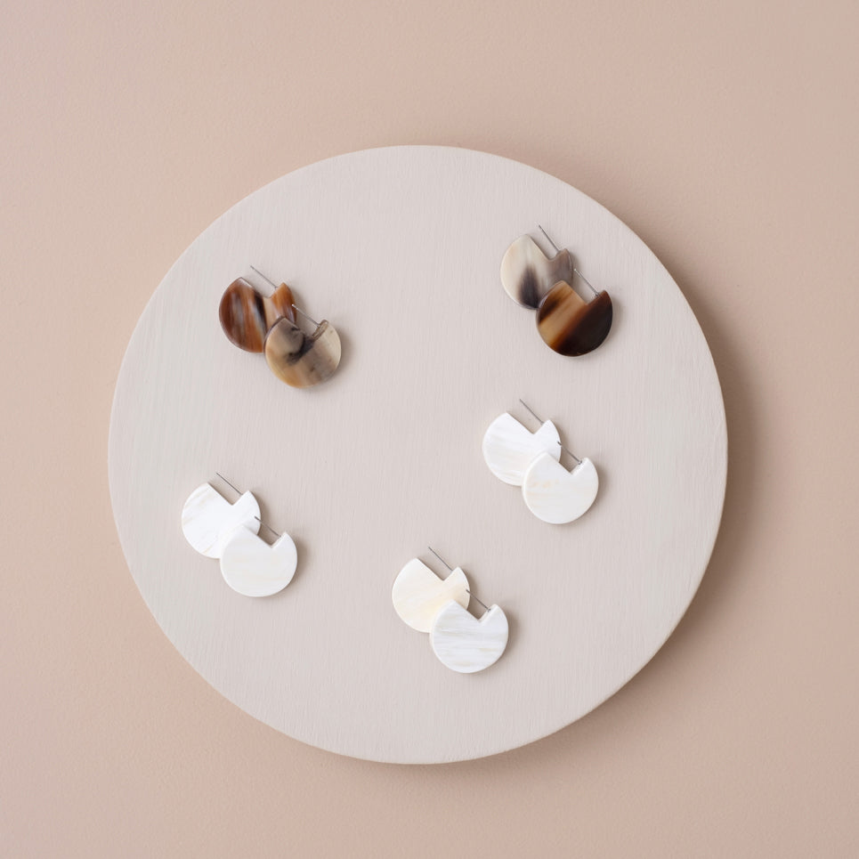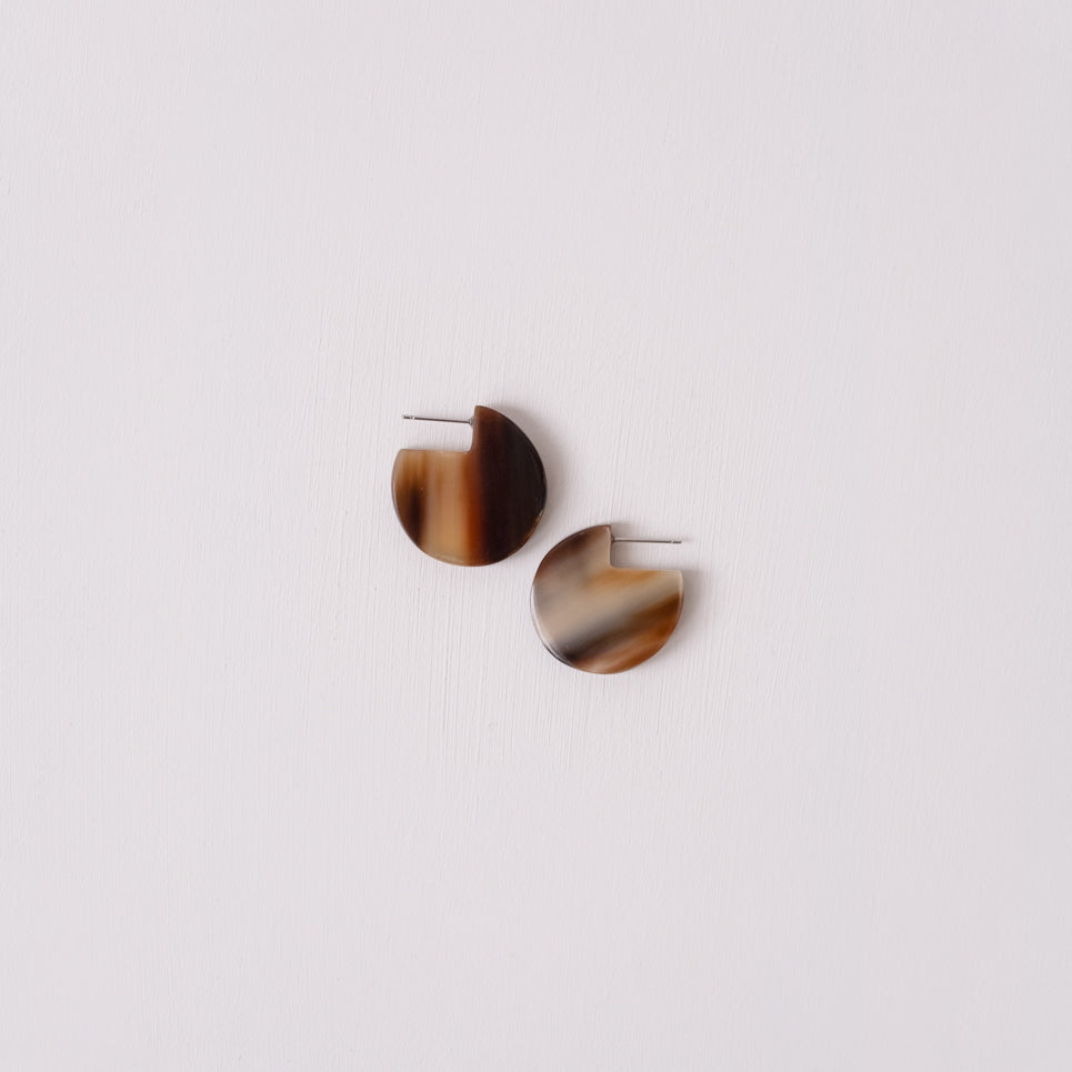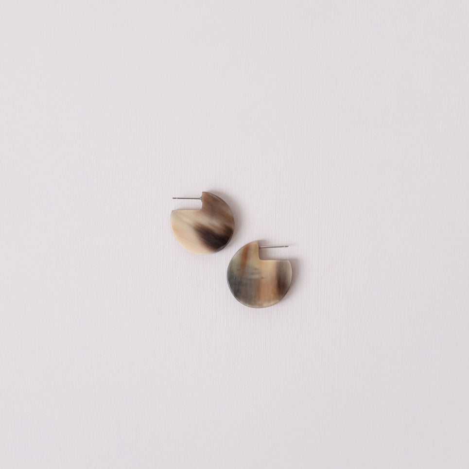 Hand carved and polished cow horn post earrings in a modern, simple Full Moon/New Moon design. Crafted so that the unique two-sided color tone nature of the Ankole Horn can be worn both ways on different days - you get two earrings in one! Assorted color tones.
