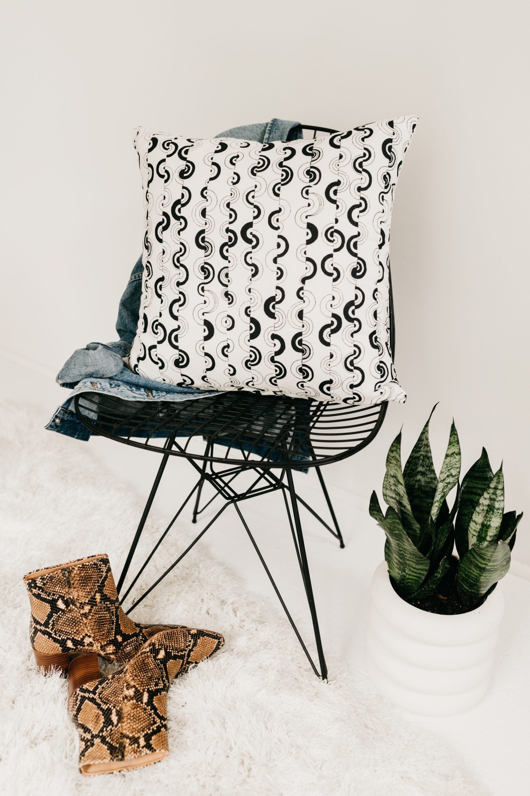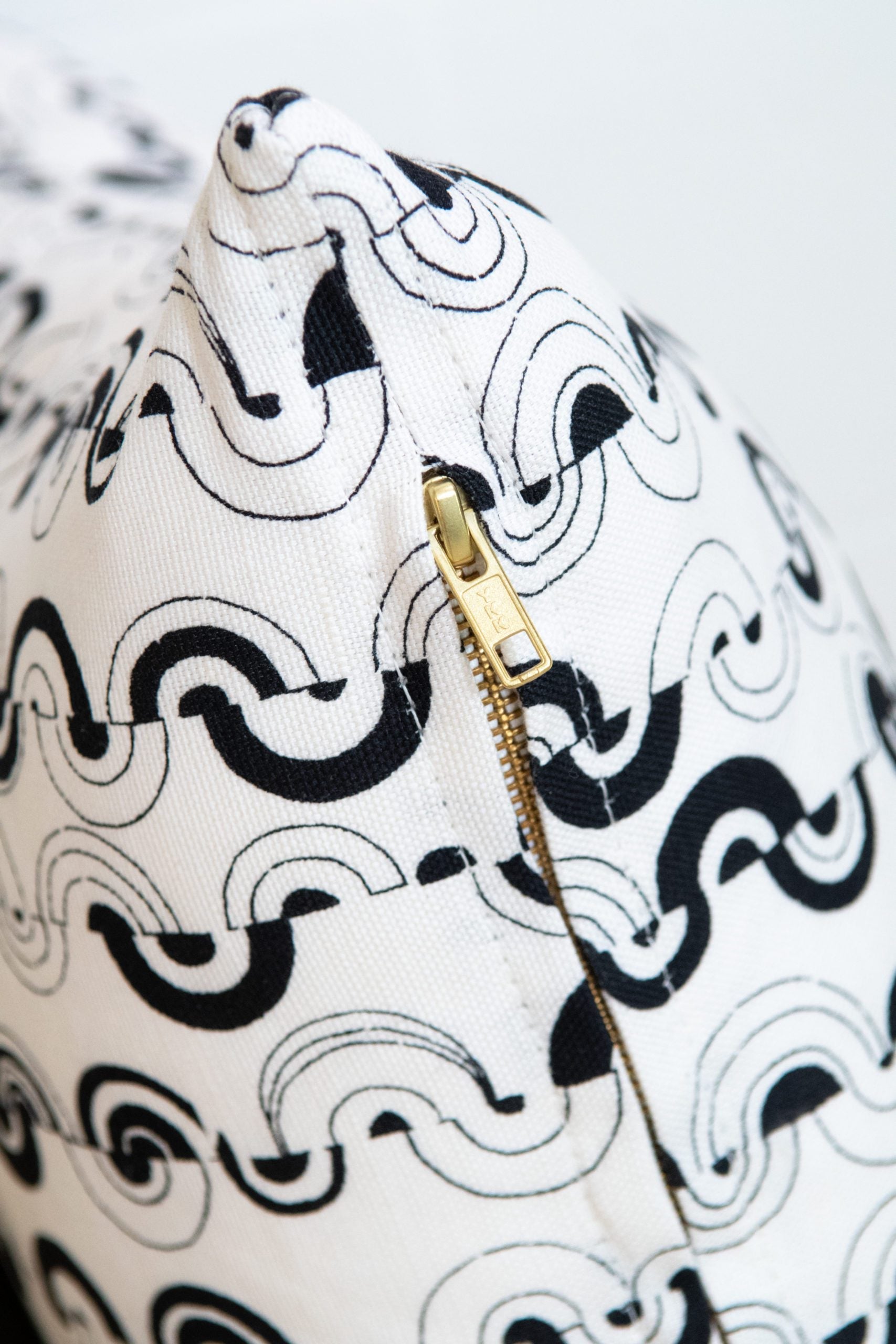 The 20" X 20" Ortega pillow in Clairvoyant is responsibly printed, cut and sewn in the US on a 55% linen and 45% cotton blend with yarns from Belgium.