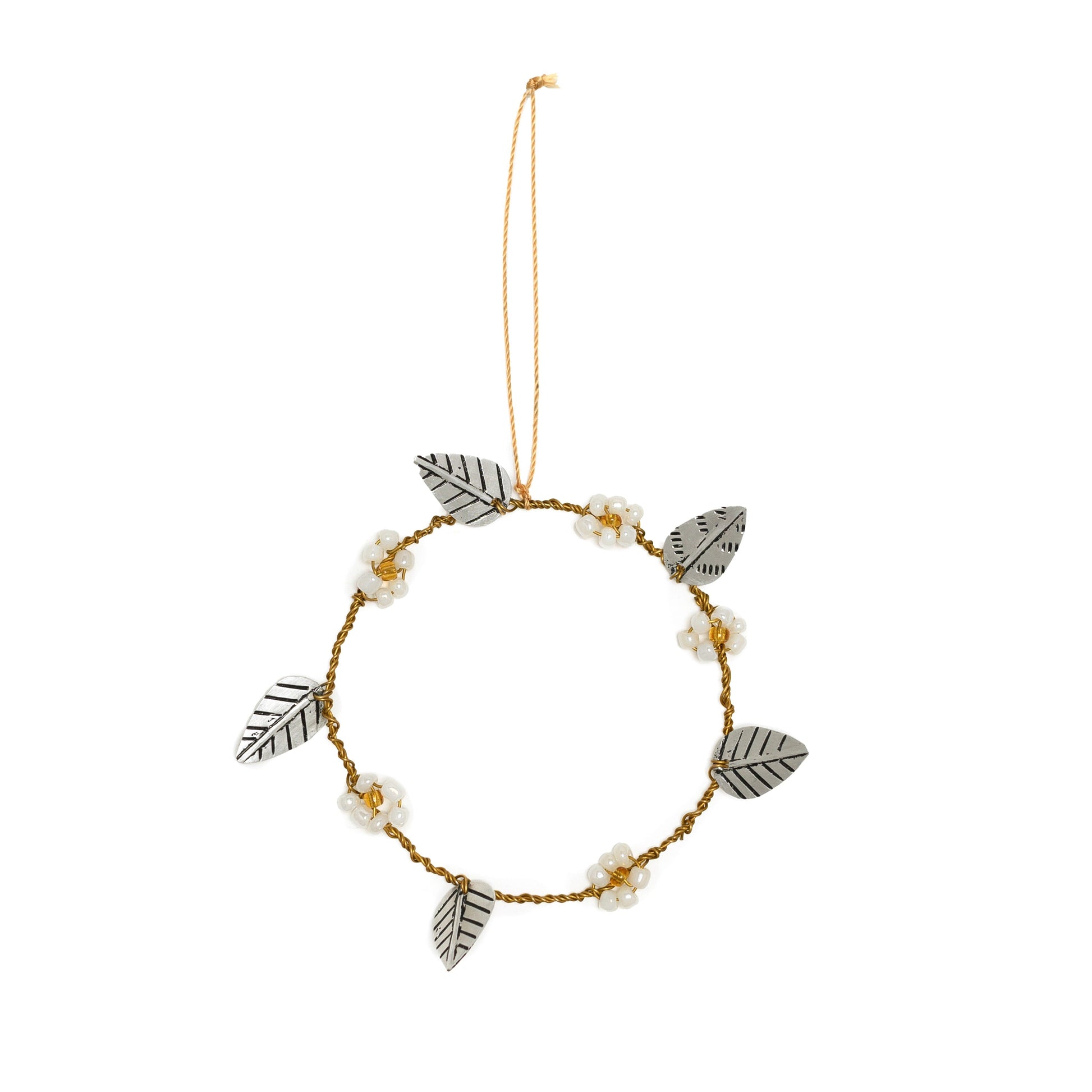 This beaded wreath ornament from Kenya combines traditional craftsmanship with modern design. Made with wire, steel leaves and glass beads, this handmade wreath is sure to bring the holiday spirit into your space. Through flexible working conditions and fair wages, our goal is to contribute to economic empowerment for the artisans. Made in: Kenya Material: Wire, glass beads, recycled aluminium Size: 7. 5 cm Color: white/gold/silver