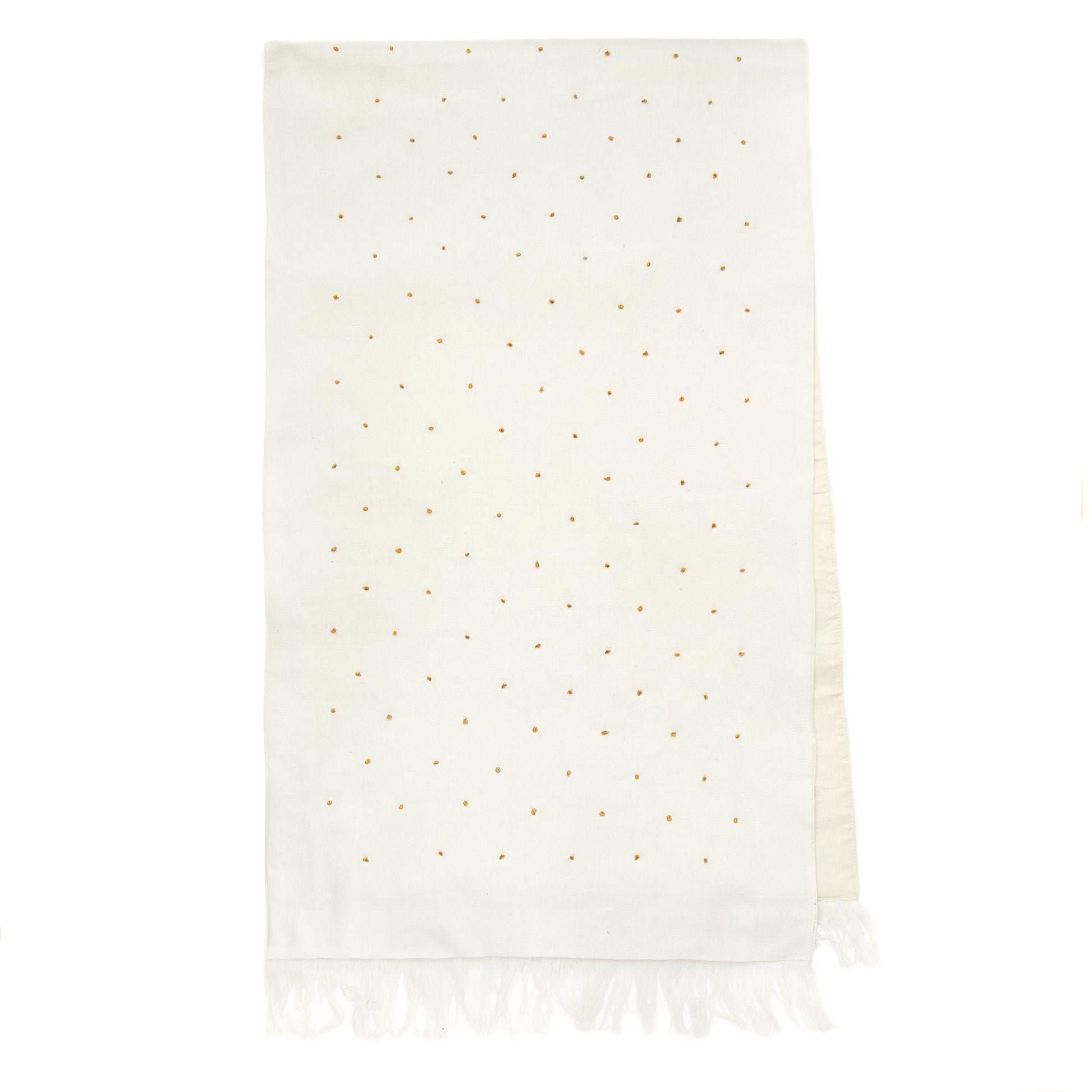 This table runner is made from handloomed fabric and is decorated with hand-embroidered dots in ocher yellow. Embroidery is an important part of our production, as it can be made everywhere, even in remote villages with few other jobs available. The women can work from home at their convenience, or in the fellowship of a producer group at a local Salvation Army center. The fabric is handwoven at traditional looms at our workshop in Jashore, Bangladesh. Made in: Bangladesh Material: Cotton Size: 45 x 150 cm
