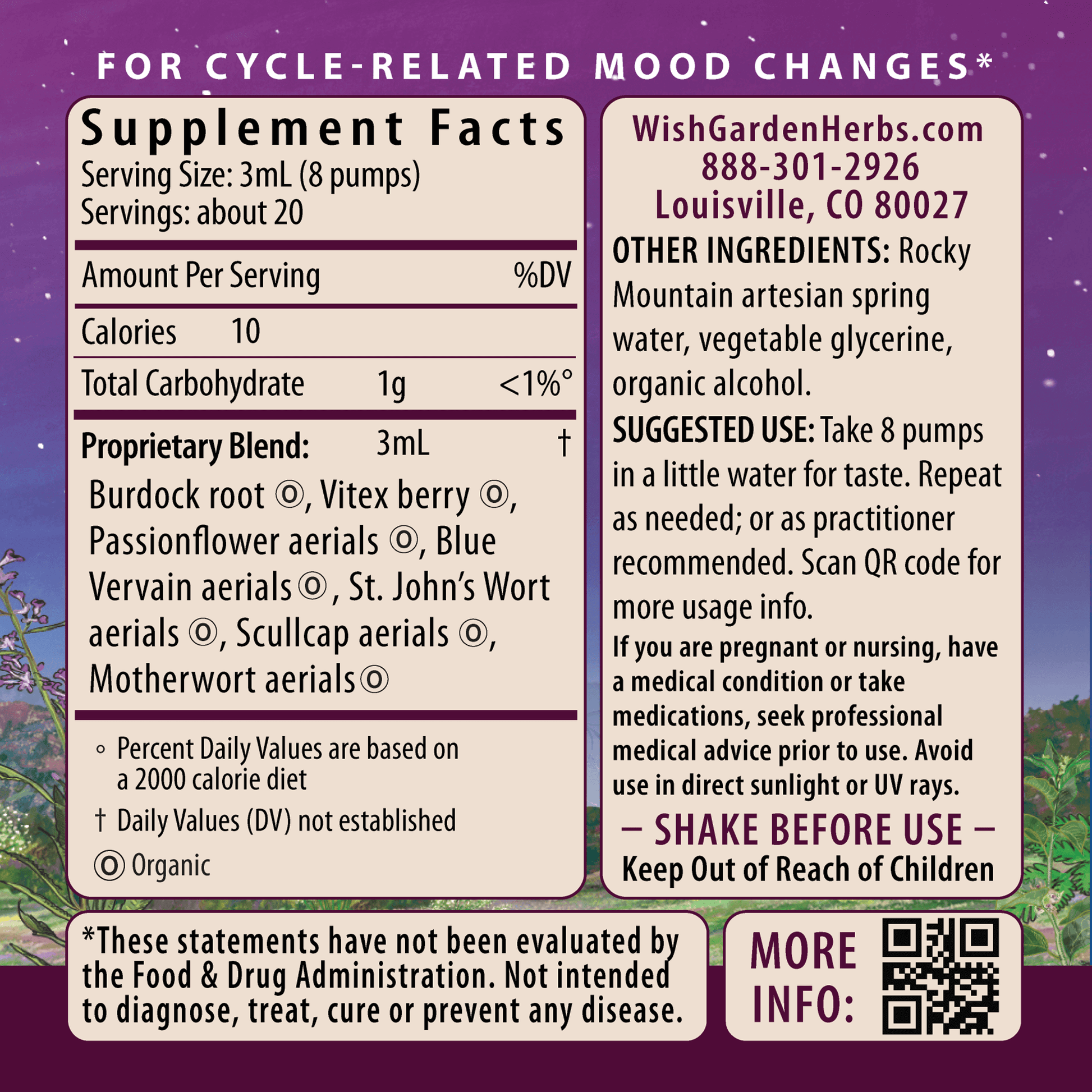 Organic Burdock root (Arctium lappa), organic Vitex berry (Vitex agnus-castus), organic Passionflower aerials (Passiflora incarnata), organic Blue Vervain aerials (Verbena hastata), organic St. John's Wort aerials (Hypericum perforatum), organic Scullcap aerials (Scutellaria lateriflora), organic Motherwort aerials (Leonurus cardiaca), Rocky Mountain artesian spring water, vegetable glycerine & organic gluten-free alcohol.
