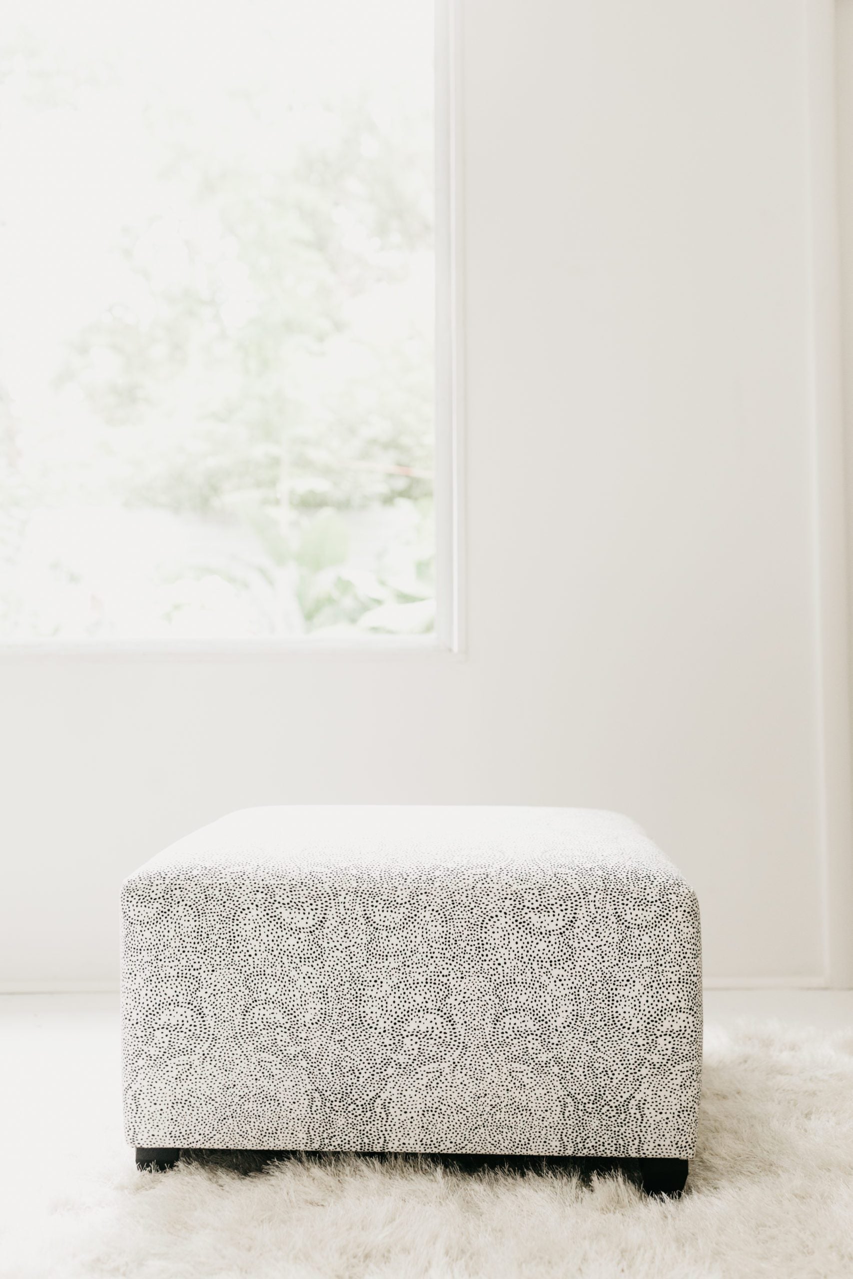 A piece for the visionary, in a timeless contrast. Add a pillow for a unique seating arrangement, top with trays and magazines for décor or stage to add form and design to your space. Palizada is printed on a 55% linen and 45% cotton blend with yarns from Belgium. The ottoman is responsibly crafted by regional artisans in the US, and measures approximately 25"L X 27"W X 15"H.