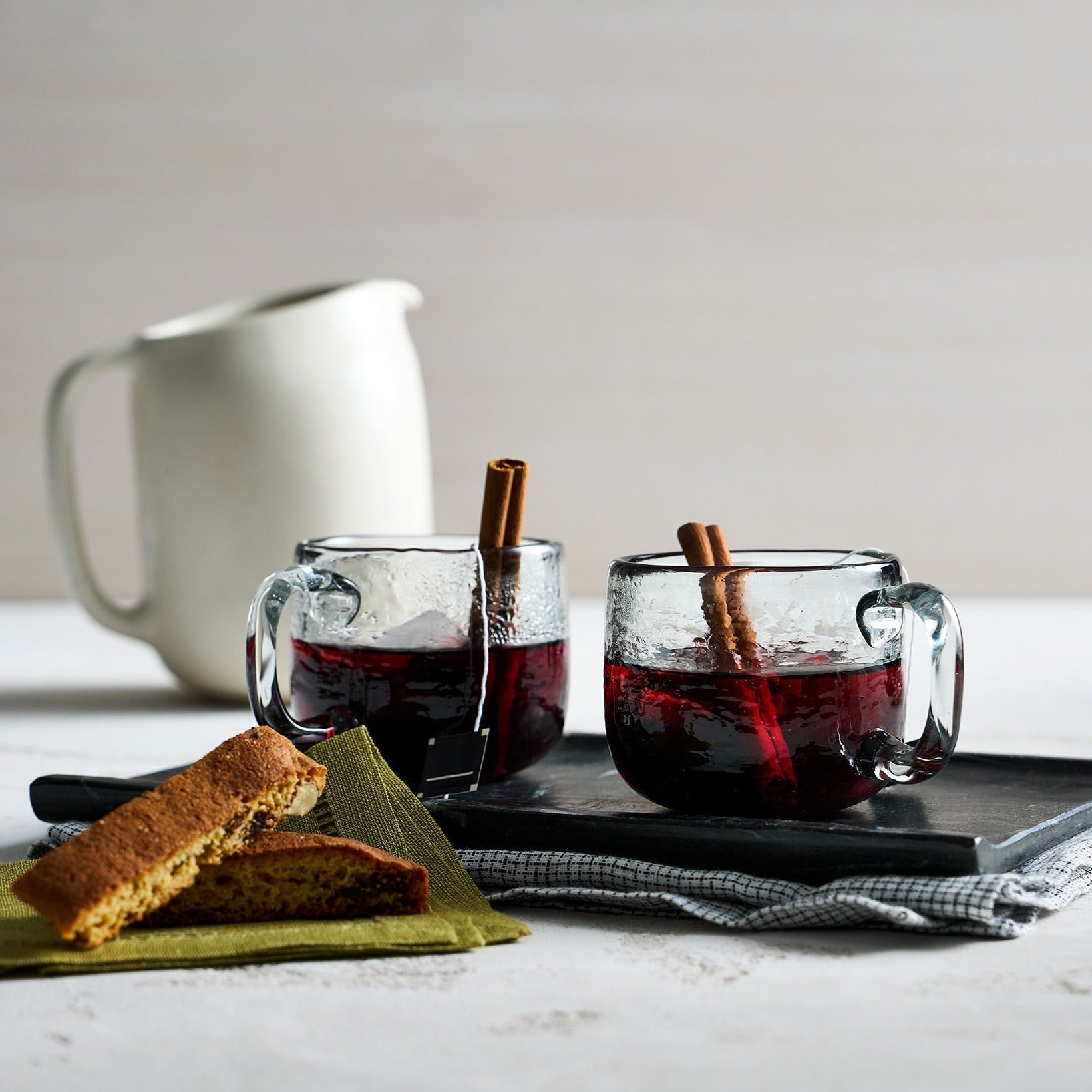 This set of two Pebbled Small Mugs is guaranteed to add a touch of elegance to your morning tea or coffee. With a 7 oz capacity and a hammered texture, each mug is mouth blown and hand crafted by experts for a unique touch. Also available in a larger size for more enjoyment.