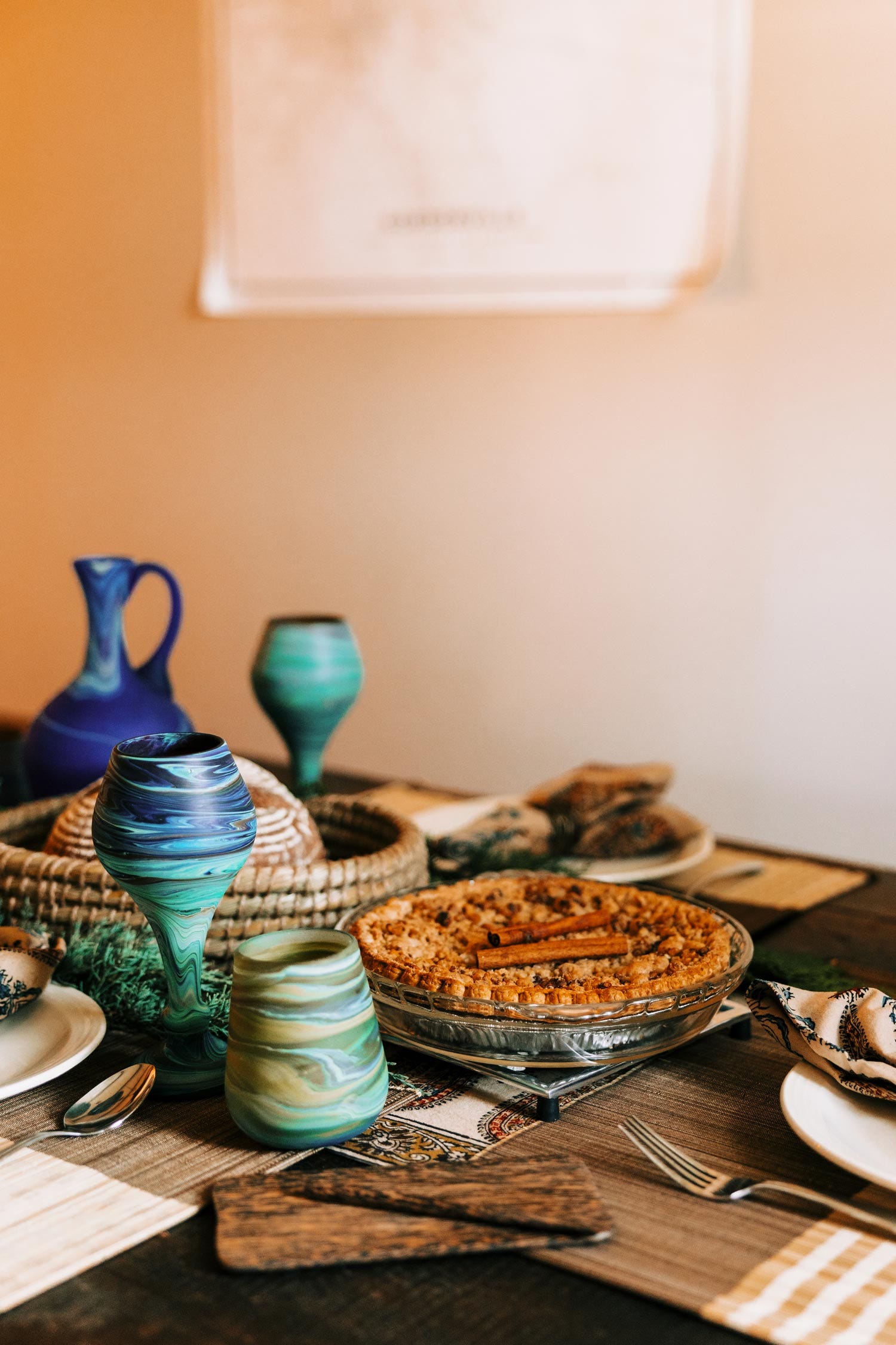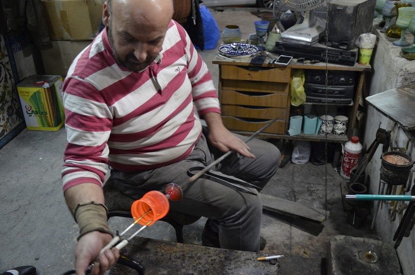 Cheers! Drinking from this one-of-a-kind art piece, a handblown Phoenician Glass Goblet, makes every occasion a celebration. Handcrafted in swirling Phoenician glass by artisans of Hebron Glass & Ceramic Factory. Recycled bottles are smashed into pieces and melted in high-temperature ovens. In Phoenician glass blowing, artisans add substances to the molten glass, resulting in a reaction that creates the trademark swirling colors. Working with this process takes an incredibly skilled hand, at least five years of apprenticeship, and reserved for the true experts of the art. This is a heritage craft, often with family recipe secrets passed down through generations. Phoenician glass is so prized that it is gifted for weddings. Every Phoenician Glass Goblet has a unique blend of color and pattern, making each one one of a kind.