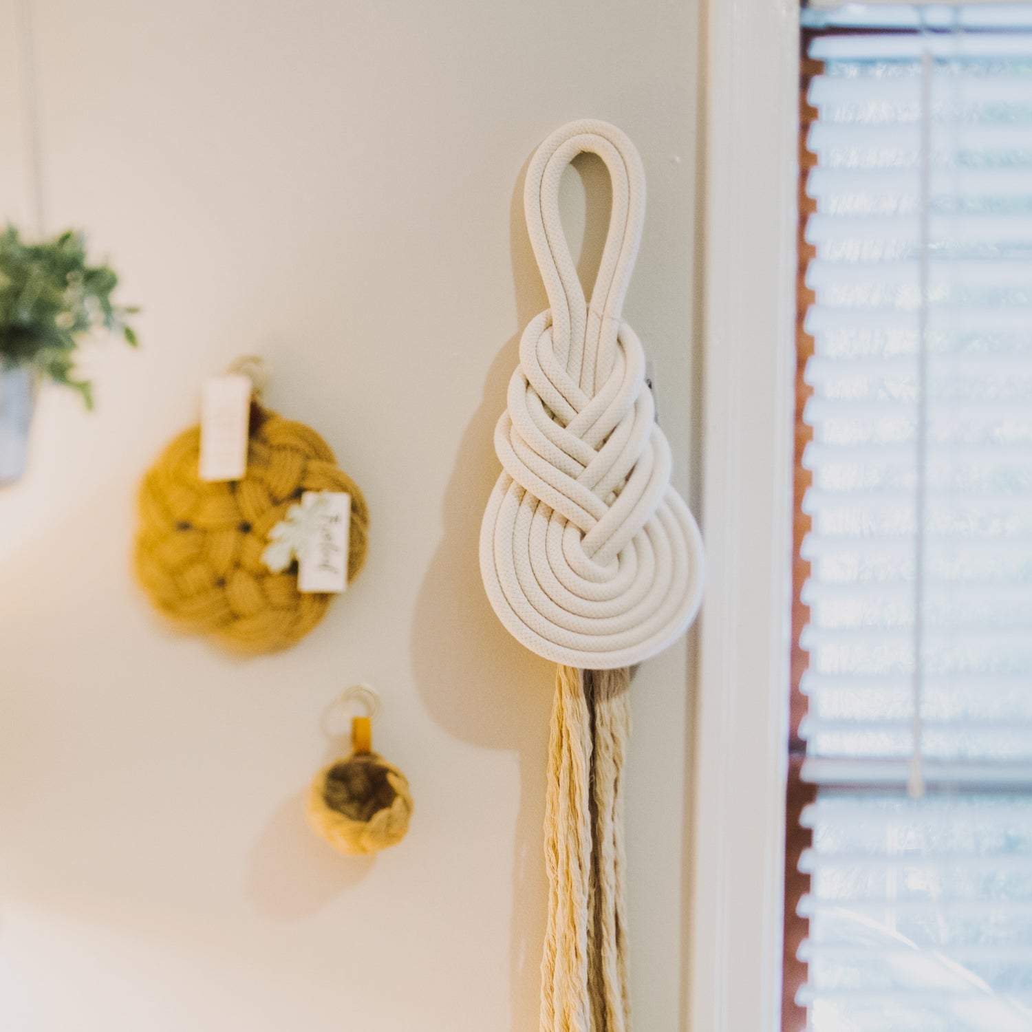 Handmade and totally unique, the fair trade Pippa Wall Hanging is a stunning addition to any statement wall or hallway. Its modern, simplistic design and neutral color lends itself to almost any style of home décor. Material: Cotton Rope Size: approximately 20" x 12". The tassels measure: 2' in length Caring for your Wall Hanging: Spot wash in cool water and set out in the sun to dry. Please test any detergents or cleaners on a small area, to make sure that it will not affect the fiber colors.