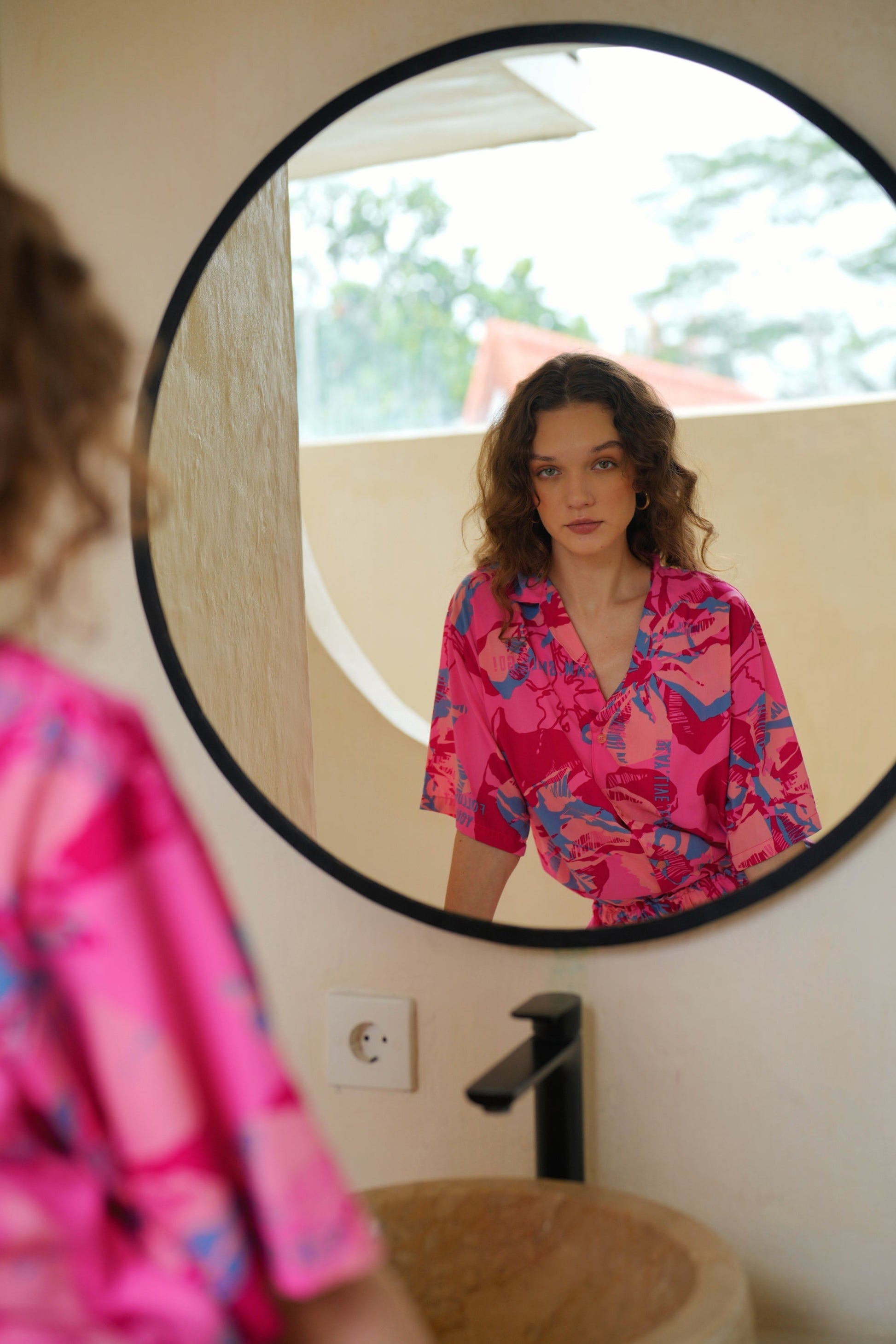Get ready to take on your travel vacation and rest days in this cozy and lightweight two-piece set featuring a play, live, shine, bright print button down collar shirt and comfy pull-on design with stretchy elastic waist band short. An essential two-piece set outfit for your summer travel packing or a pajama set. One sizing button down shirt can be easily dress up and down, from beach day cover up to causal night out look. Shorts: Pull-on design with stretchy elastic waist band. Our model is 5’9” Size S is wearing S/M. Hand wash cold. Lay flat to dry. 100% Rayon. Handmade with love. Shipping & Returns: Return accepted for store credit only. Please see our Shipping & Returns page for more details.