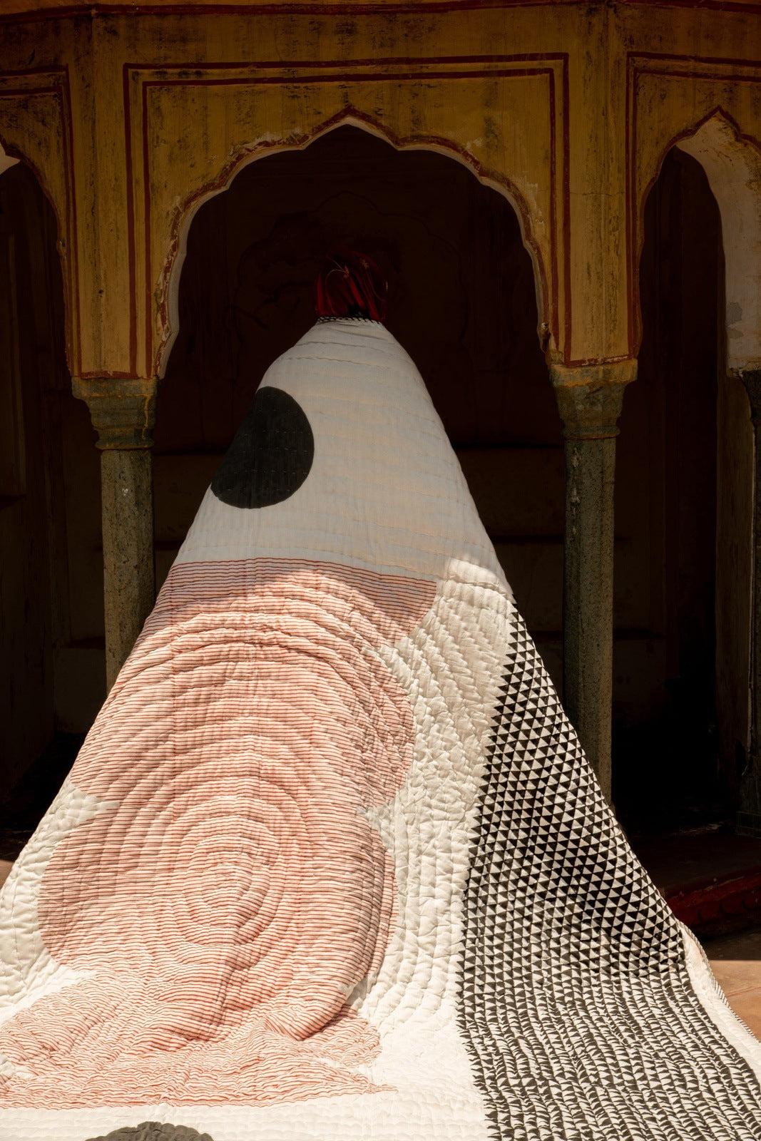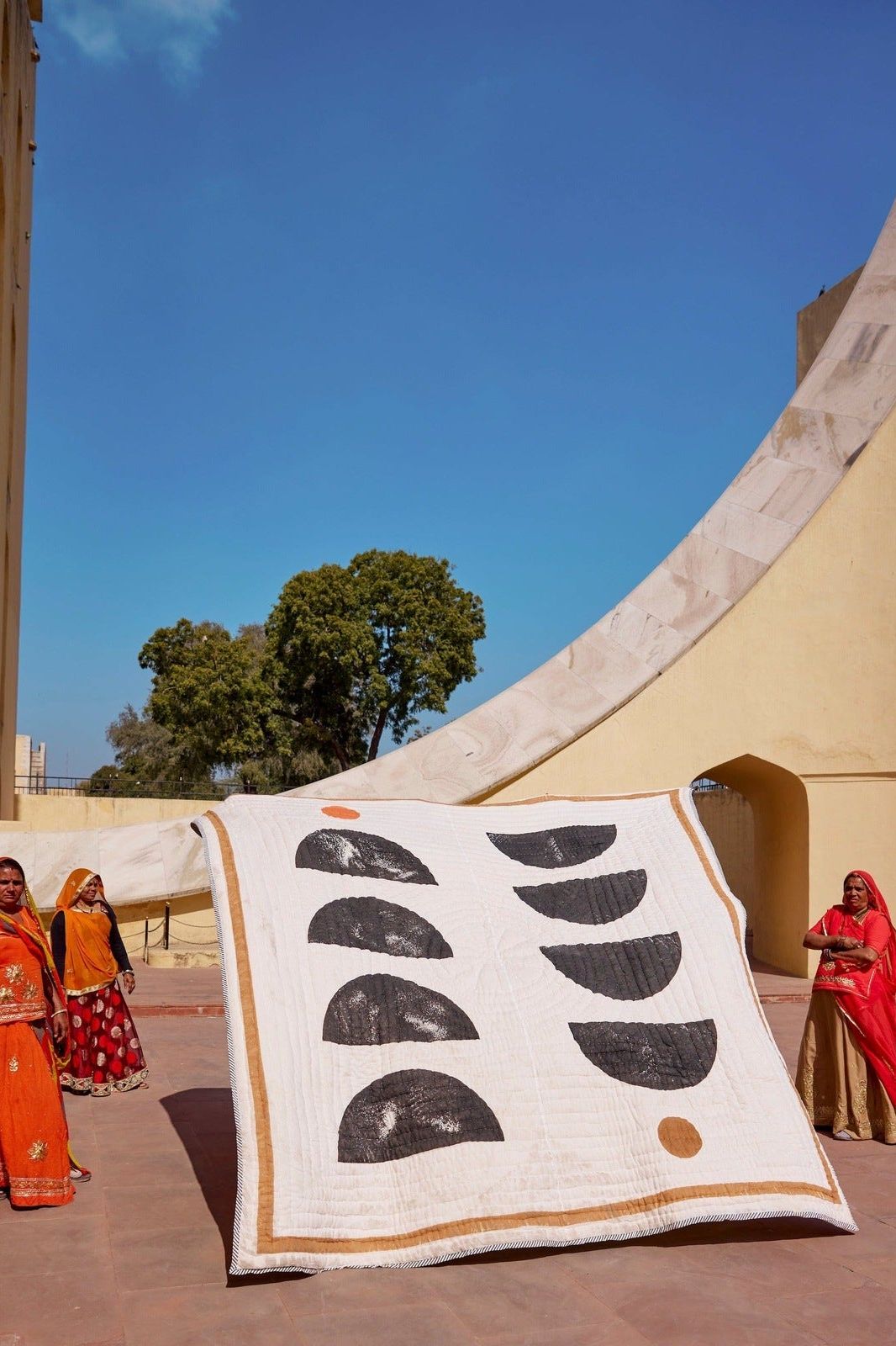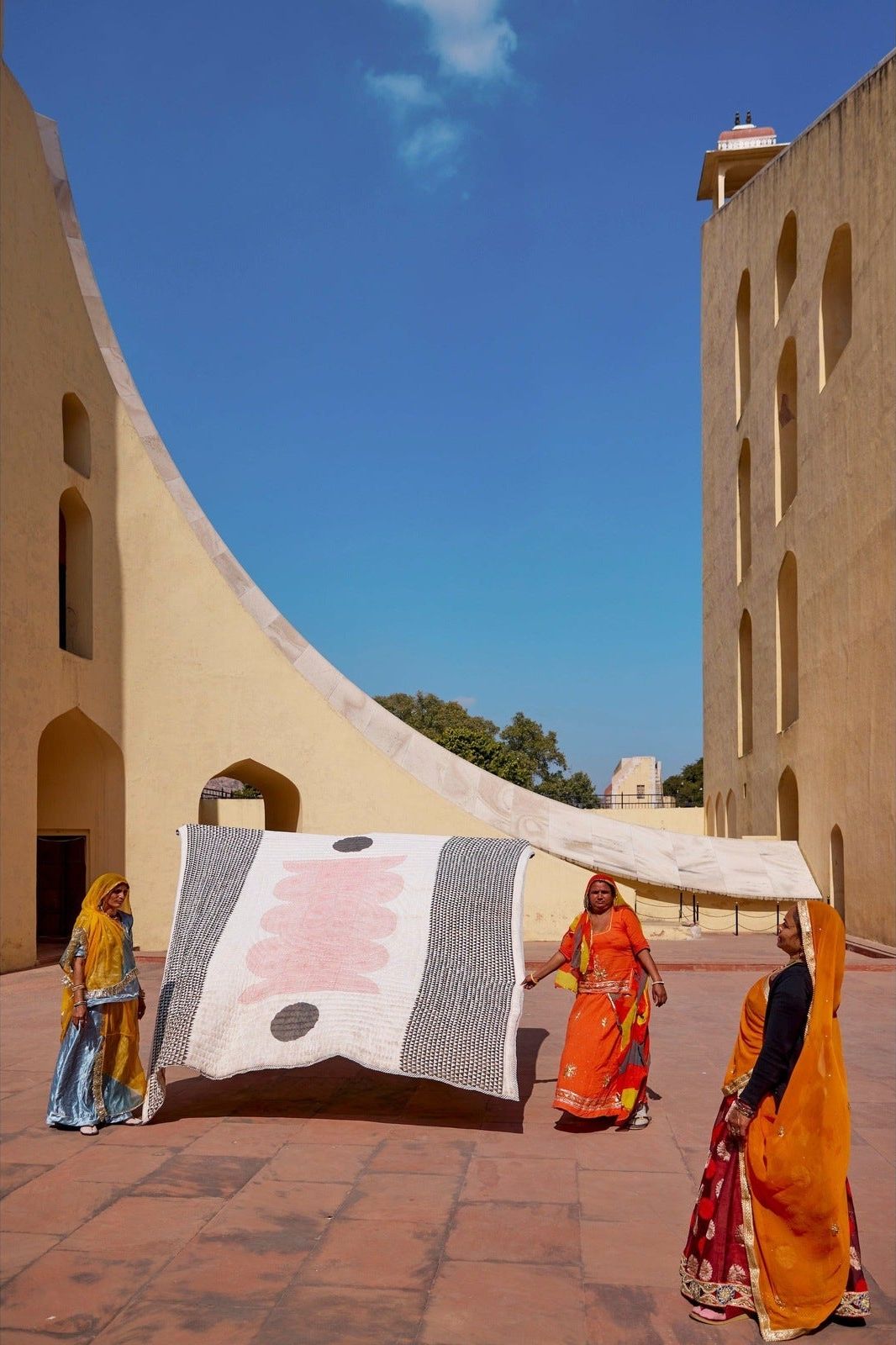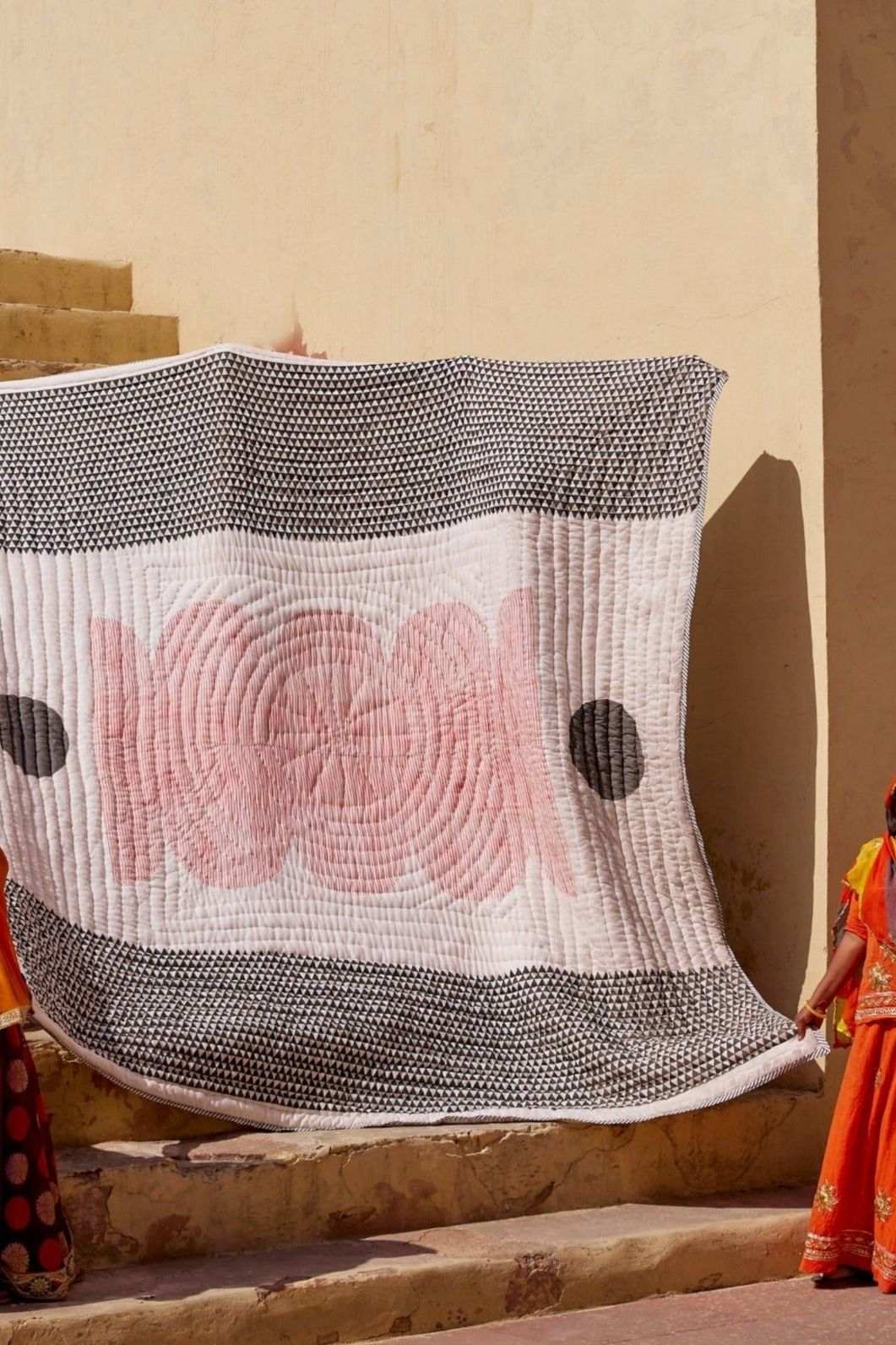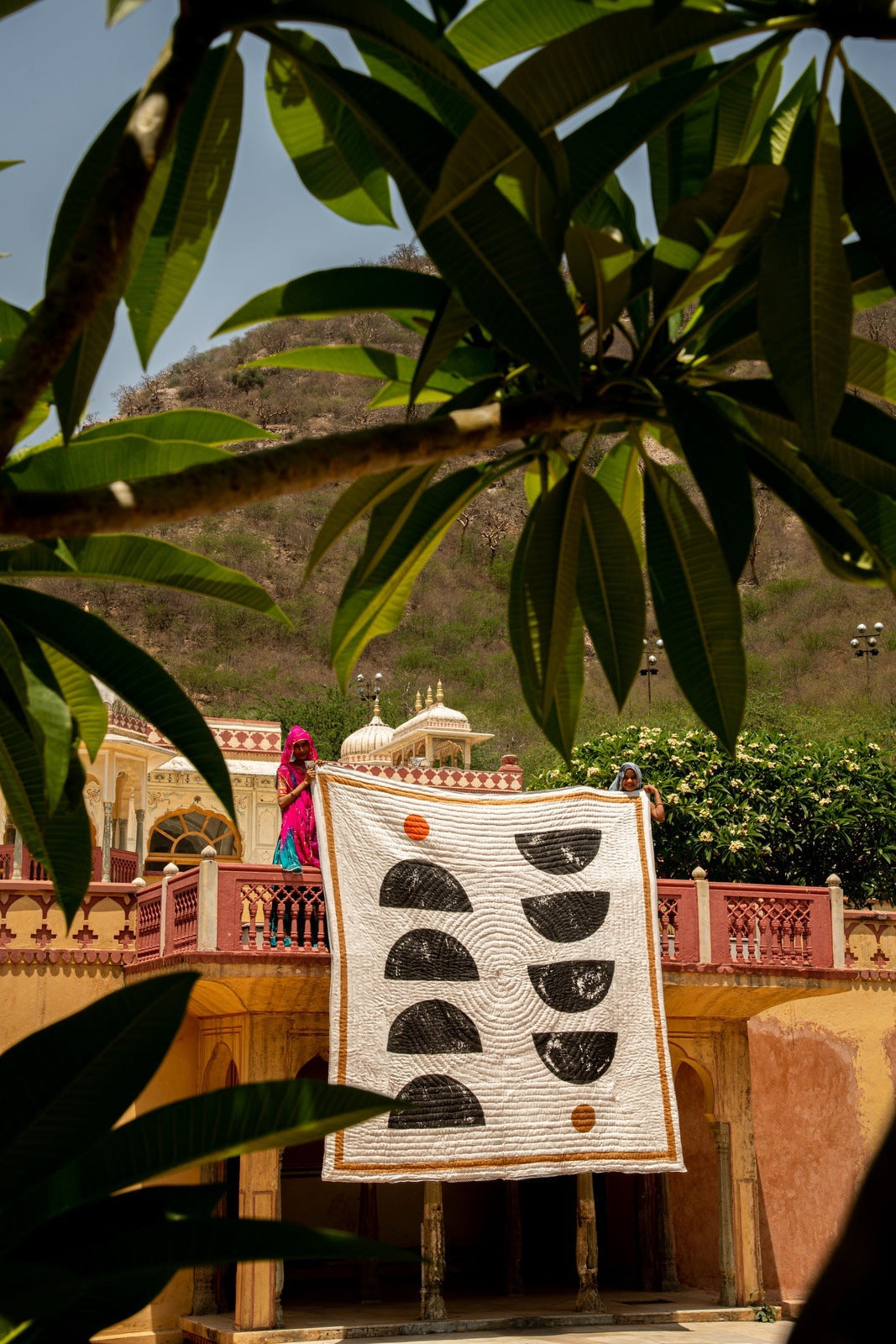 Each quilt is handmade, requiring attention from 4 different artisans, including wood carvers, block printers, quiltmakers, and dye specialists. The design is hand-pressed onto each quilt using hand-carved wooden blocks dipped in dyes. The printed cotton shells are brought to the homes of quiltmakers, who stuff and stitch the quilts by hand, creating the final product. Our quilts are made in small batches. Due to the handcrafted nature of this item, expect slight variations in the appearance of each unique piece. - 100% cotton voile exterior - 100% cotton stuffing - Made in India - Ships from California - Queen size: 96″ x 96″ - King size: 108″ x 108″