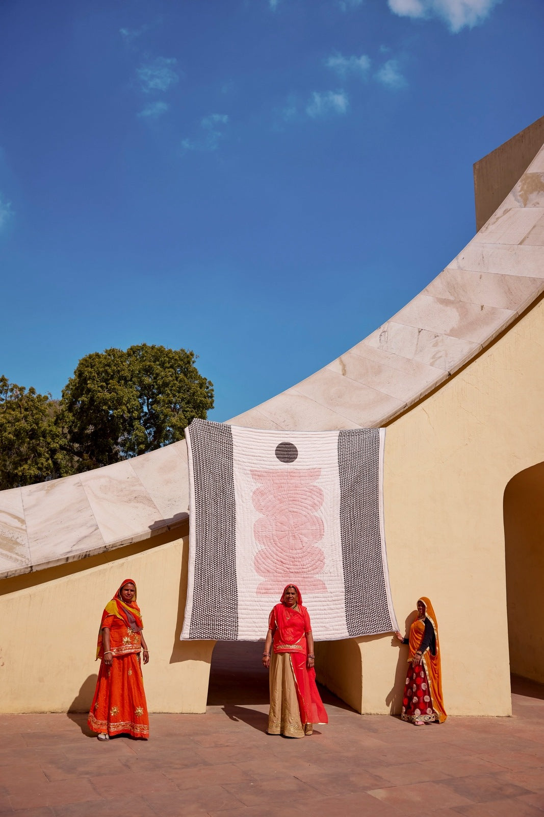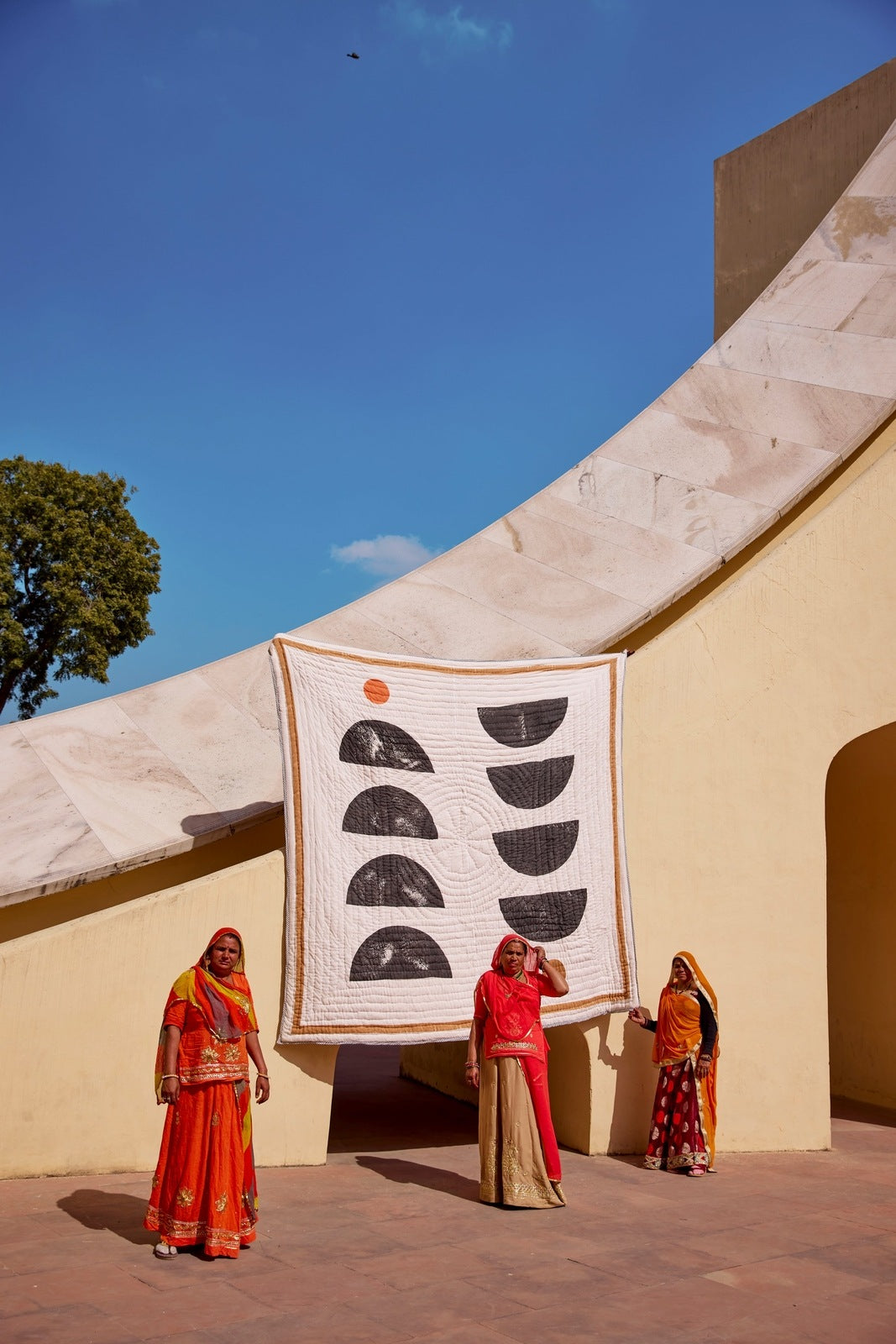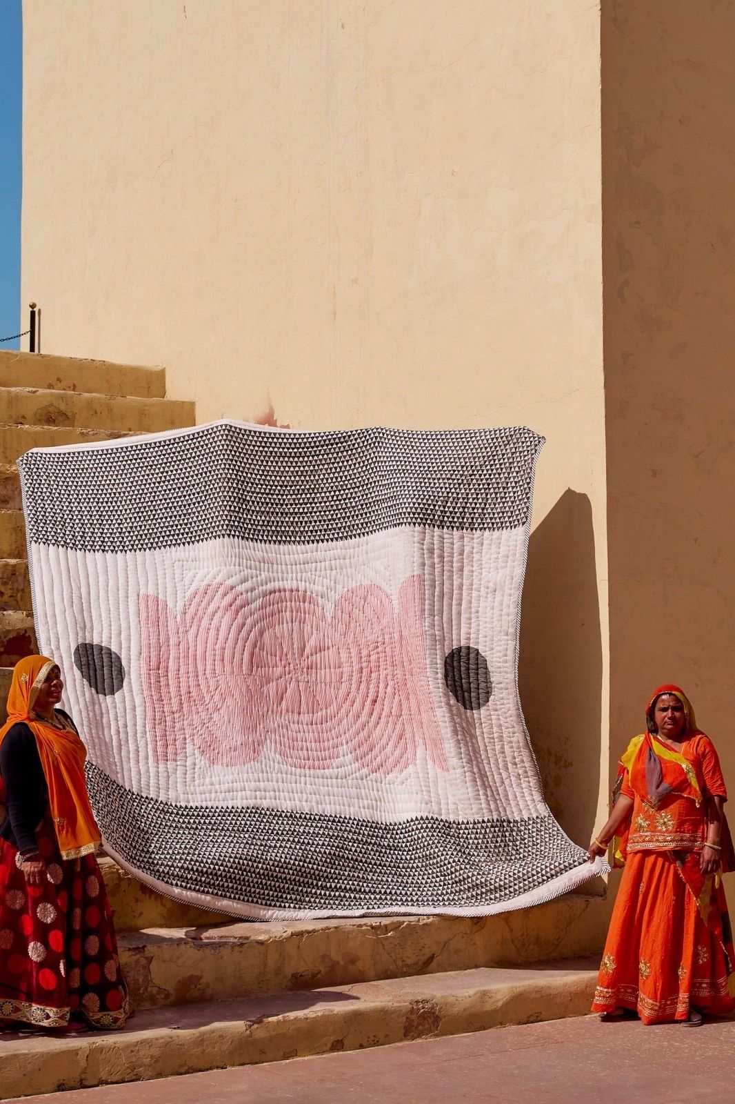 Each quilt is handmade, requiring attention from 4 different artisans, including wood carvers, block printers, quiltmakers, and dye specialists. The design is hand-pressed onto each quilt using hand-carved wooden blocks dipped in dyes. The printed cotton shells are brought to the homes of quiltmakers, who stuff and stitch the quilts by hand, creating the final product. Our quilts are made in small batches. Due to the handcrafted nature of this item, expect slight variations in the appearance of each unique piece. - 100% cotton voile exterior - 100% cotton stuffing - Made in India - Ships from California - Queen size: 96″ x 96″ - King size: 108″ x 108″
