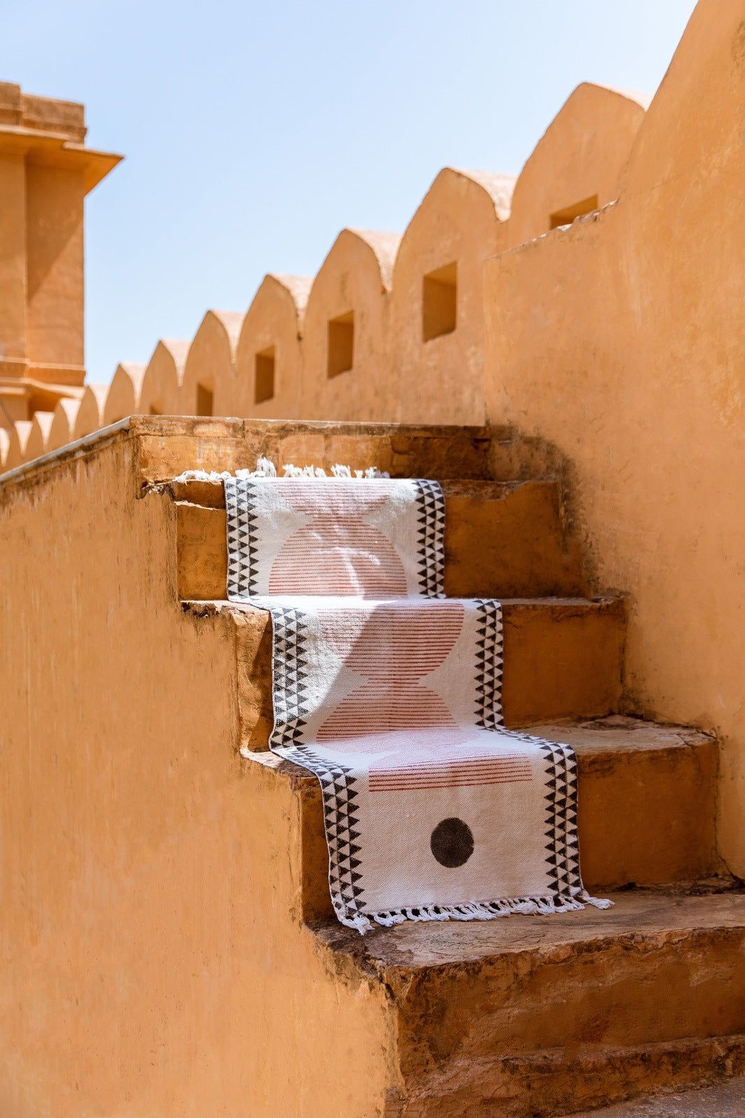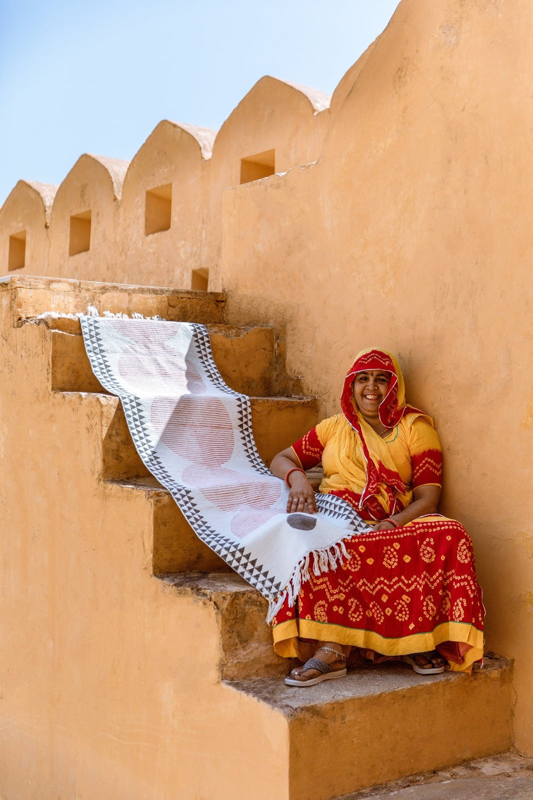 Each rug is handmade, requiring attention from 4 artisans, including wood carvers, block printers, weavers, and dye specialists. The design is hand-pressed onto each rug using hand-carved wooden blocks dipped in dyes. All rugs are made in small batches. Due to the handcrafted nature of this item, expect slight variations in the appearance of each unique piece. - 100% Cotton - Made in India - Ships from California
