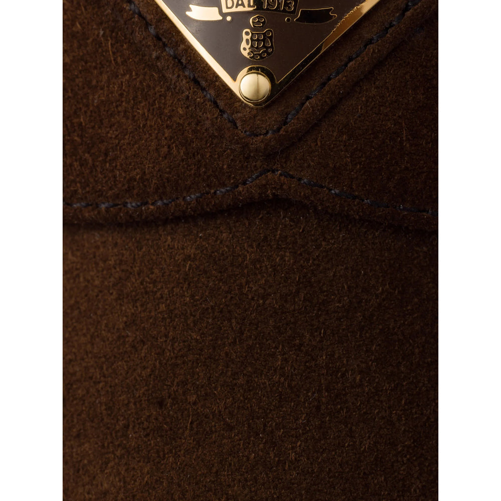 brown suede slip-on style enamel triangle logo almond toe flat sole