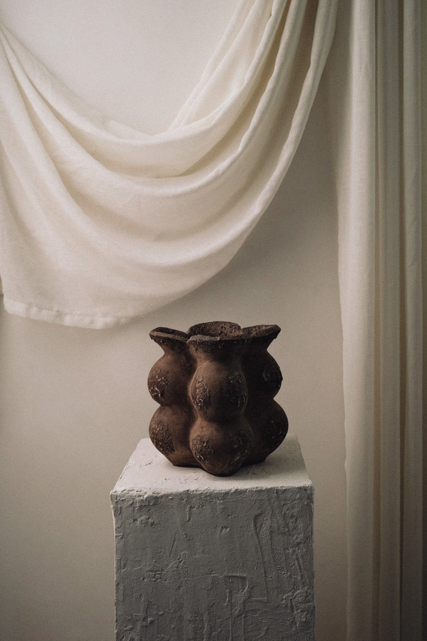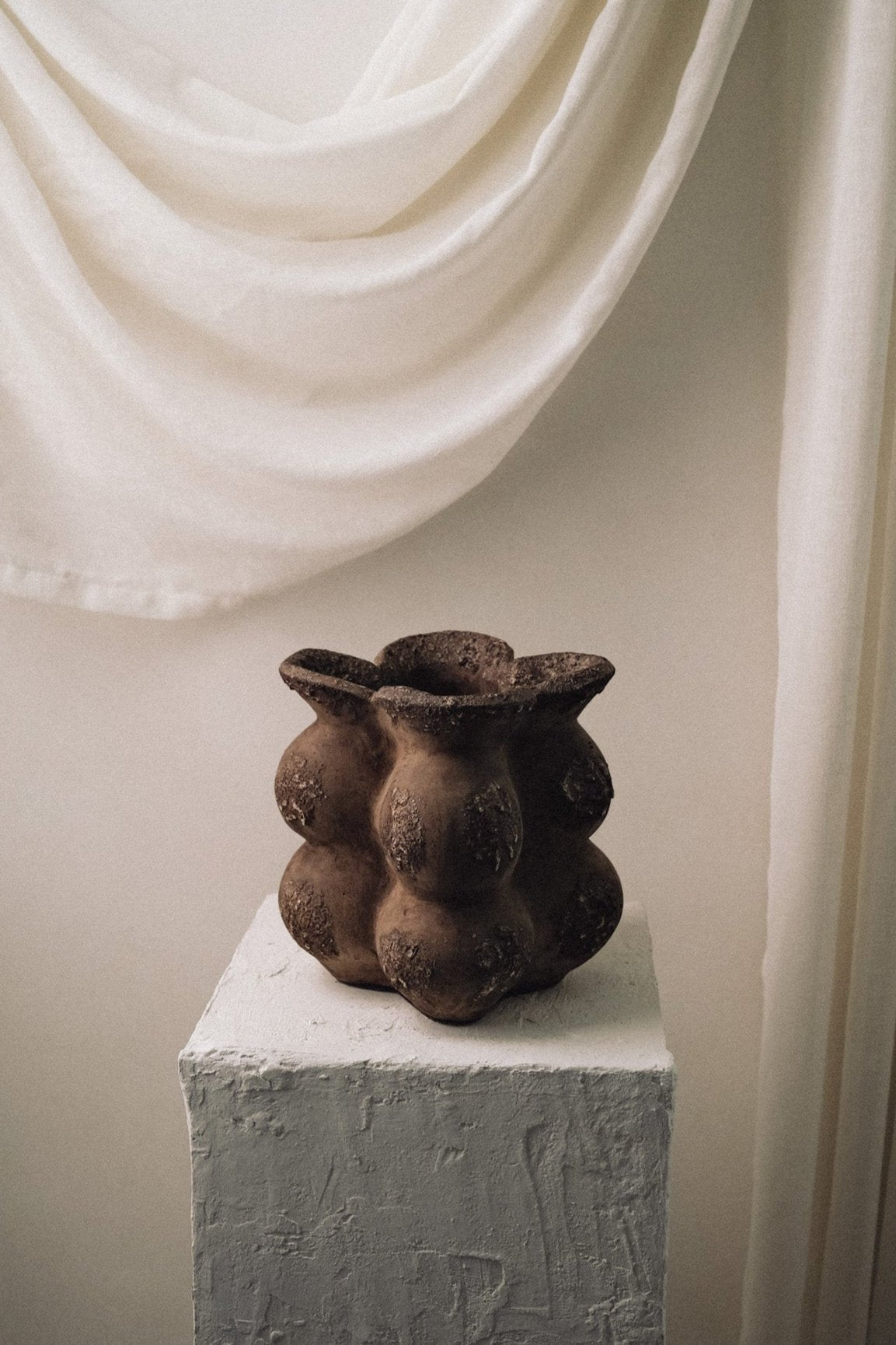 Boldly distinctive and tactile, the Sculpted Ratu Vessel from our Flora Collection is a celebration of organic form and artisanal craftsmanship. This piece, handcrafted by skilled Indonesian artisans, features a striking cluster design with rounded, bulbous shapes that evoke the raw beauty of nature. The high-texture finish gives it an earthy, weathered appearance, making it feel like a relic from another time.