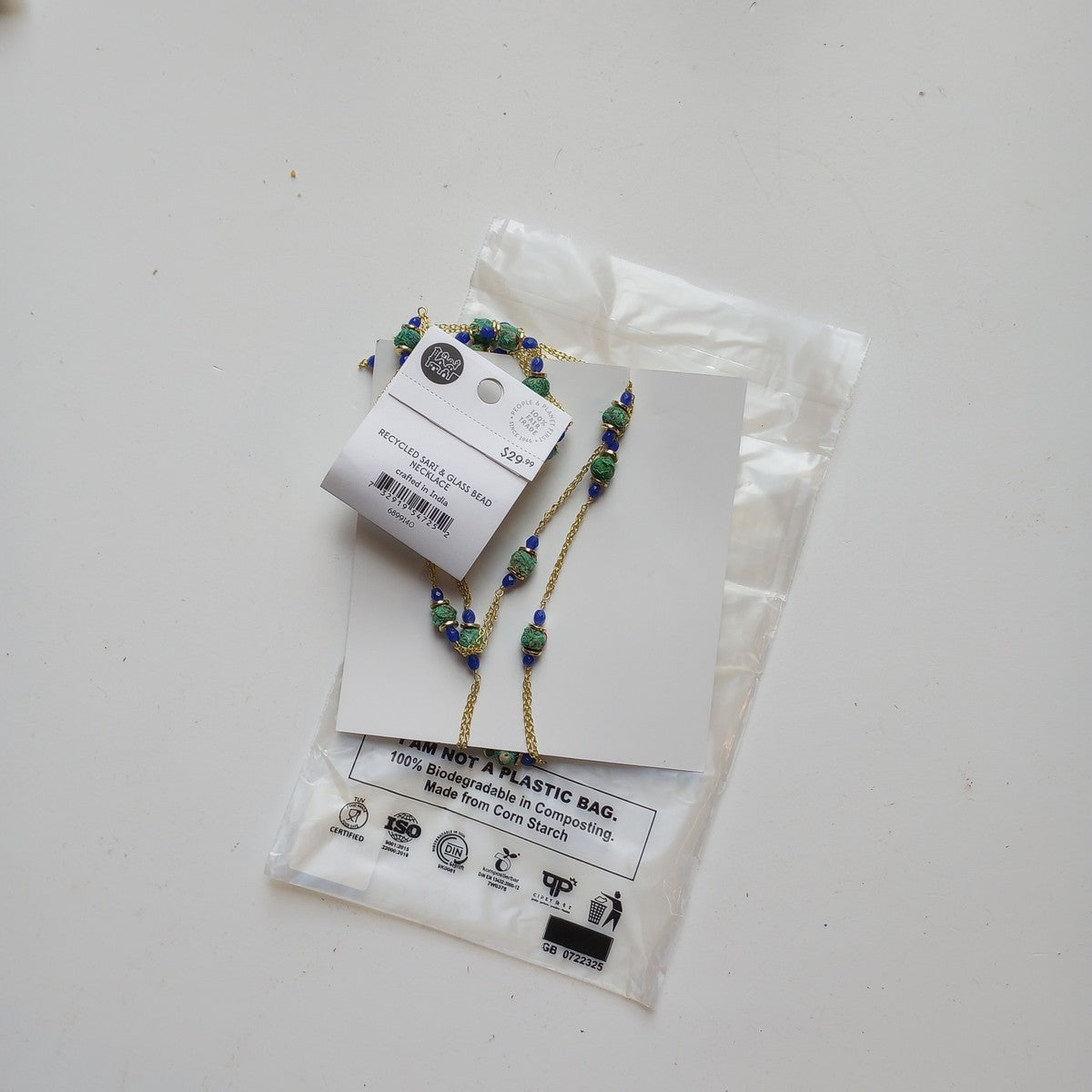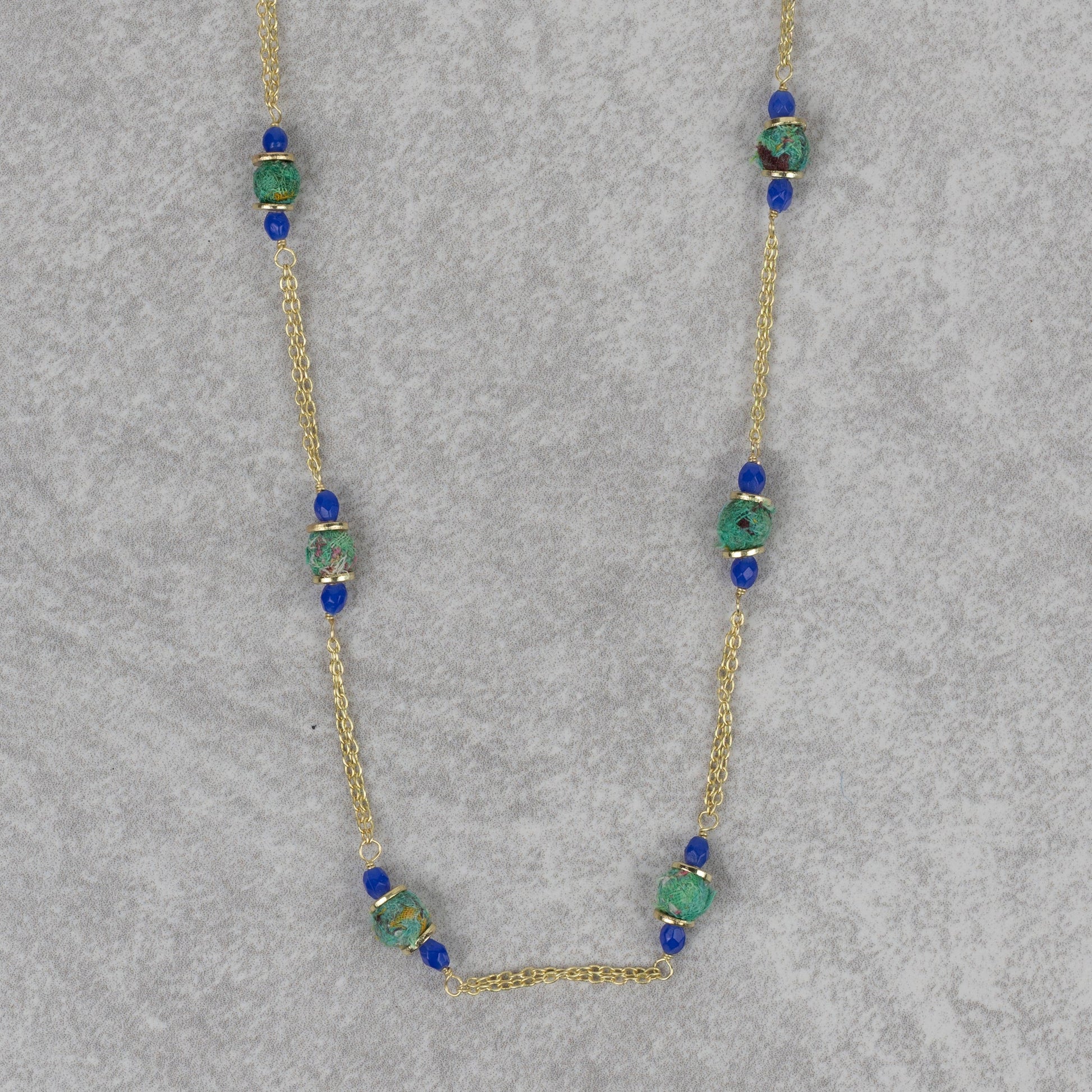 The mix of texture and rich color make the Recycled Sari & Glass Bead Necklace truly one-of-a-kind. Vibrant blue glass beads and green recycled sari combine with gold tones on this long necklace for a statement piece that truly pops. Can be worn long or looped twice around the neck for an instant layered effect. Handcrafted in India by our fair trade partner Tara Projects, which helps to transform artisans' lives and communities with new opportunities to earn sustainable income.