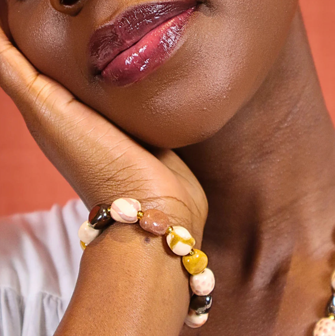 Discover the timeless elegance of the Safari bracelet. Handcrafted with precision, this exquisite piece showcases the beauty of Africa's iconic "Big Five" animals through small lozenge-shaped beads. Earthy tones and intricate beadwork evoke a sense of wanderlust and safari adventures across the savanna. The bracelet is elastic, offering a comfortable fit for different wrist sizes. The gold accents highlight the vibrant colors of the beads.