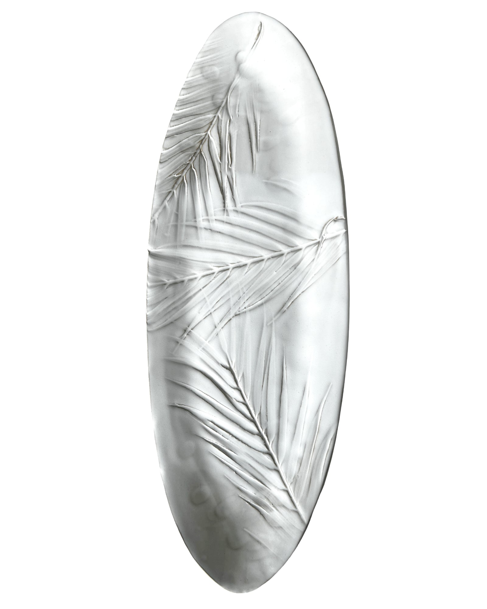 Your home is your sanctuary. Effortlessly transform your home into a tranquil oasis with the Sandalwood Collection. Each handcrafted piece is carefully stamped and glazed for a soothing, meditative experience. Mix and match with the Luna, Borealis, and Palo Santo collections for a truly unique touch to your living space. This tray was hand cut and pressed with a fern leaf. The clay gray stoneware (used in the Palo Santo Collection) with a salt white glaze that gets warmer beige tones due to the texture of each piece. Due to the size of this item I recommend hand washing. Approximate measurements: 17-18 inches long x 6-6.5 inches wide x .75 inches tall *All of my products are made by hand and will vary. Each glaze firing varies as well. Please keep this and my refund policy in mind when you place your order. Thank you.
