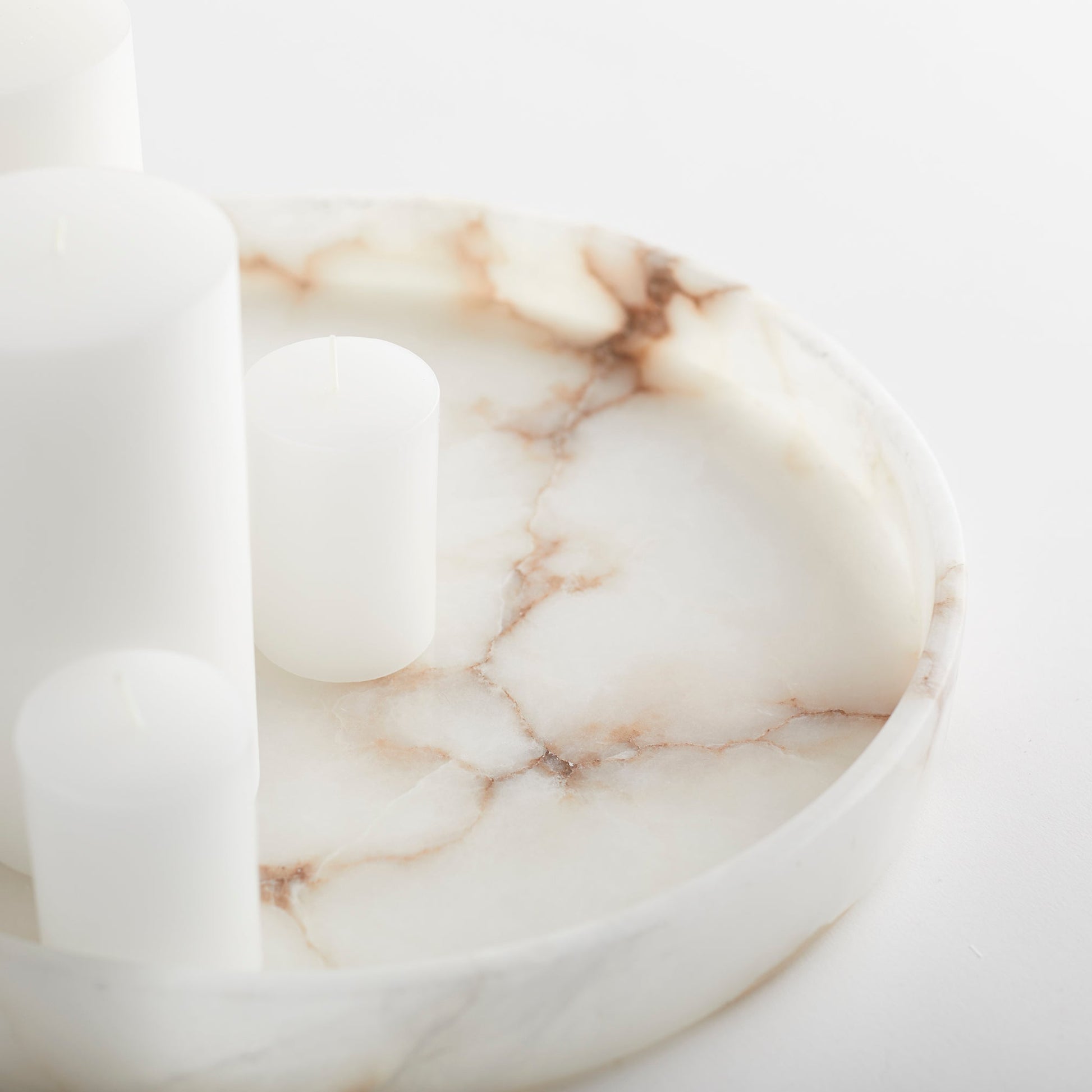 Creamy white Portuguese alabaster sets the stage for this substantial round tray, expertly carved from a single piece of stone. This beautiful piece features a low, straight-sided rim and slightly footed base. Use it to serve dry foods, group candles safely, or corral your best trinkets in a special place. Variations in the natural material ensure that each tray is one-of-a-kind with its inherent streaks and swirls of white, tan, and cream. Because alabaster is a relatively soft material, tray should be handled with care. Each tray features small, clear bumpers underneath it to protect it and your furnishings.