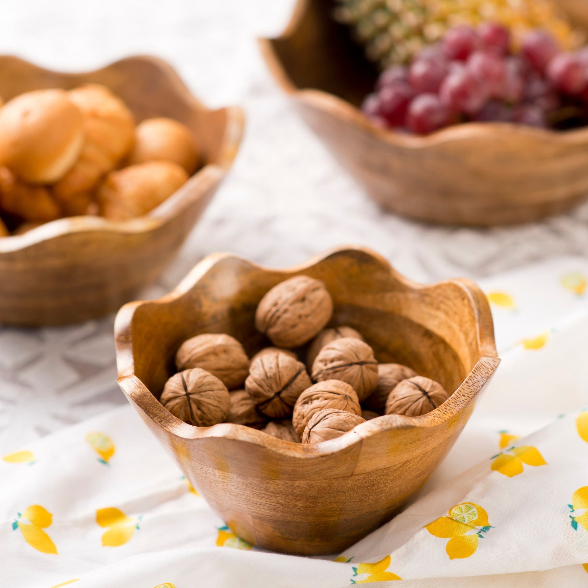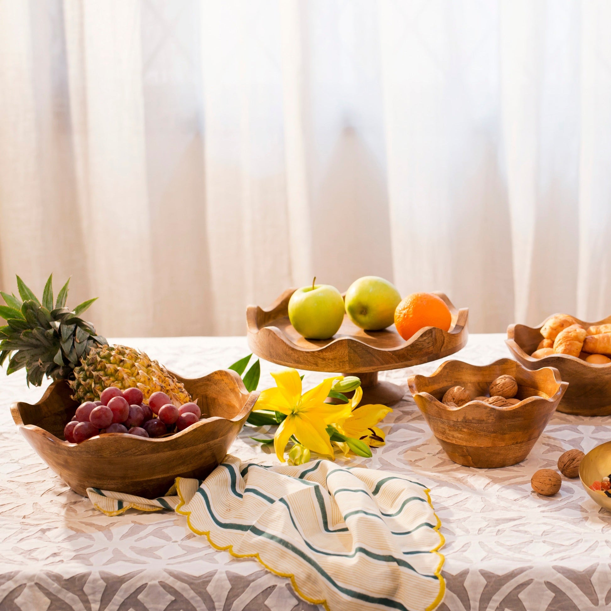 A timeless blend of form and function, the Scalloped Bowls bring quiet elegance to your table. Handcrafted from richly grained wood, each bowl features sculpted scalloped edges that add a refined touch to both everyday dining and special occasions. Designed to impress with effortless sophistication, these pieces elevate any setting. Available in three sizes, they’re perfect for serving salads, light snacks, or standing alone as decorative accents. Small 8" | Medium 10" | Large 12"