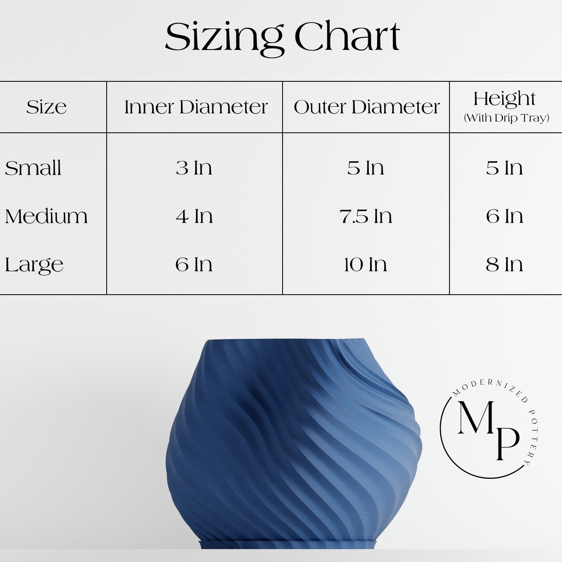 Sizes: Large: Height: 8 inches | Width: 9.5 inches | Depth: 9.5 inches Medium: Height: 6 inches | Width: 7.5 inches | Depth: 7.5 inches Small: Height: 4 inches | Width: 5 inches | Depth: 5 inches Looking for something custom? Feel free to reach out for personalized sizes or colors. Modernized design We designed the SEA planter to evoke the serene, flowing movement of ocean waves, offering a touch of tranquility to your decor. Its smooth, undulating form captures the beauty of the sea, creating a sophisticated and elegant vessel for showcasing your plants. The drip tray/saucer is custom-fitted and designed to perfectly complement the planter. Made from 98% Plant-Based Materials | BioPlastic & Wood Fibers