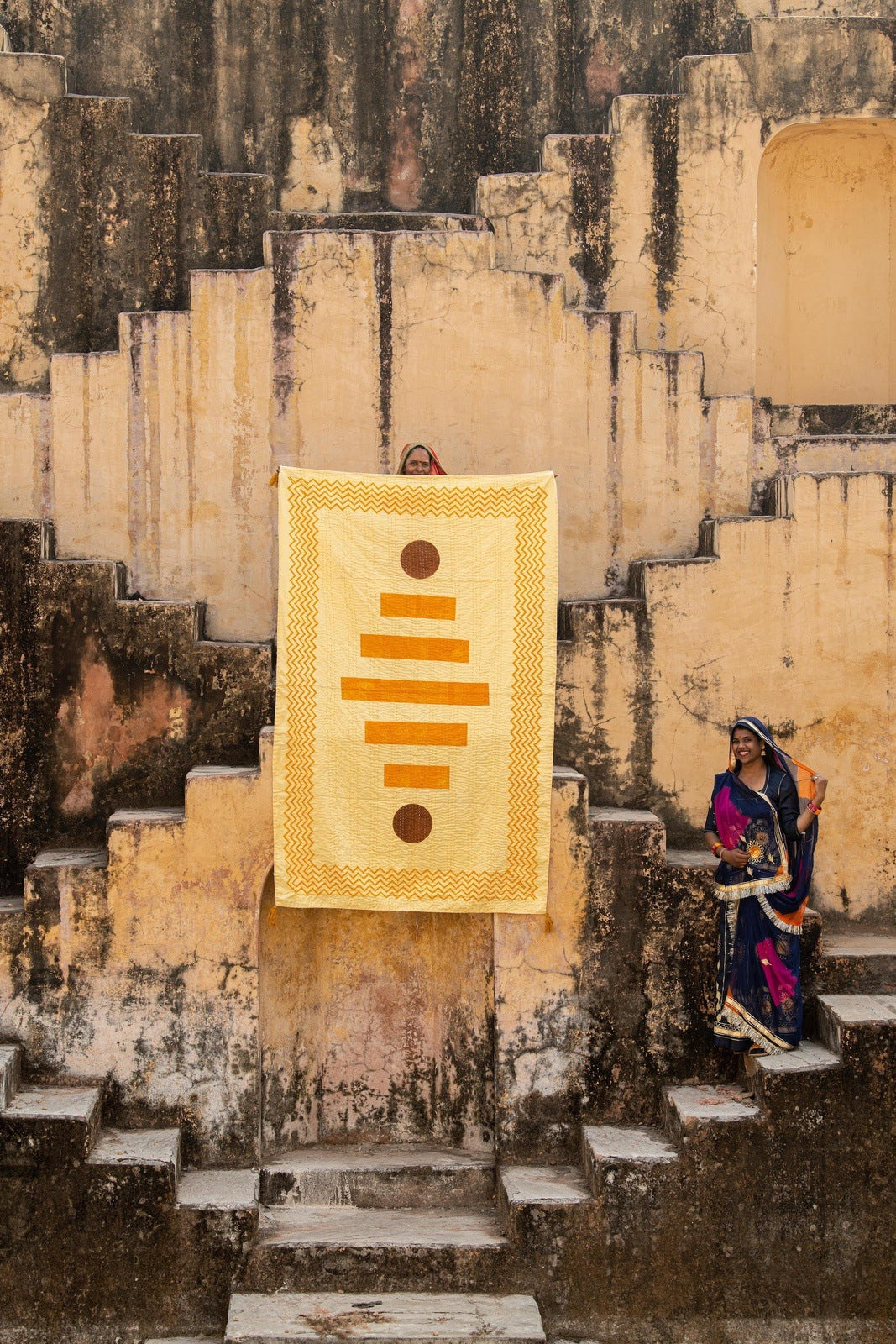 Each throw is handmade, requiring attention from 4 different types of artisans, including wood carvers, block printers, Kantha quiltmakers, and dye specialists. The design is hand-pressed onto pure cotton using hand-carved wooden blocks dipped in dyes. The printed cotton is brought to the homes of Kantha quiltmakers, who hand-stitch the cotton sheet onto a cotton base to create the final throw. Our cotton throws are made in small batches. Due to the handcrafted nature of this item, expect slight variations in the appearance of each unique piece. - 100% Cotton - Size: 54" x 84" - Made in India - Ships from California