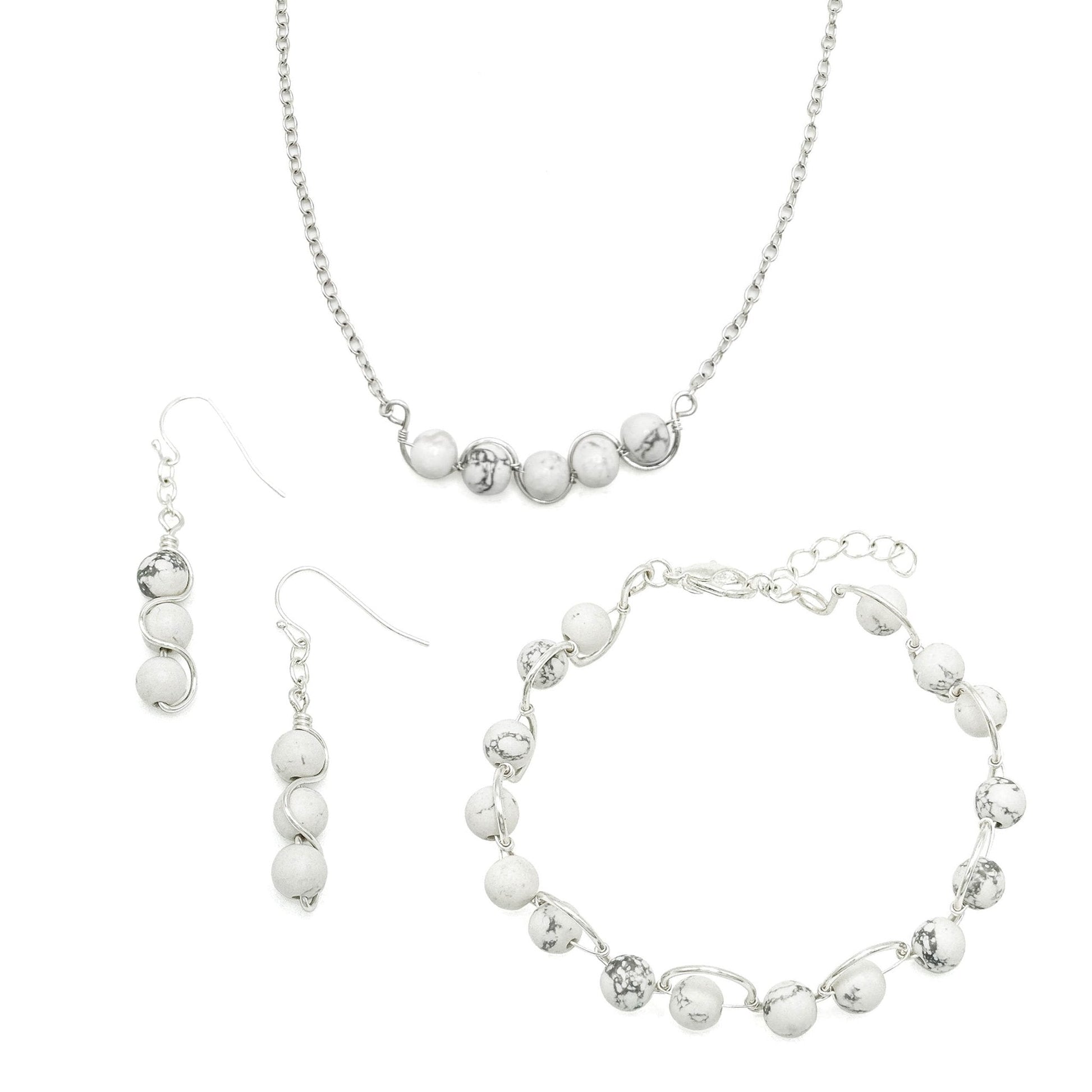 Elegant but simple earrings with a long silhouette. 3 6mm howlite stone beads are wrapped with a swoop of silver wire and dangling from a few links of silver plated cable chain and finished with easy to wear silver plated fishhooks.