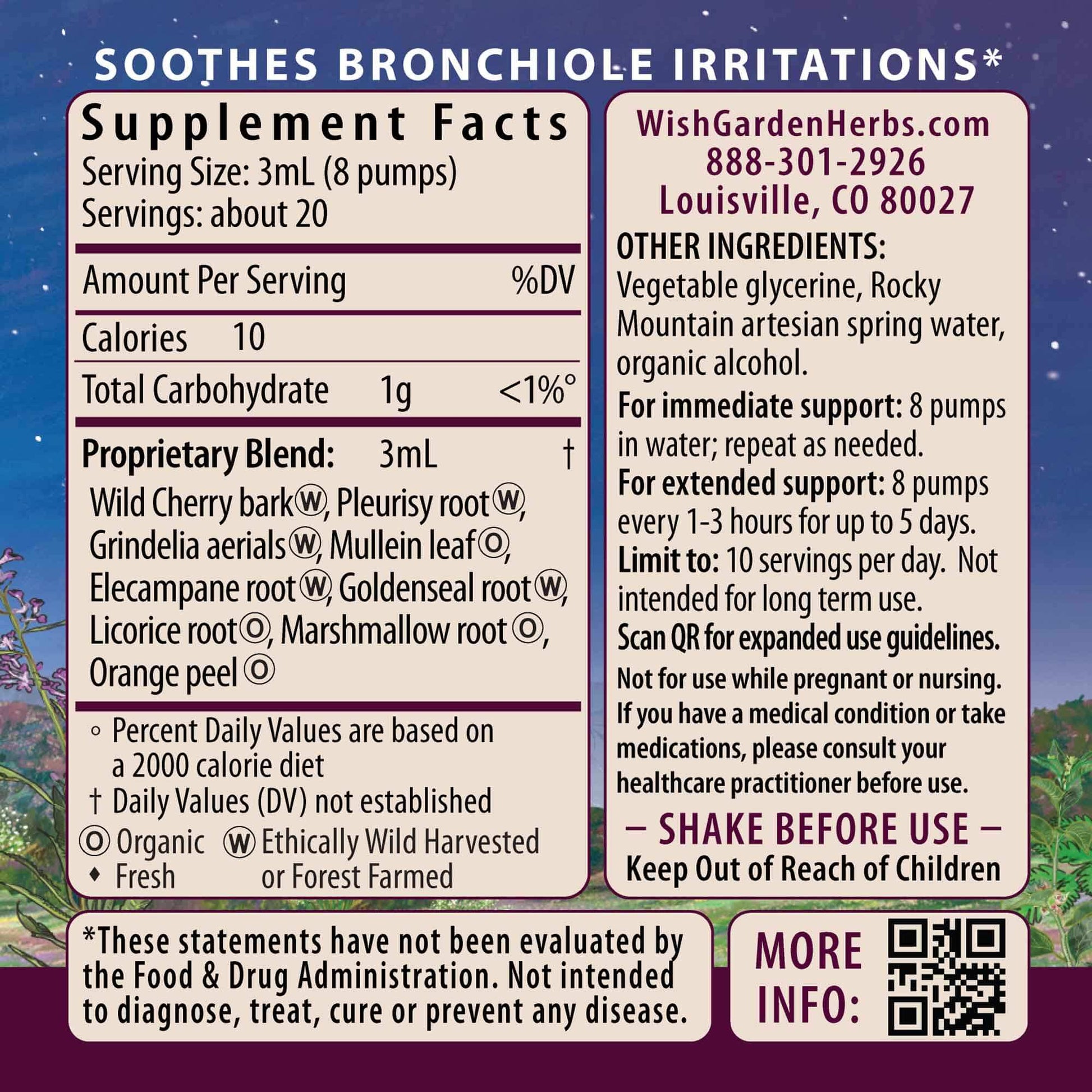 Wild Cherry bark (Prunus serotina), Pleurisy root (Asclepias tuberosa), Grindelia aerials (Grindelia robusta, G. squarrosa, G. camporum), organic Mullein leaf (Verbascum spp. (V. thapsus, V. densiflorum, V. sinuatum)), Elecampane root (Inula helenium), Goldenseal root (Hydrastis canadensis), organic Licorice root (Glycyrrhiza glabra), organic Marshmallow root (Althaea officinalis), organic Orange peel (Citrus sinensis), vegetable glycerine, Rocky Mountain artesian spring water & organic gluten-free alcohol.