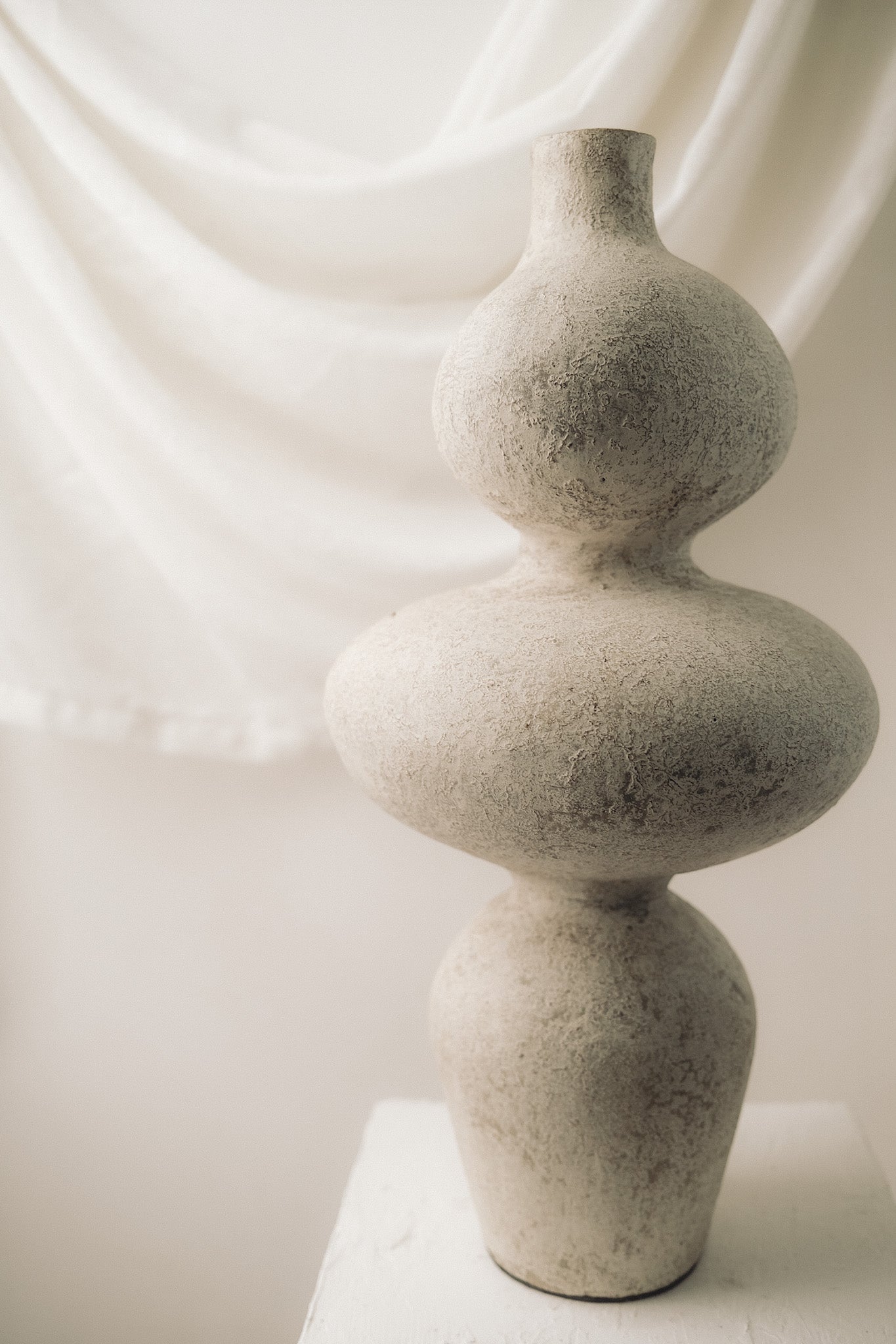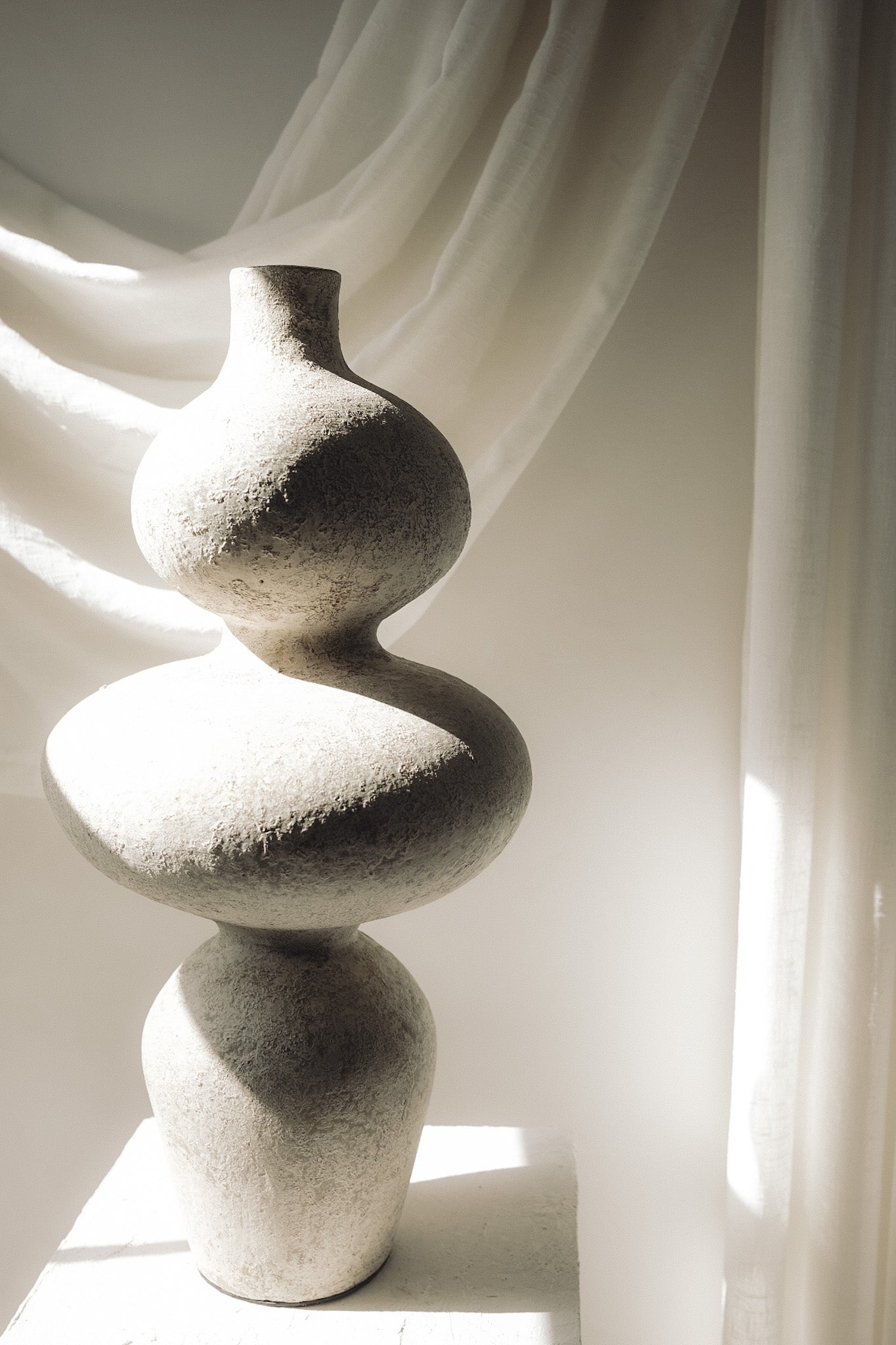 The Sewu vessel is a mesmerizing terracotta sculpture handmade by local Indonesian artisans. A more abstract take on sculptural shapes, this piece takes inspiration from the crown of the Sewu temple featuring curvaceous layers that taper along the middle and at the top. Its striking shape color and textured vintage finish adds to its unique features. Use it as an eye-catching decorative vase for florals or as a standalone decorative piece that adds vivid contrast to both traditional and contemporary spaces.