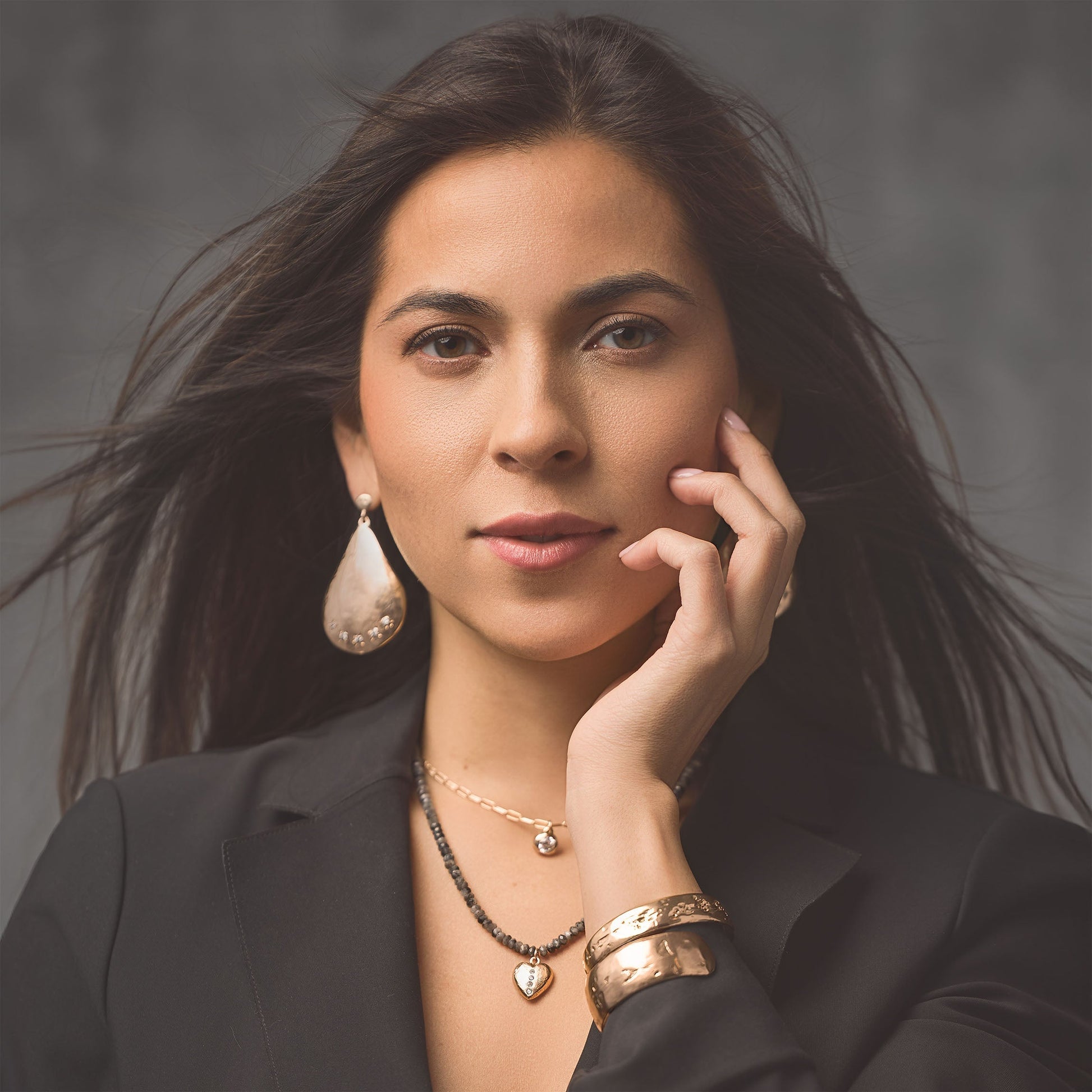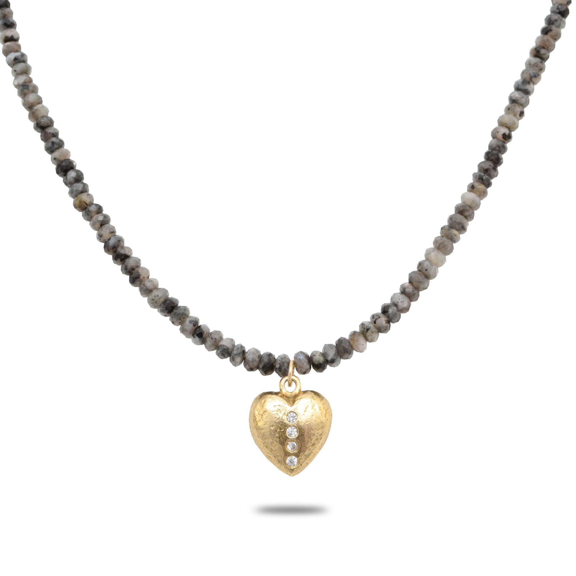 The Shining Love, Night Sky Bronze Necklace by Collection 1304 is a stunning blend of celestial charm and heartfelt elegance. Featuring faceted larvikite stones with their subtle gray tones and iridescent shimmer, this necklace evokes the mystique of a starlit sky. At its center is a handcrafted golden bronze heart pendant, adorned with four dazzling moissanite stones that add a radiant sparkle. Perfect for expressing love or adding a touch of sophistication to any outfit, this necklace is a timeless piece of wearable art. Proudly made in the USA, the Shining Love, Night Sky Bronze Necklace reflects the exceptional craftsmanship and beauty of Collection 1304.
