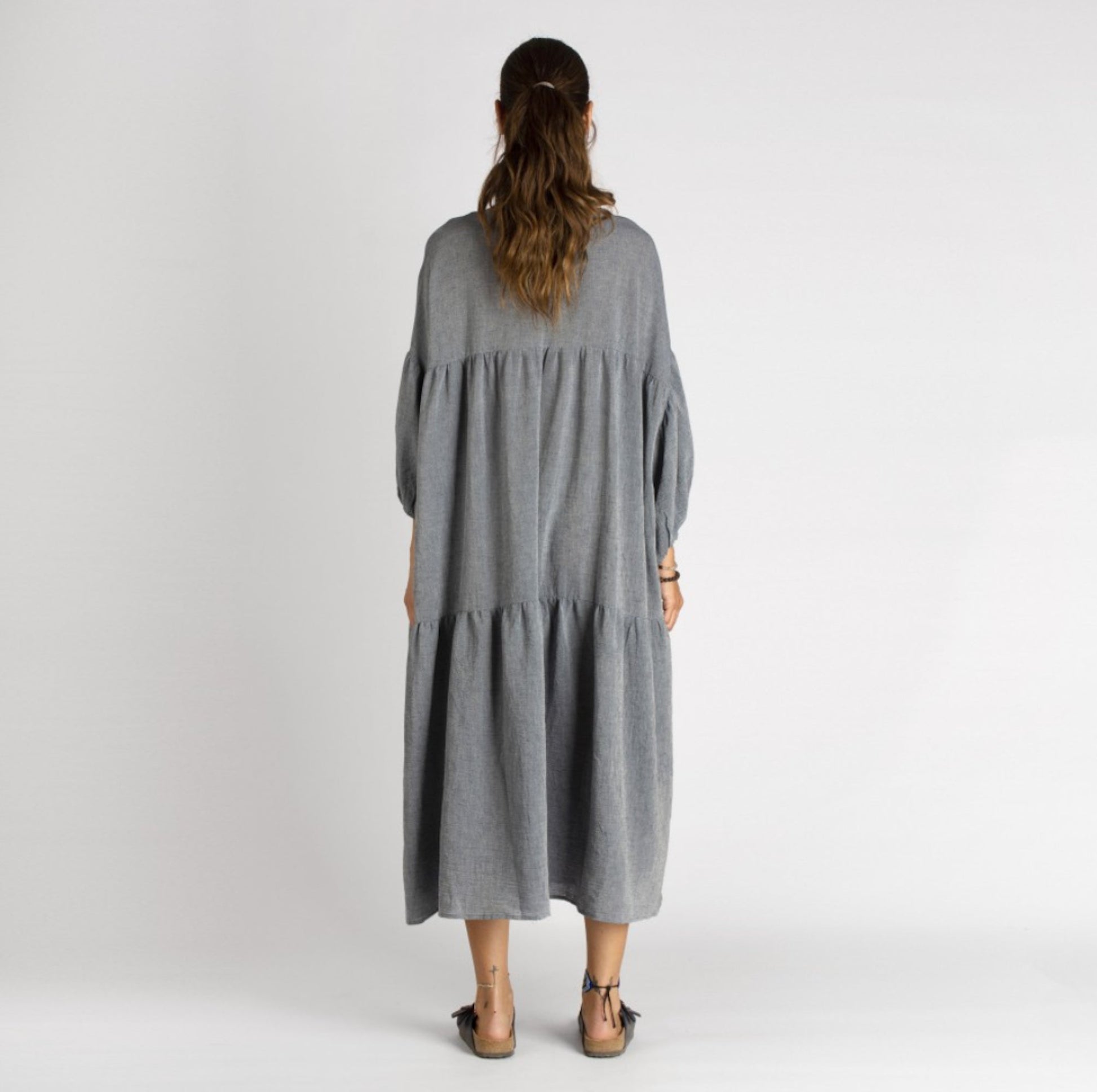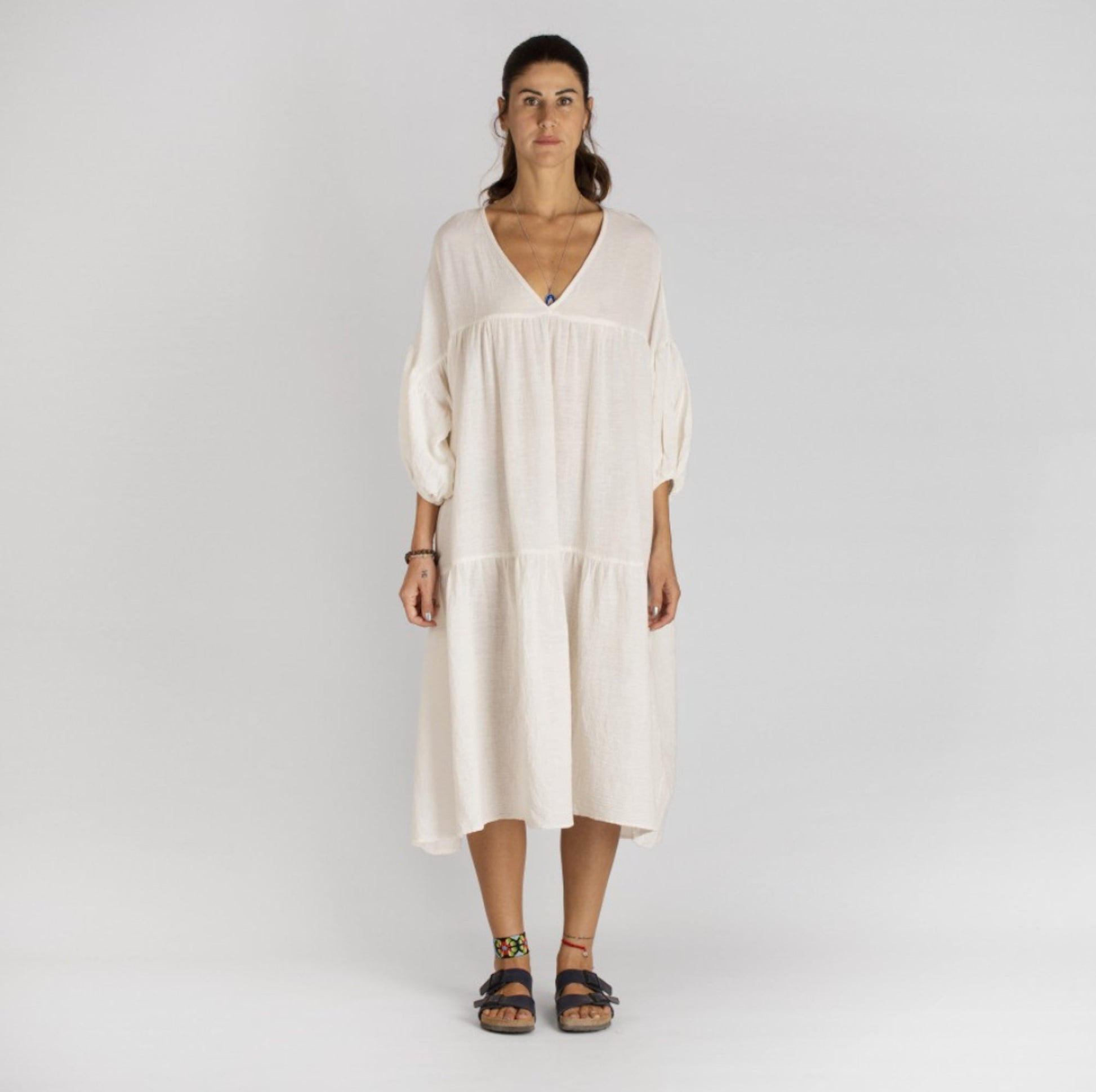 Discover the effortless sophistication of our generously oversized fully-pleated dress, destined to become your signature casual attire for the spring and summer seasons. This micro-pleated piece features a tiered skirt with a sweeping hem, a deep V-neckline, and 3/4 length cocoon sleeves with elastic cuffs, seamlessly blending comfort and sophistication. Hand loomed from organic cotton. One size fits all.