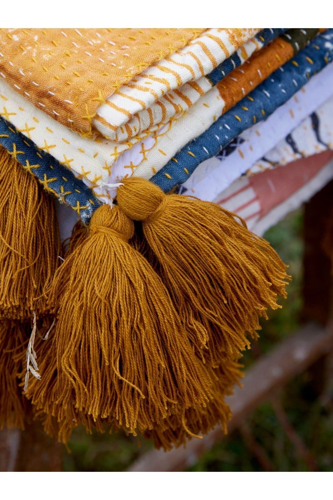 Each throw is handmade, requiring attention from 4 different types of artisans, including wood carvers, block printers, Kantha quiltmakers, and dye specialists. The design is hand-pressed onto pure linen using hand-carved wooden blocks dipped in dyes. The printed linen is brought to the homes of Kantha quiltmakers, who hand-stitch the linen or cotton sheet onto a cotton base to create the final throw. Our throws are made in small batches. Due to the handcrafted nature of this item, expect slight variations in the appearance of each unique piece. - Available in 100% linen and 100% cotton - Size: 54" x 84" - Made in India - Ships from California