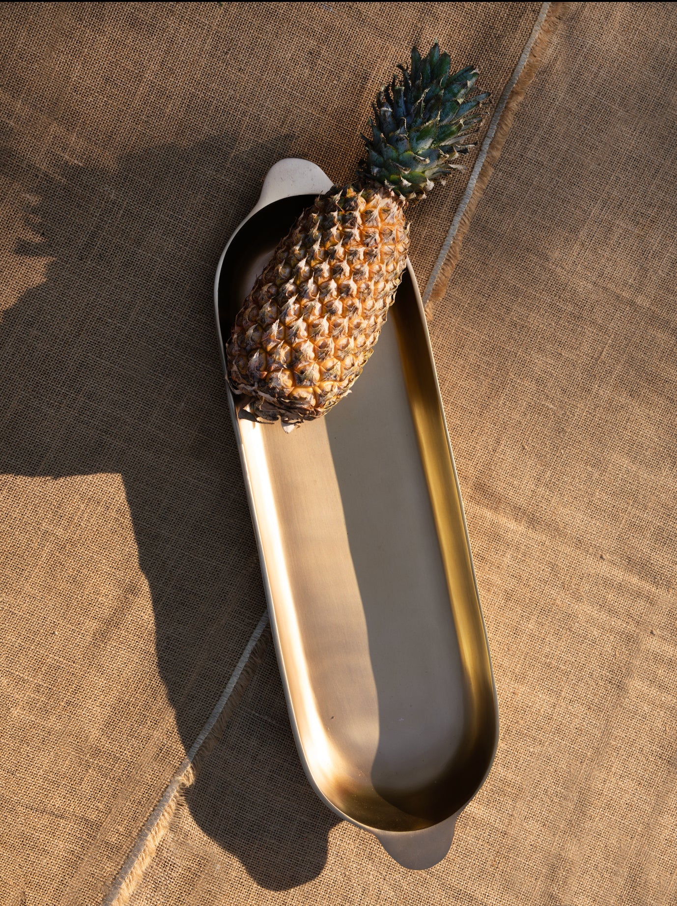 A contemporary oblong shape sets our Long Trays apart from other serveware options. Formed from lead-free cast aluminum, and finished with a food-safe antique brass finish these gently rounded pieces feature smooth, tab-style handles for easy transport. What better way to offer a sliced baguette, crudite or a cheese assortment than on these elegant ovals? Trays nest for storage.