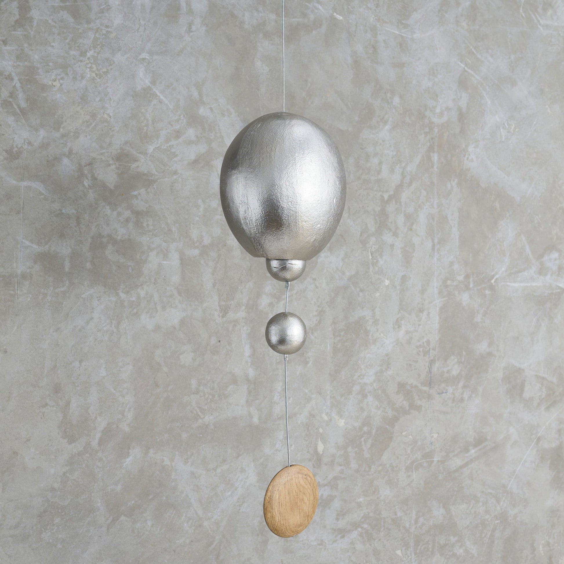 Substantial Cast aluminum bells feature a pair of metal spheres as clappers, and strung on a wire cord. This large, gently rounded metal bell features a disc-shaped oak sail to catch the breeze. Choose from the nickel or antique brass finishes.