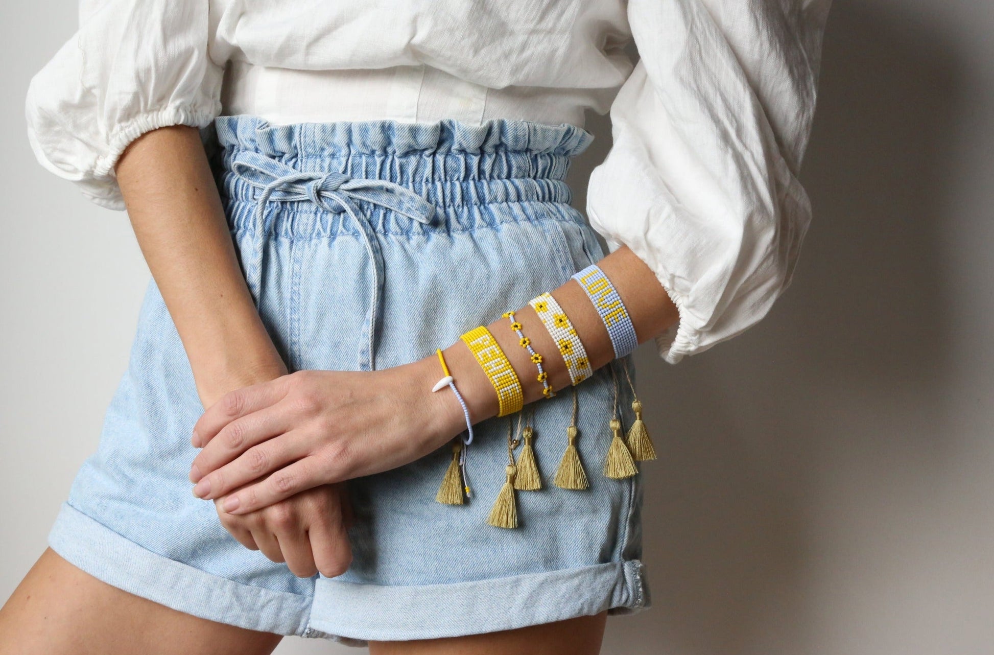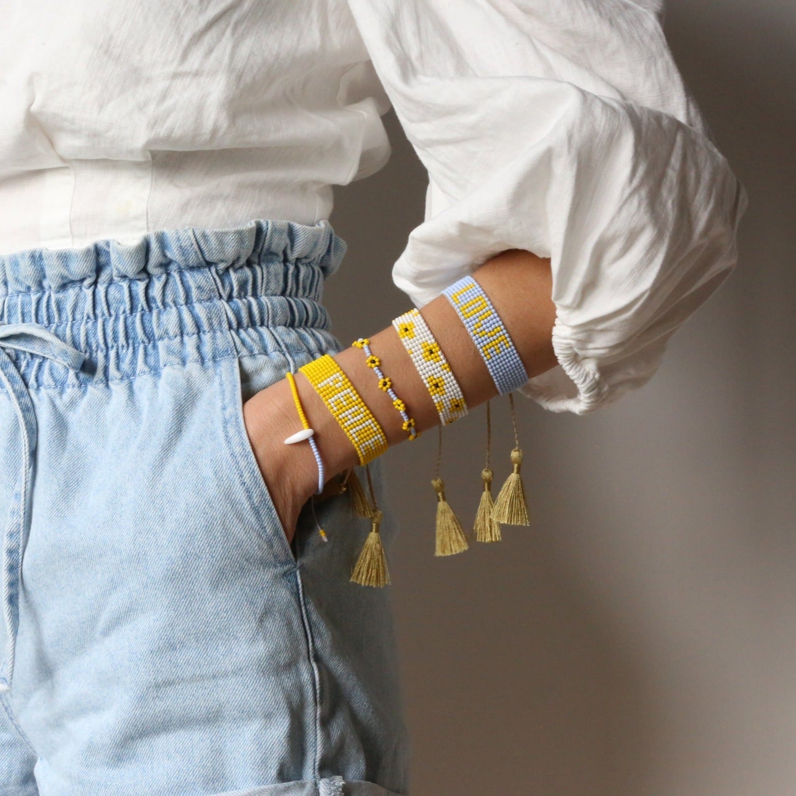 This Sunflower Bracelet in White Pearl + Yellow/Black beads was designed and ethically handcrafted in Medellin, Colombia in support of Ukraine, the home country of our founder's husband. A FOSTERIE exclusive small batch design featuring seed beads, and our signature tassels - these bracelets are comfortable, adjustable, and built for layering. Specifications: Adjustable closure - 5 to 9 inches SKU #B1040 50% of the proceeds of retail sales will be donated to help the people of Ukraine.