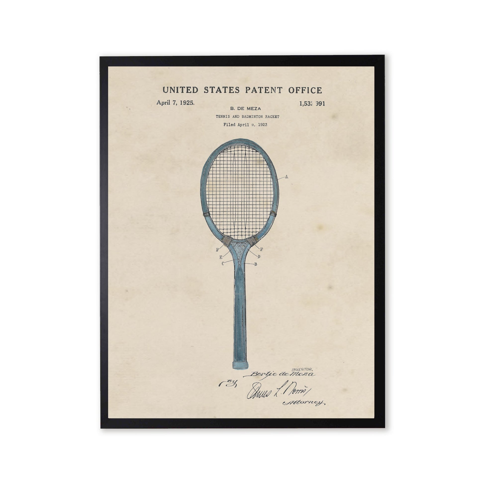 This vintage-inspired print, framed in a black wooden frame, features a tennis racket patent. Sized at 16 inches by 20 inches, this made in the USA frame makes for a beautiful addition to any wall.