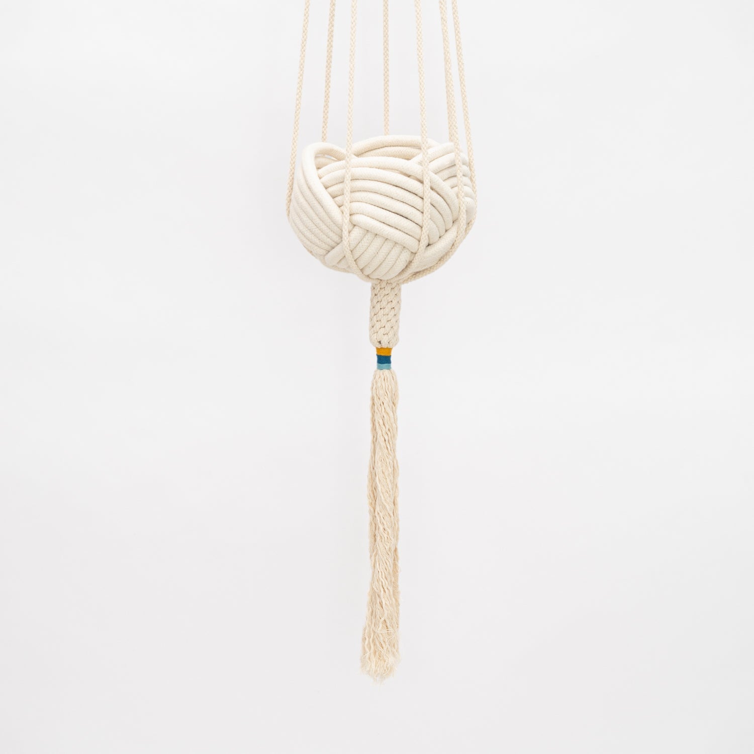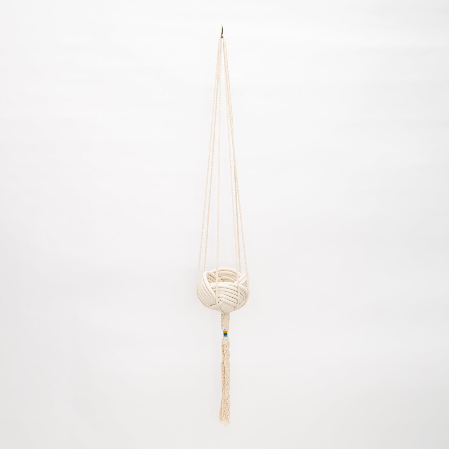 Decorate your home with this handmade, fair trade plant hanger as a symbol of dignity and strength! Hand knotted from cotton rope, this hanging planter is super-versatile and will hold virtually any size potted plant. This handcrafted piece looks great in your living room or office, or even a covered patio or terrace. Materials: Soft cotton rope and acrylic thread Size: 45.9" in length from metal ring to fringe tassel, the knot measures approximately 3" in length Available in 2 unique colorways to suit your home décor.