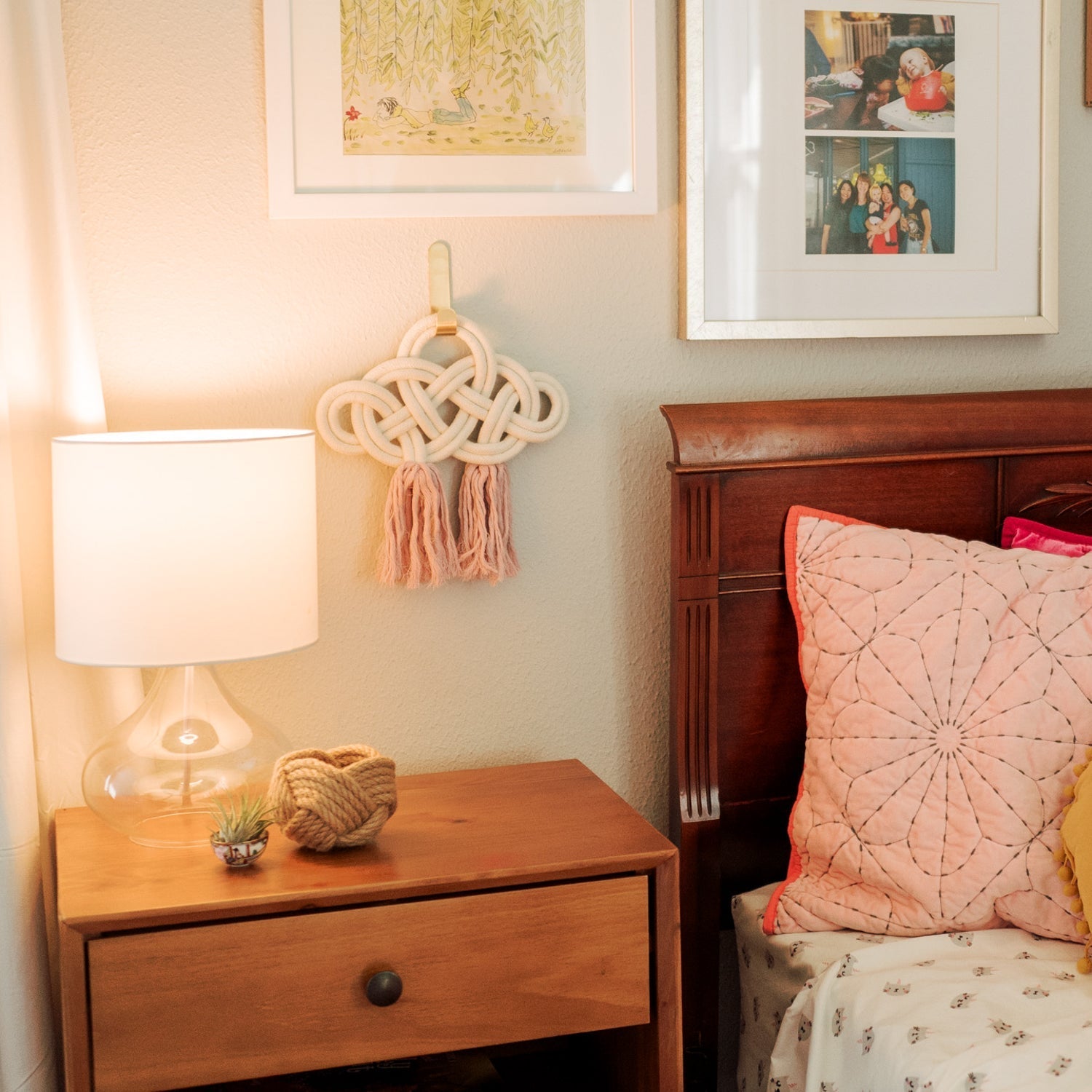 The fair trade Infinity Knot Wall Hanging features a beautifully unique knot handmade from cream colored cotton rope. It is a stunning addition to any hallway, dining room, or gallery wall display. The colorful cotton tassels add a bit of fun to this elegant handcrafted piece. The size is perfect for a small space like a powder room, reading nook, or nursery. Material: Cotton Rope Size: The knot measures 10" x 6", The tassels measure 4.5" long
