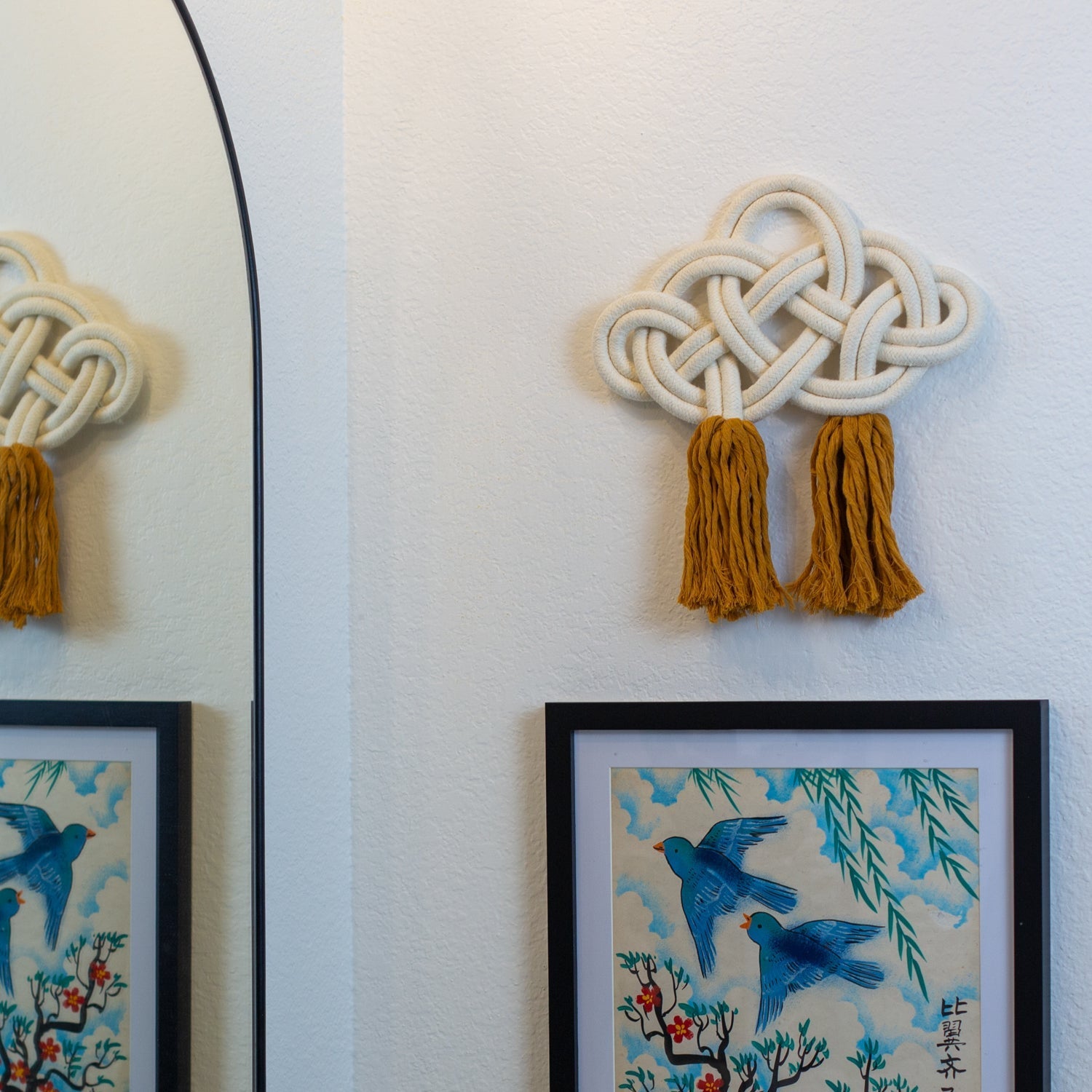 The fair trade Infinity Knot Wall Hanging features a beautifully unique knot handmade from cream colored cotton rope. It is a stunning addition to any hallway, dining room, or gallery wall display. The colorful cotton tassels add a bit of fun to this elegant handcrafted piece. The size is perfect for a small space like a powder room, reading nook, or nursery. Material: Cotton Rope Size: The knot measures 10" x 6", The tassels measure 4.5" long