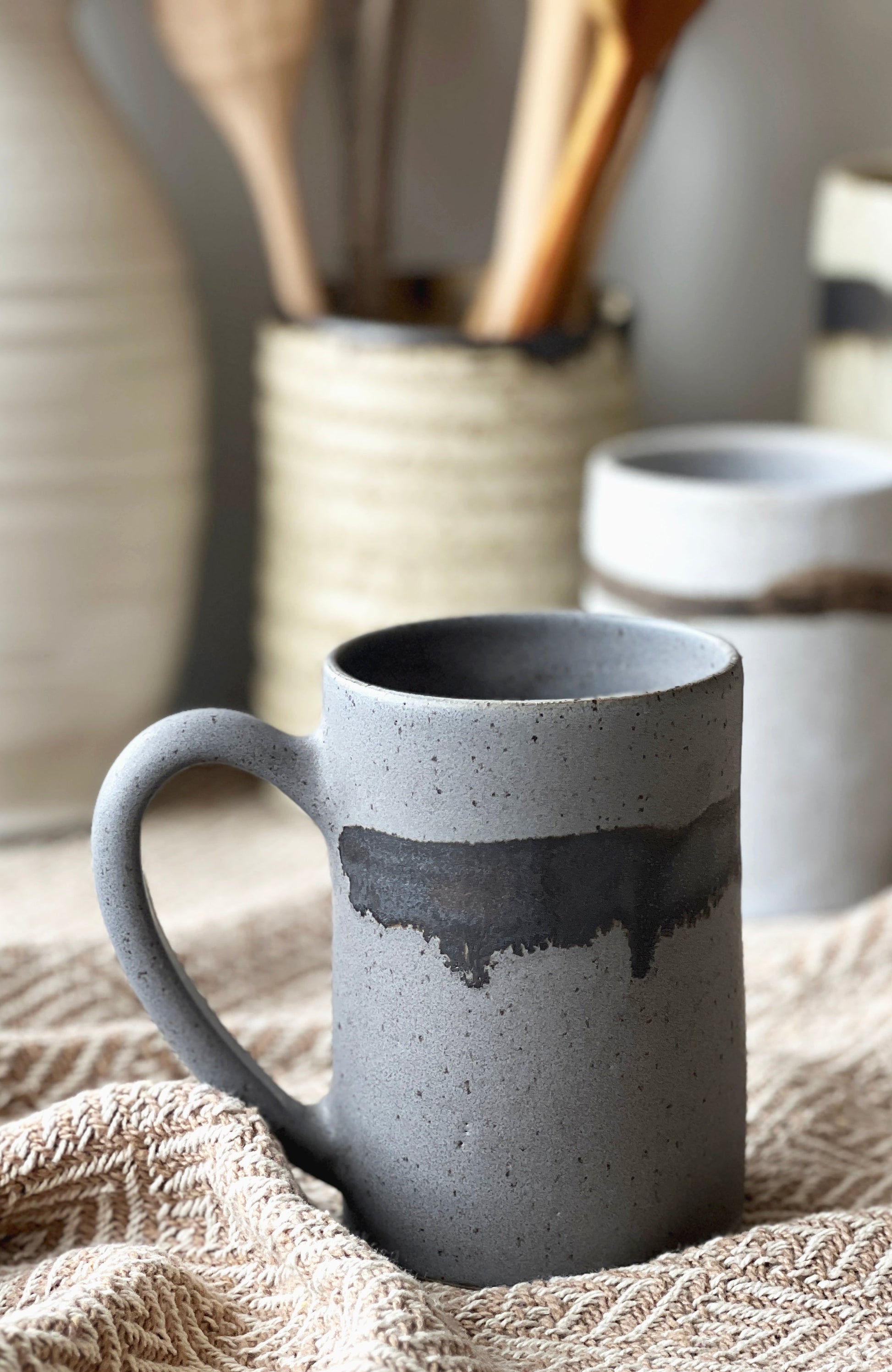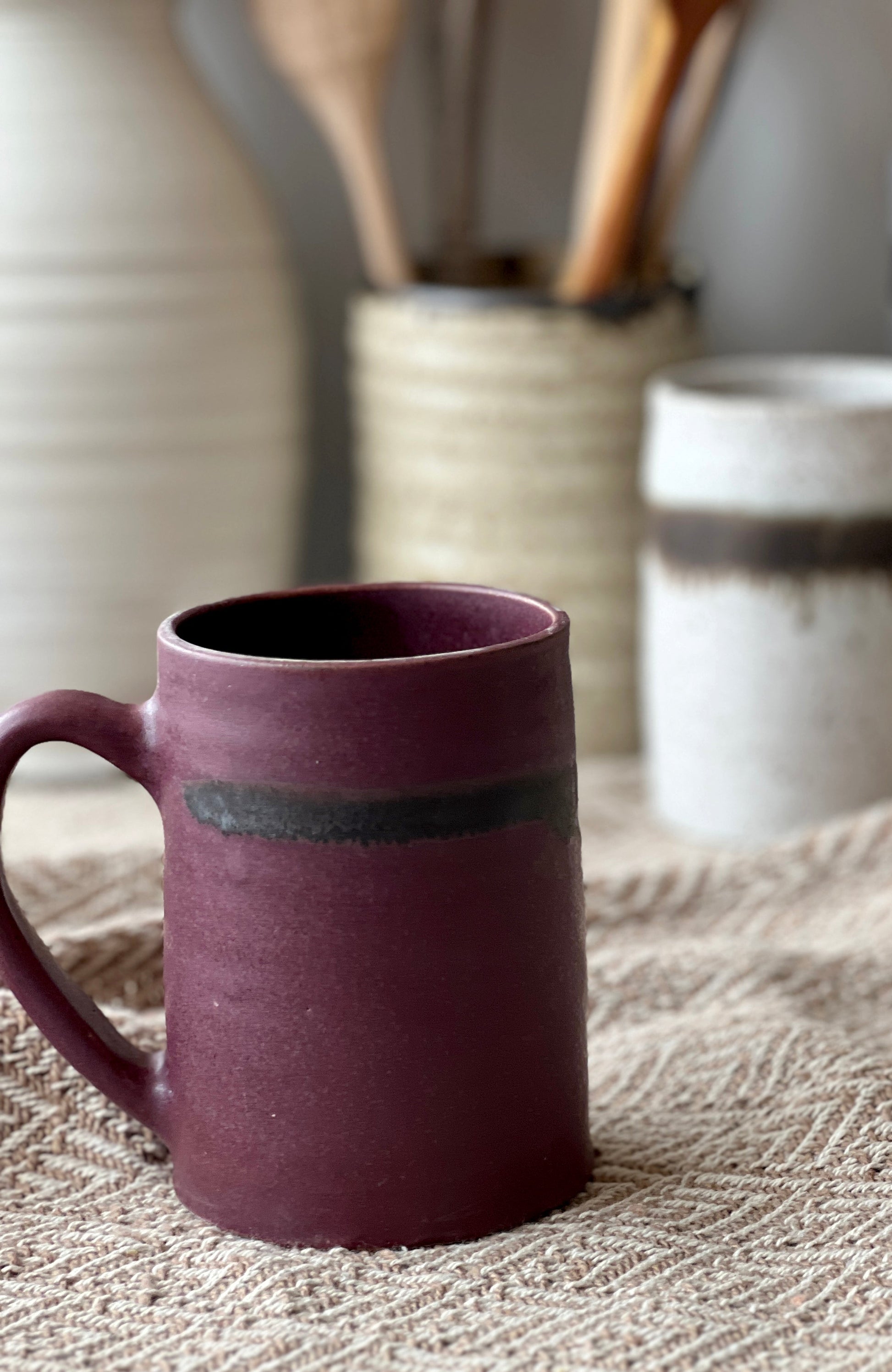 Each mug is handcrafted on the potter’s wheel. The Luna Collection is made with a brown stoneware clay and then glazed in a satin glaze with bronze accents. The collection is rustic and refined. This mug is approximately 4.5 inches tall by 3 inches wide. It holds around 16 ounces of your favorite warm beverage. The Luna Collection features five color options: Sand: A warm beige Mist: The palest of pinks Shale: A cool gray Lavender: A very matte lavender Luxardo: a satin cherry red Microwave and dishwasher safe however hand washing prolongs the life of your handmade goods. *All of my products are made by hand and will vary. Each glaze firing varies as well. Please keep this and my refund policy in mind when you place your order. Thank you.