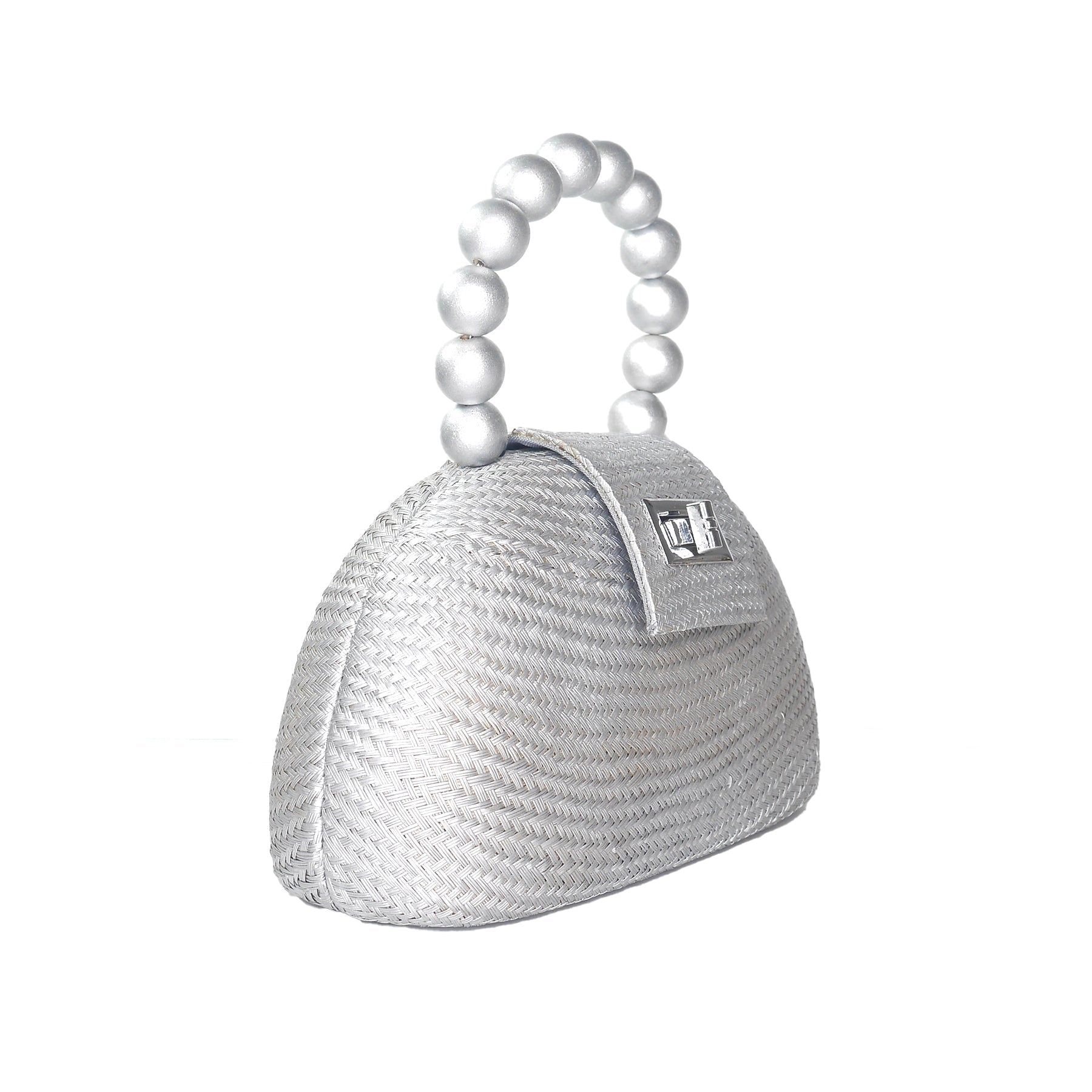 THE ORLA Silver Woven Straw & Wooden Bead Statement Clutch Bag