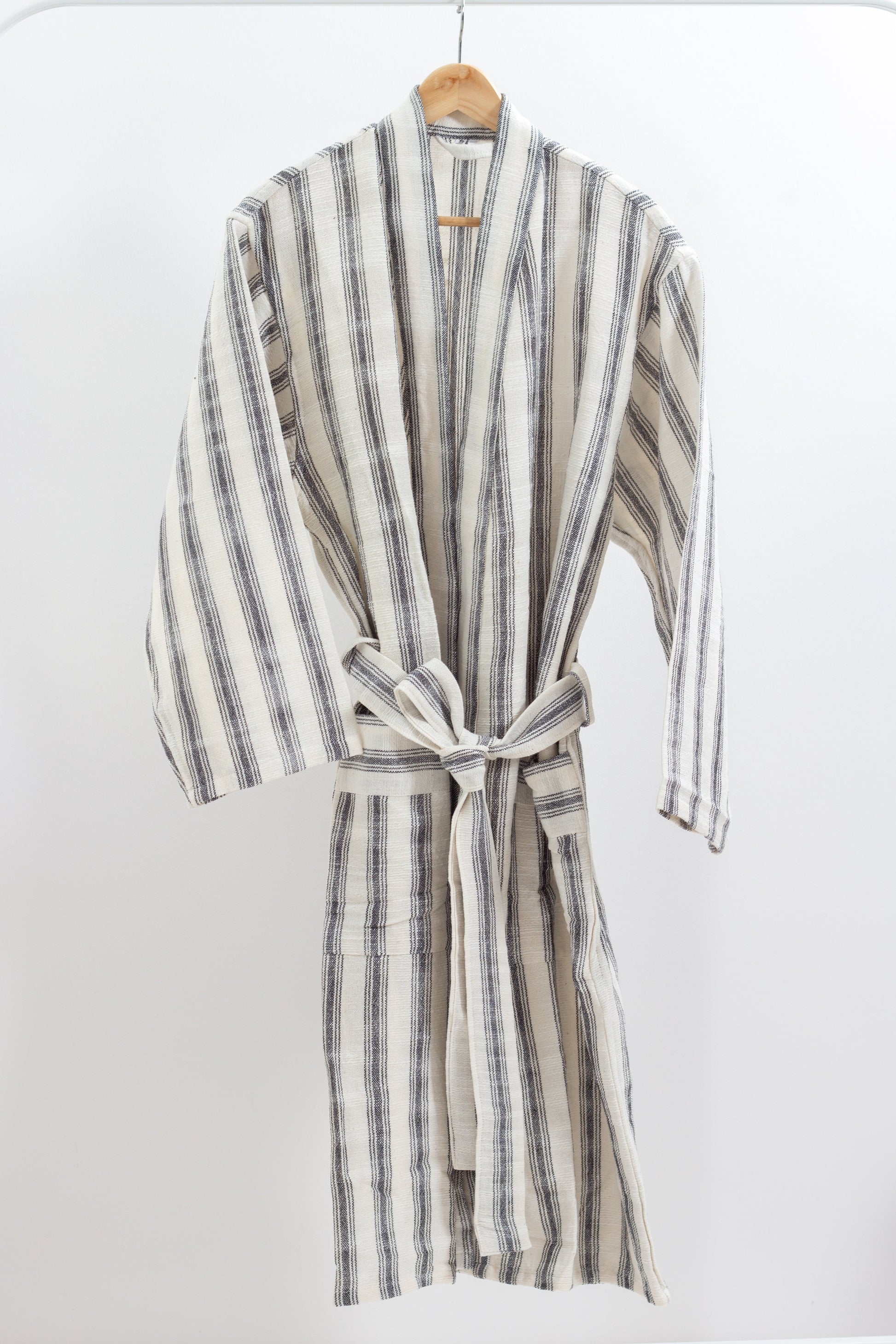 Introducing the Titus Robe, a luxurious and stylish addition to any wardrobe. Made from a soft and breathable linen cotton blend, this robe features bold beige and black stripes that create a modern, minimalist look. The relaxed fit and dropped shoulders make it perfect for lounging at home, while the full-length sleeves and ankle-length hem provide coverage and warmth. With its multi-use functionality and aesthetic design, the Titus Robe can also be used as a cover-up at the beach, a dressing gown, or even as a lightweight summer coat. Treat yourself to the ultimate in comfort and style with the Titus Robe.
