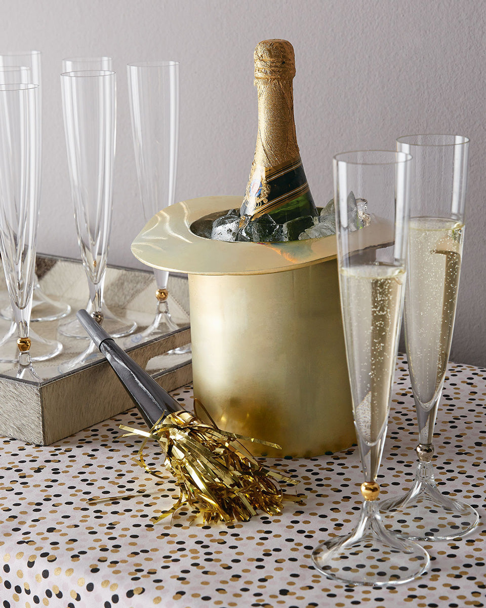 The OBJECTS COLLECTION is a group of unique pieces. Whether childlike and humorous, or deep and symbolic, each conveys a message. They make perfect gifts. The moment you see one you know who its for. The Top Hat Champagne bucket is for the Mr. Monopoly in your life! Charming and whimsical yet elegant, the top hat wine cooler is the perfect accessory for a well appointed bar. Each of our creations is designed in our San Francisco studio. Master craftsmen using centuries old technique of sand casting create the original mould and skilled artisans hand create every piece, with pride, in our family owned factory. Details Dimensions : 7" H; 10" L; 9.75" W Finish : Gold Material : Aluminum Use and Care Given its handmade and hand-finished nature, variations in the piece are to be expected and celebrated. No two pieces are exactly alike. Food Safe Hand wash with mild soap, water, and towel dry. Do not use abrasives or chemicals to clean as the metal may scratch and discolor. Not dishwasher safe