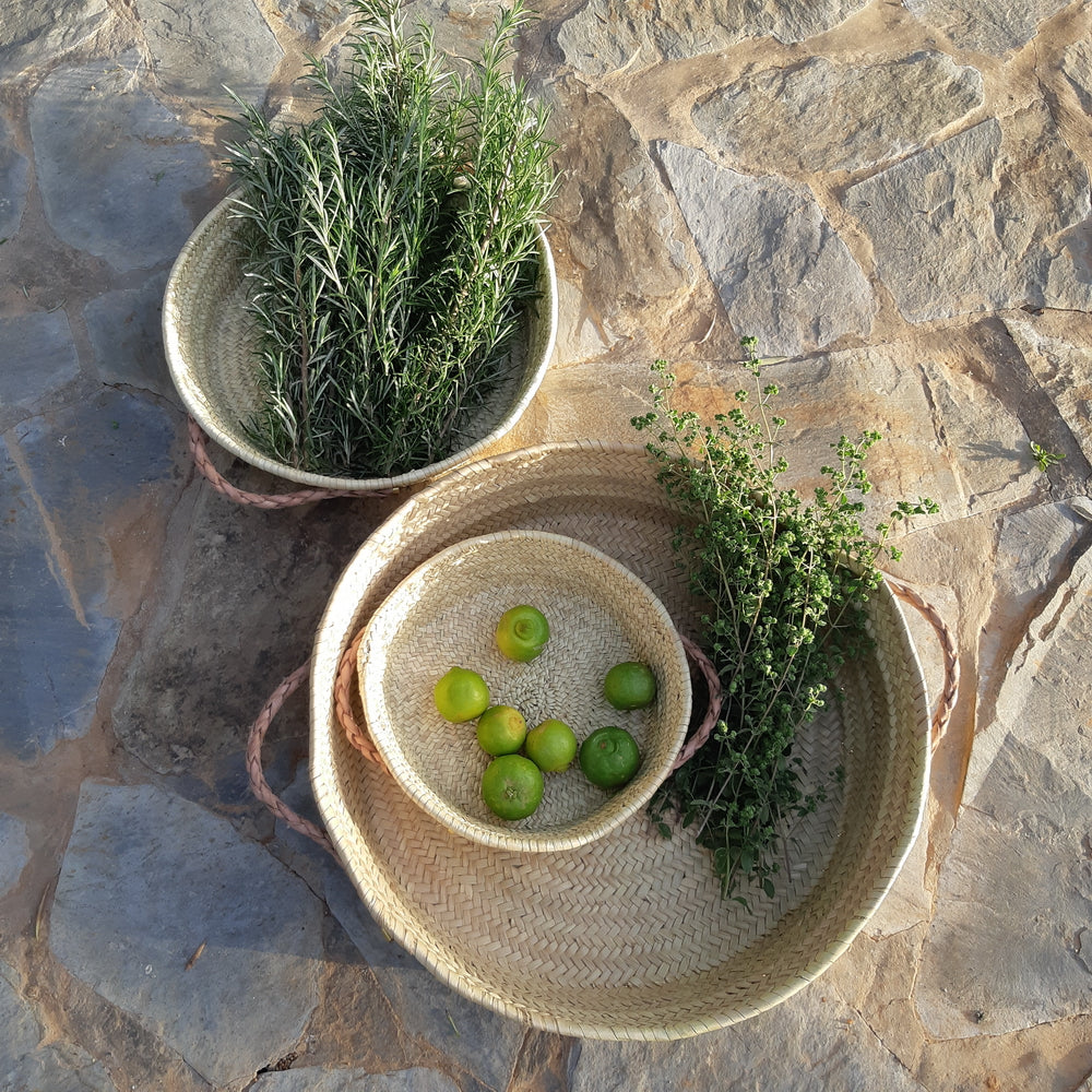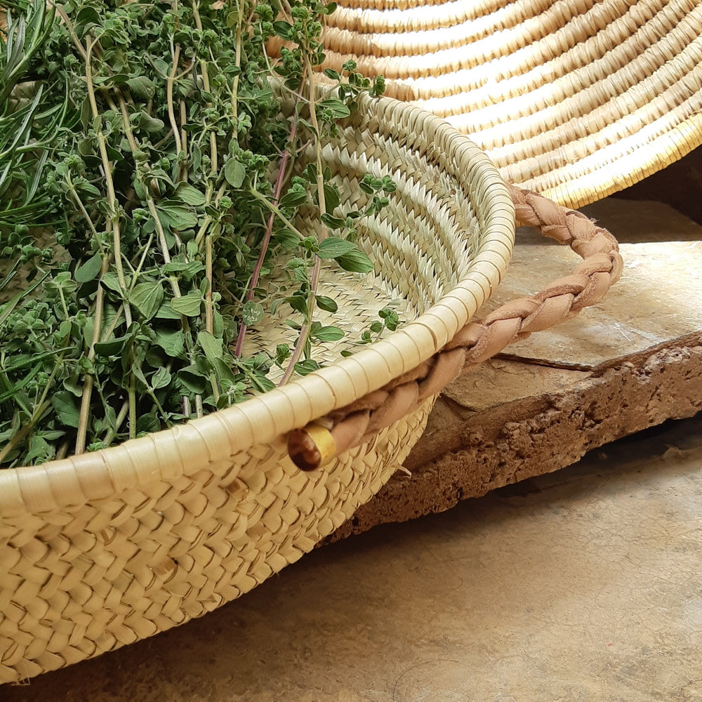 These beautiful woven trays are made of palm fibre with fine leather handles to bring a warm atmosphere to your home. They can be used as decoration and to keep your things in order. They are handmade in Marrakech, Morocco by a women's cooperative.