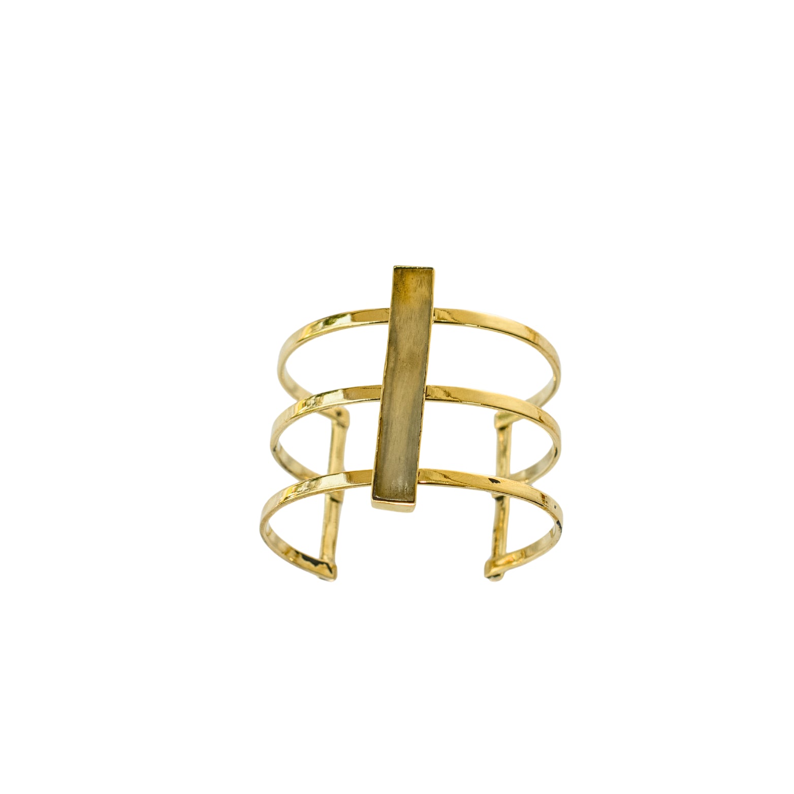 Blends modern design with natural elements, featuring three sleek brass bars and a polished bone centerpiece on the middle cross bar. A perfect mix of edgy and earthy for standout style.