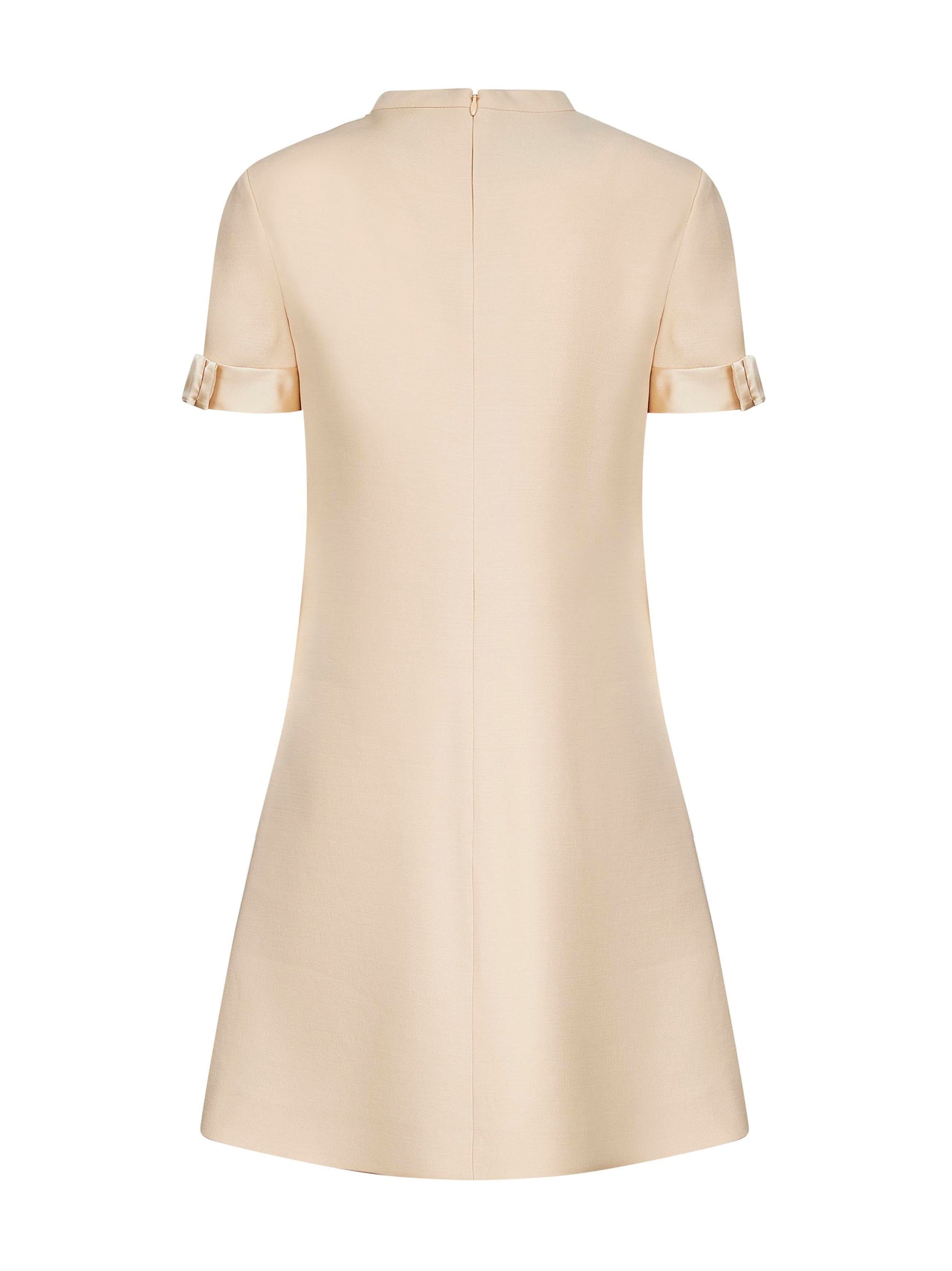 •Invisible back zip closure •High crewneck •Short sleeves with tone-on-tone satin bows detail •Front patch pockets with tone-on-tone satin bows detail •Silk habotai lining •Length 90 cm (from the shoulder for size IT 40) •Flared fit •Beige color •65% Virgin Wool, 35% Silk •Made in Italy