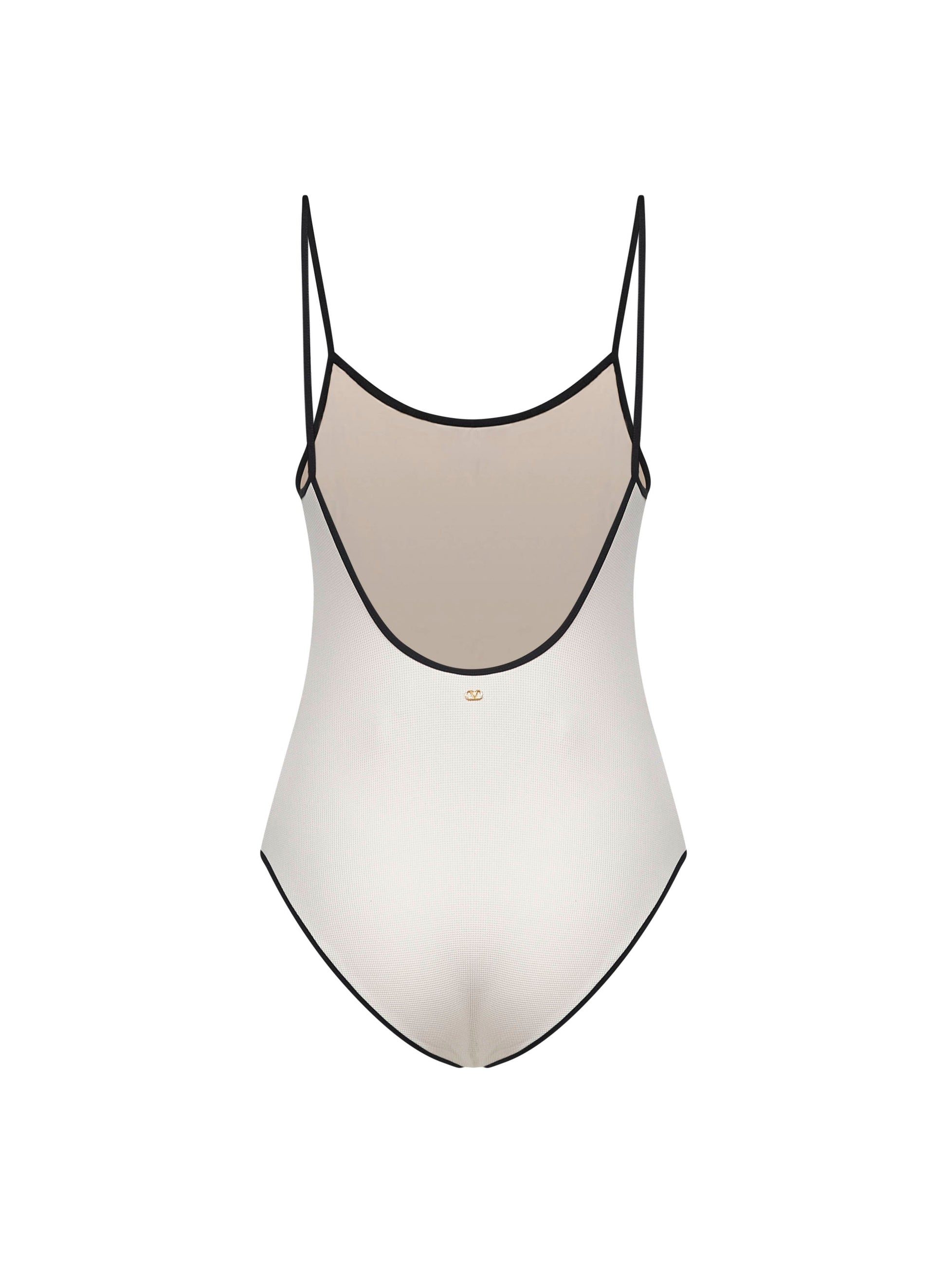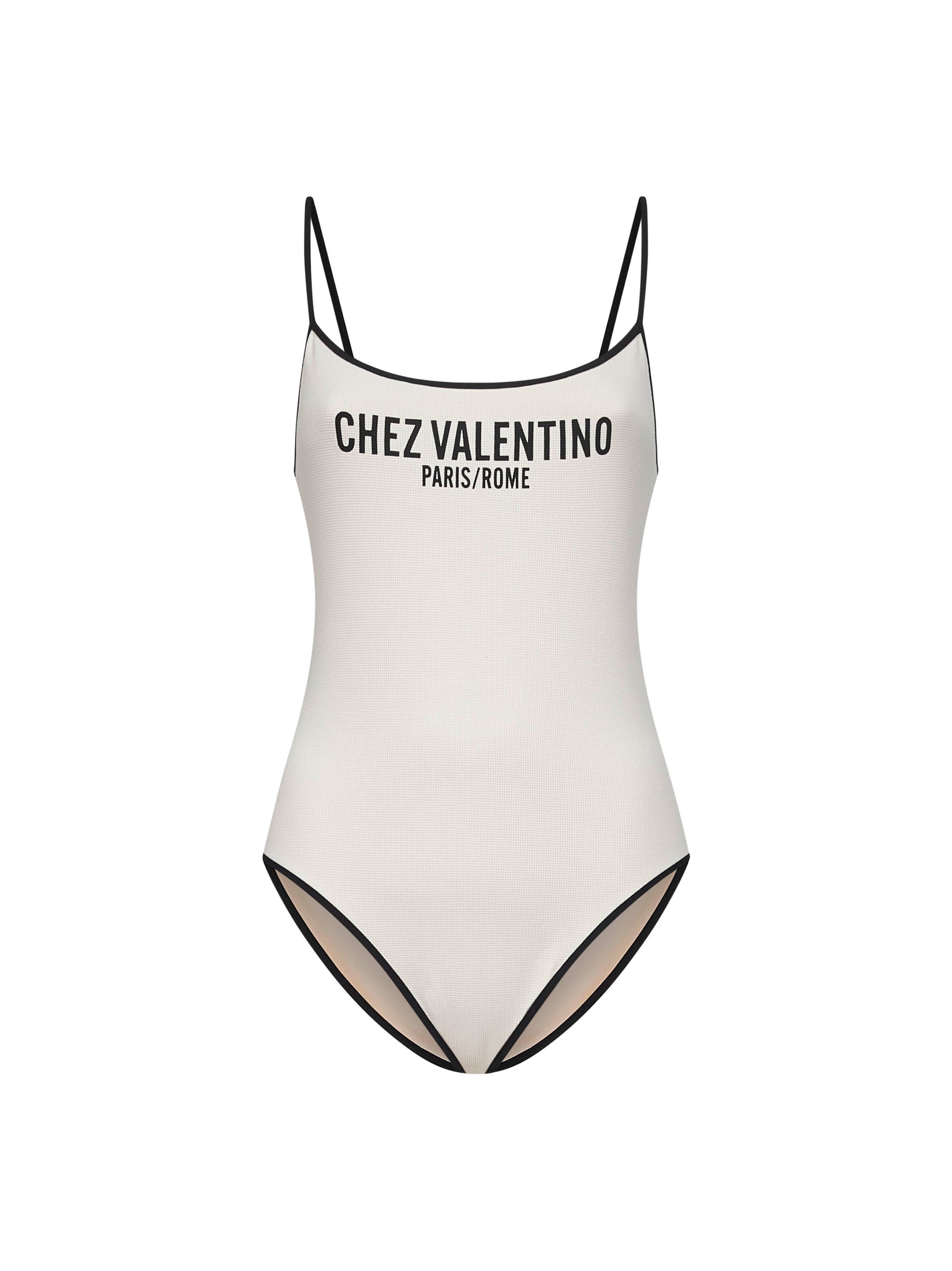 •Round neckline, low back •Contrasting thin shoulder straps •Contrasting Chez Valentino print at front •Gold-toned metal VLogo detail at back •Contrasting edges •Lined •Lycra Piquet design •Pink color •87% Polyamide, 13% Elastane •Made in Italy