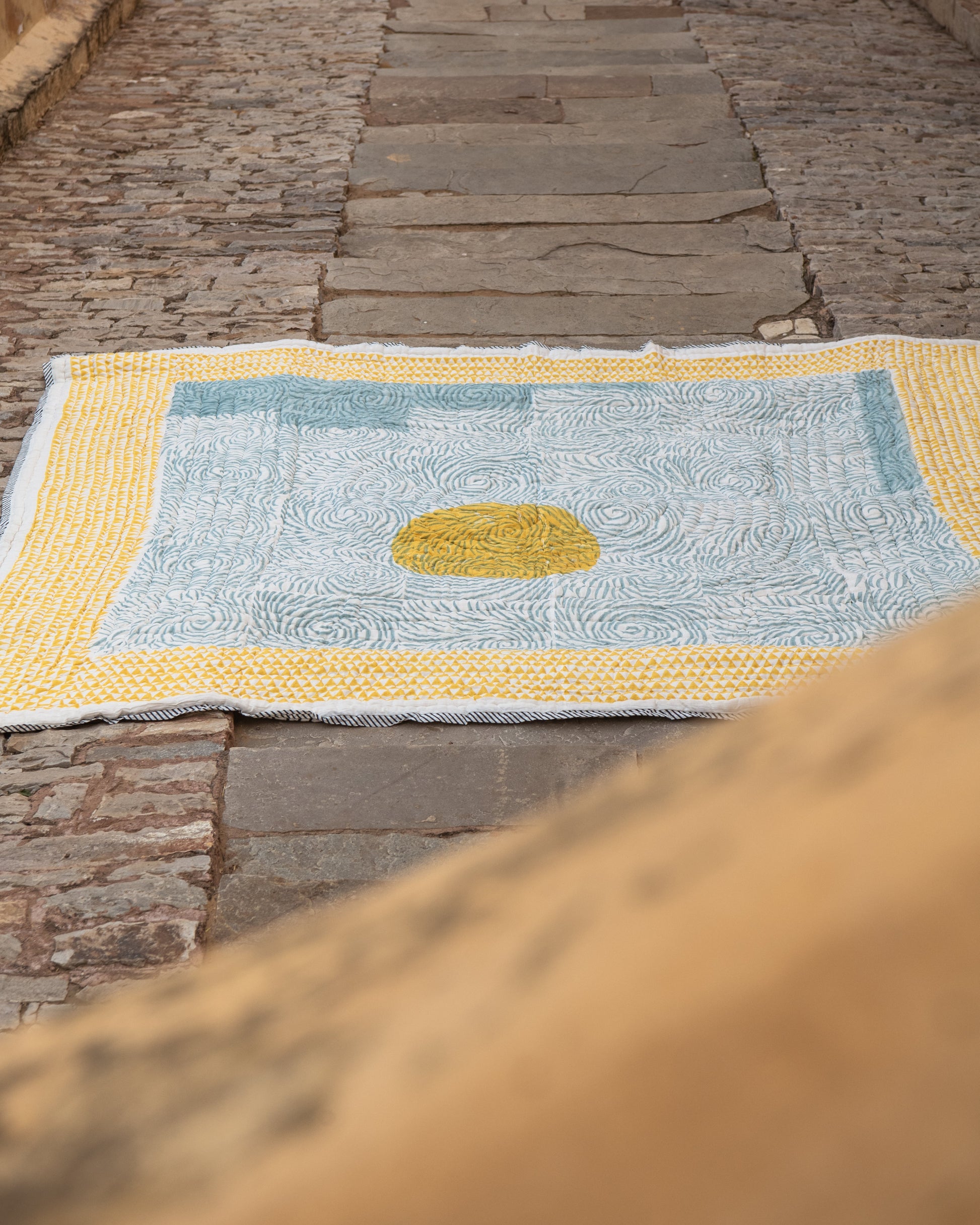 This reversible, hand-printed quilt offers two designs: a bright sun motif on one side and a Van Gogh-inspired starry night on the other. Switch between them for a quick room refresh. Whether it's morning or evening, you've got a design that fits. Each quilt is handmade from 100% cotton and requires attention from four artisans, including wood carvers, block printers, quiltmakers, and dye specialists. The design is hand-pressed onto each quilt using hand-carved wooden blocks dipped in dyes. The printed cotton shells are brought to the homes of quiltmakers, who stuff and stitch the quilts by hand, creating the final product. CQC LA quilts are made in small batches. Due to the handcrafted nature of this item, expect slight variations in the appearance of each unique piece. - 100% cotton voile exterior - 100% cotton stuffing - Made in India - Ships from California - Twin size: 68″ x 86″ - Queen size: 96″ x 96″ - King size: 108″ x 108″ - Sham size: 26″ x 26″