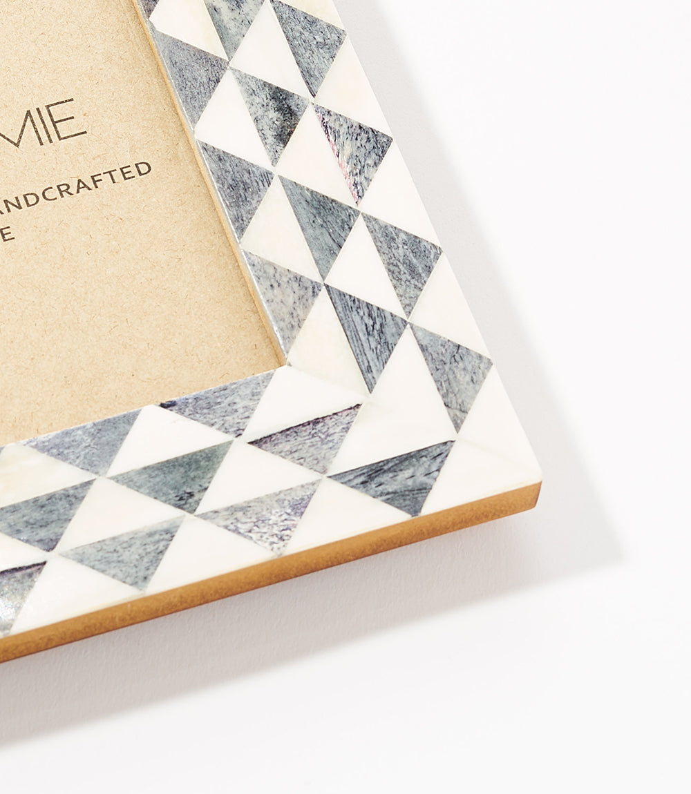 Our Varuna Collection incorporates traditional Indian art forms in modern, sea-inspired designs handcrafted from ethically sourced bone tile. Master artisans in Old Delhi skillfully assemble elements to create unique, eye-catching mosaic designs. This handcrafted photo frame is thoughtfully designed for stylish display of a 5x7 photo or print. The picture frame features a two-way table top easel and d-rings for hanging.