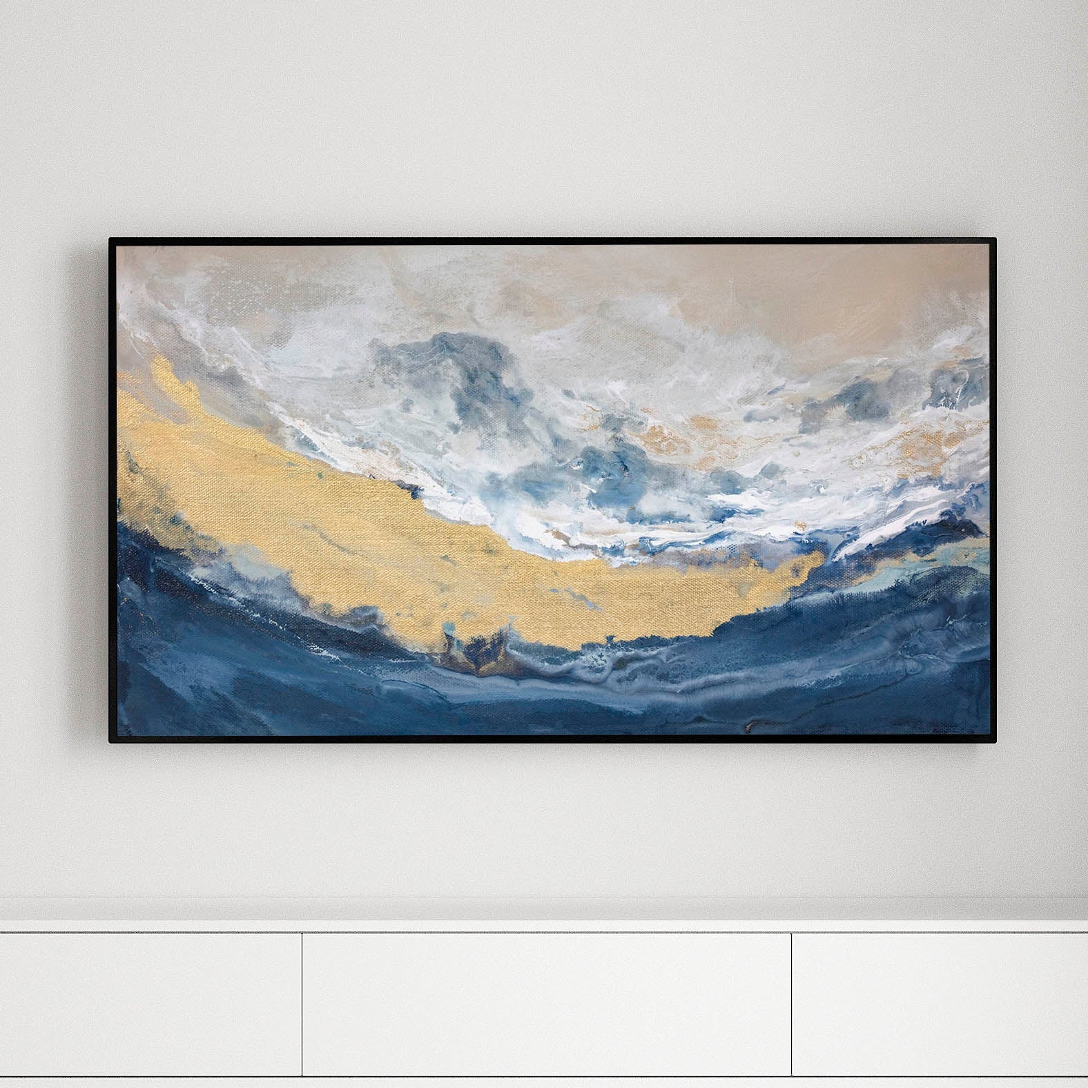 Immerse yourself in the quiet majesty of the coast with artwork that channels the expansive beauty of sea and sky. Soft layers of misty blue, sand-washed beige, and luminous gold seem to ebb and flow across the composition, evoking the peaceful rhythm of the shoreline.